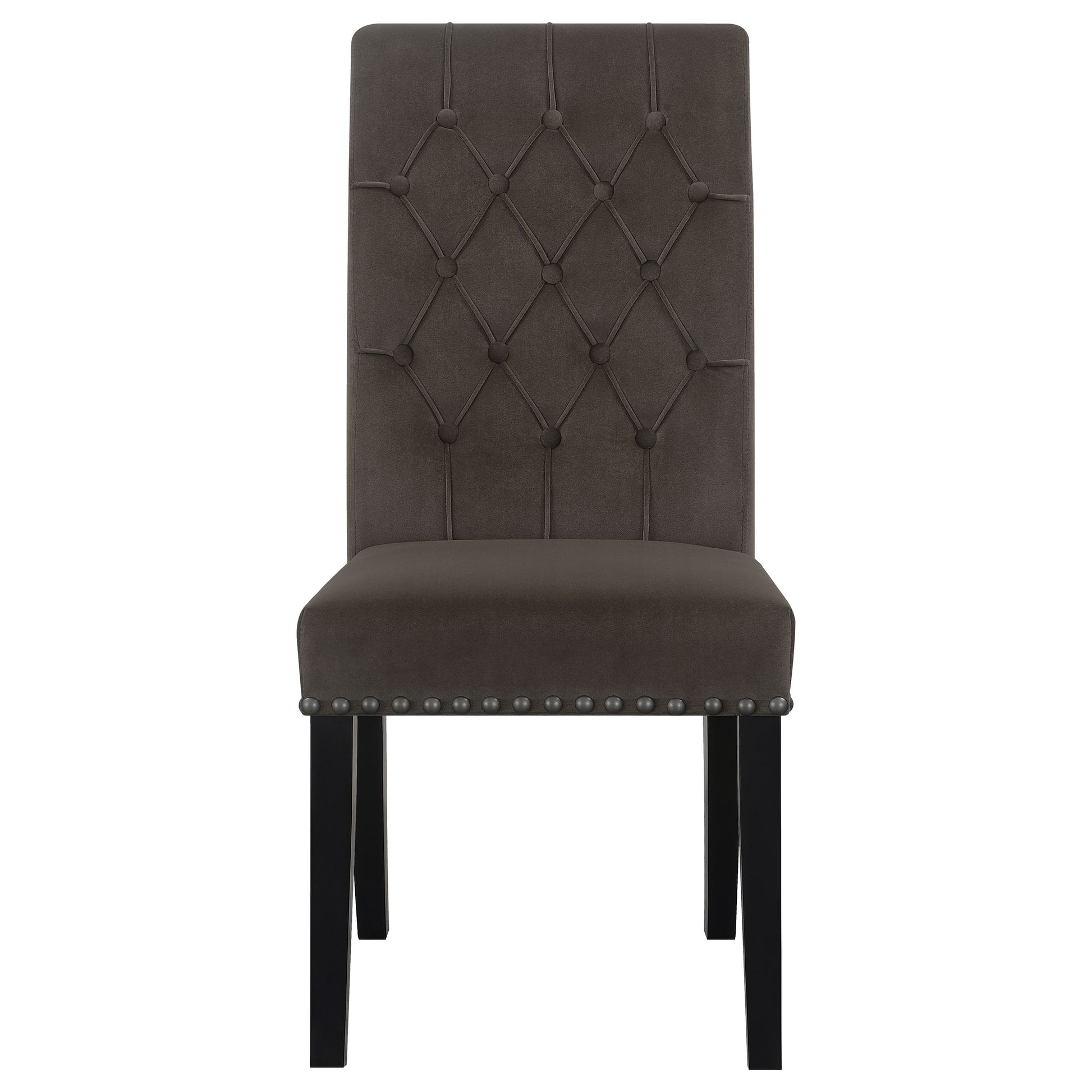 Blending timeless elegance with plush comfort, this side chair enhances any dining space. Its high backrest features a classic button-tufted design, adding depth and sophistication. A rolled top and hand-applied nailhead trim create refined detailing, while the generously padded seat ensures lasting comfort. Supported by sturdy, tapered legs, this chair is built for both beauty and durability. Whether part of a formal setting or an inviting everyday dining space, it brings grace and charm to the table.