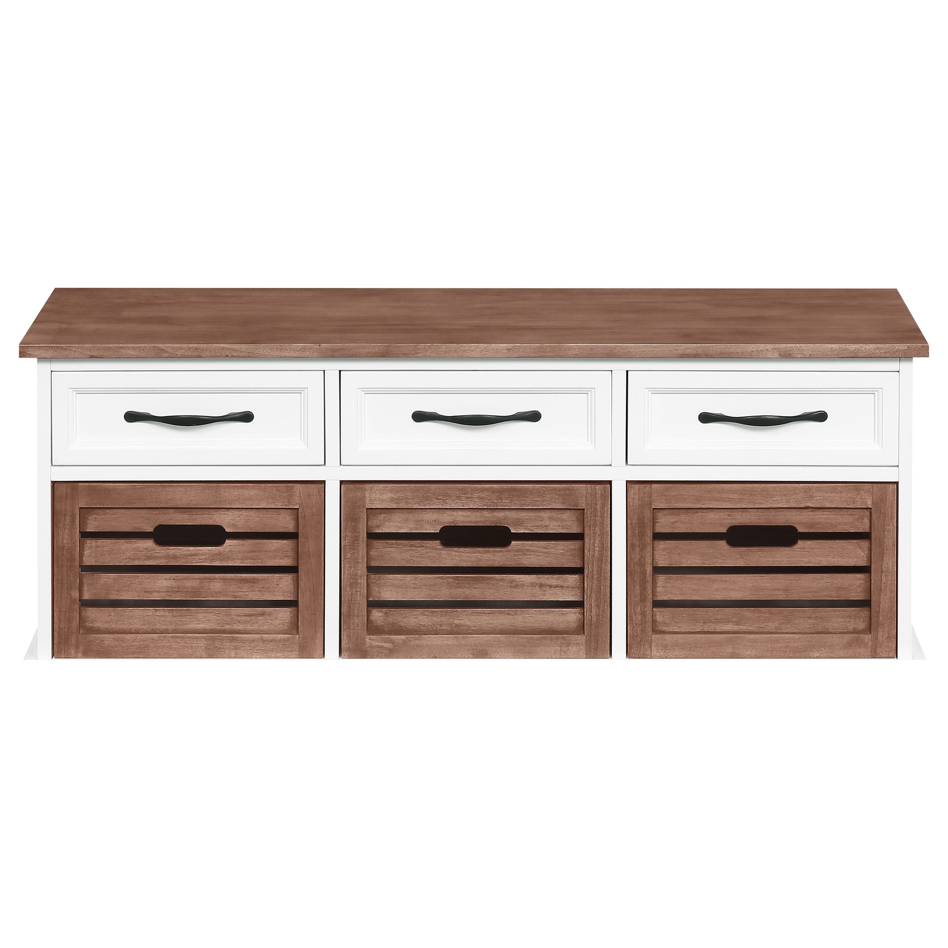 Elevate a hallway or entryway with the delicate details from this modern storage bench. With three drawers and three wooden baskets, this bench is great for storing extra linens or shoes. Rich, warm cappuccino contrasts against crisp white to create a stunning visual. The classic silhouette and dark hardware gives a sophisticated feel to any space. Open horizontal lines on the baskets create a fun and modern feel.
