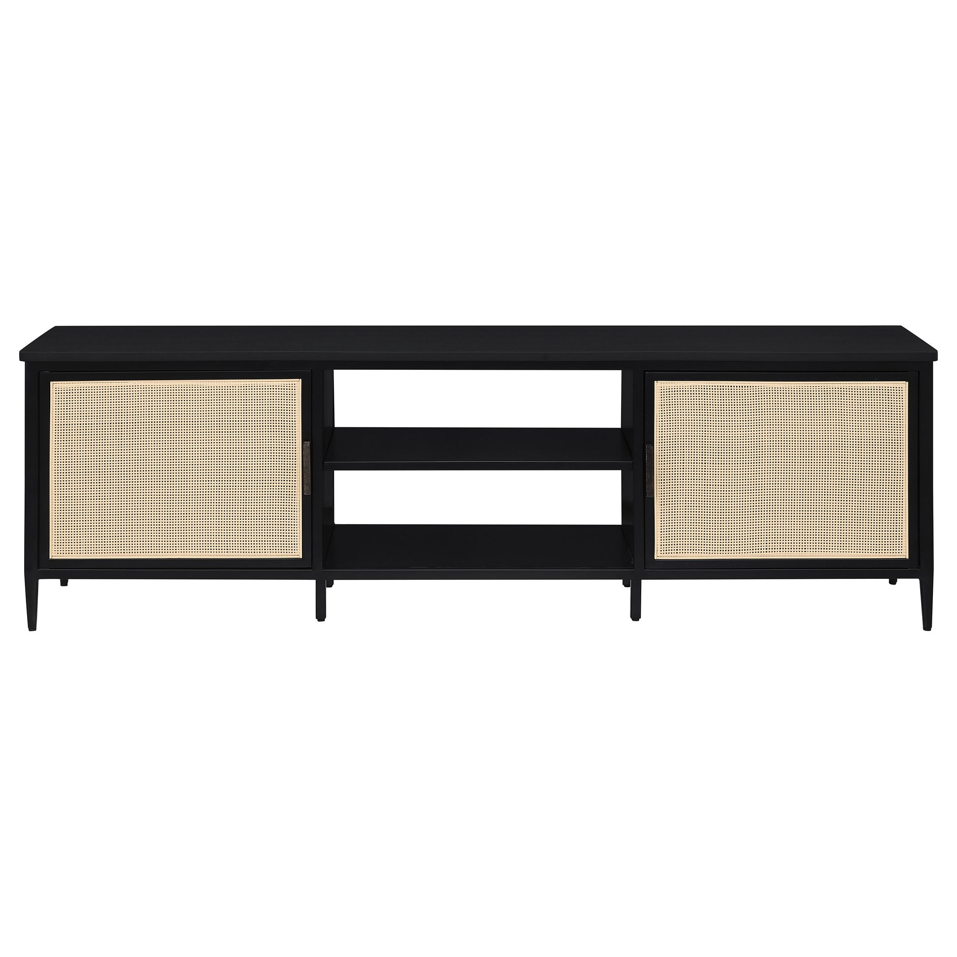 Elevate your entertainment area with this sleek 70-inch TV stand, perfect for accommodating up to a 75-inch TV. The modern design features two door cabinets with stylish radio weave polyethylene (PE) rattan fronts, adding a touch of natural texture to your space. Constructed with a durable metal frame and finished with a sleek powder coating, this stand offers both form and function. Two open-back shelves provide convenient space for devices, ensuring easy cable management and accessibility. With its contemporary appeal and thoughtful design, this TV stand enhances both the style and functionality of your living room.