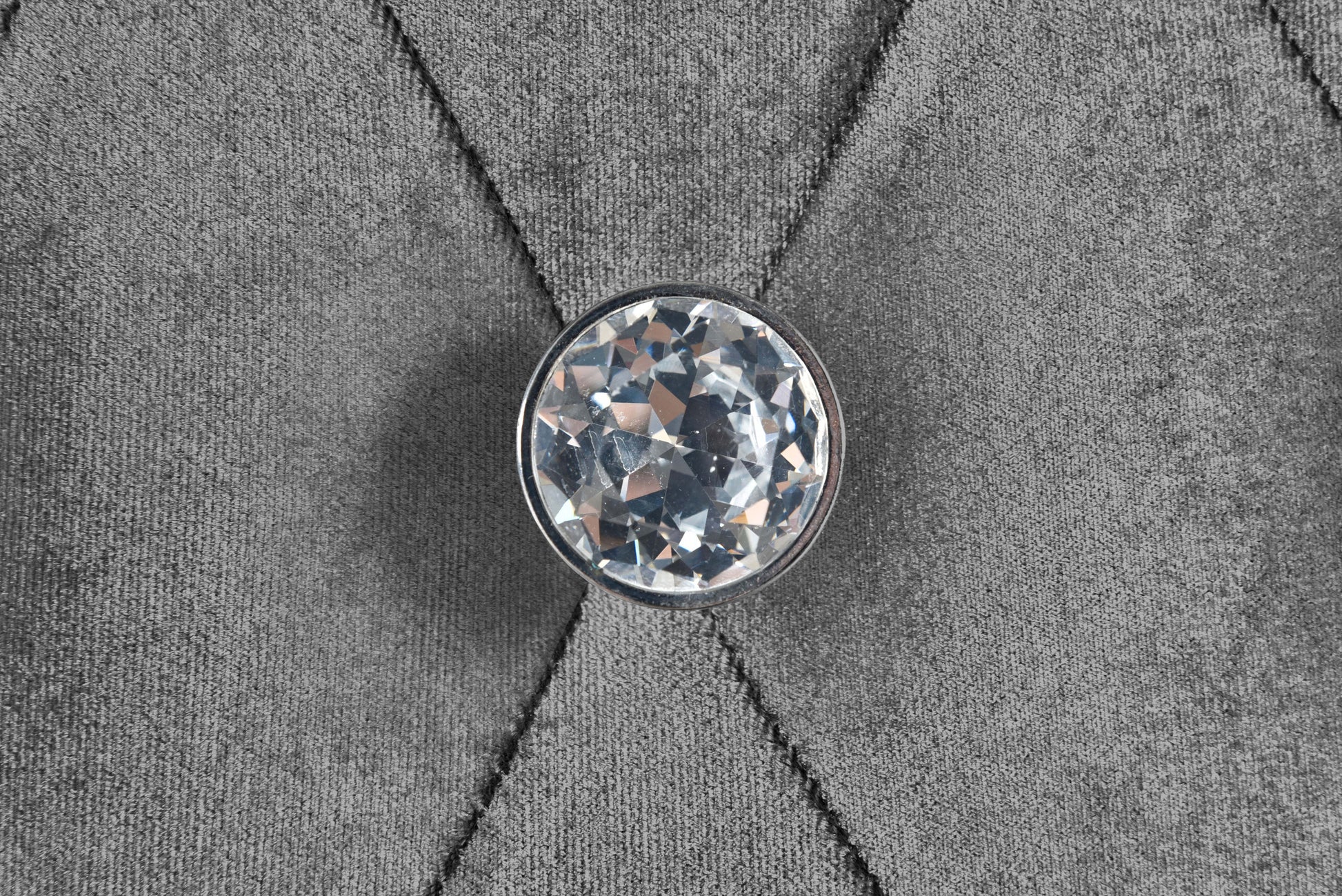 A delicate balance of regal traditionalism and modern sensibilities, this gorgeous glam upholstered bed is an instant centerpiece in any bedroom. Lush gray velvet upholstery graces the shapely head and footboards, each with button tufting that creates engaging texture and dimension. Buttons are made to resemble glittering jewels and accent stitching emphasizes the diamond pattern of the tufting. Embodying decadence, the bed features elegant scrolled accents traced in chrome finish nailhead trim. On the headboard, the scroll trim creates a sheltered effect that delivers a cozy ambiance without sacrificing glamour.