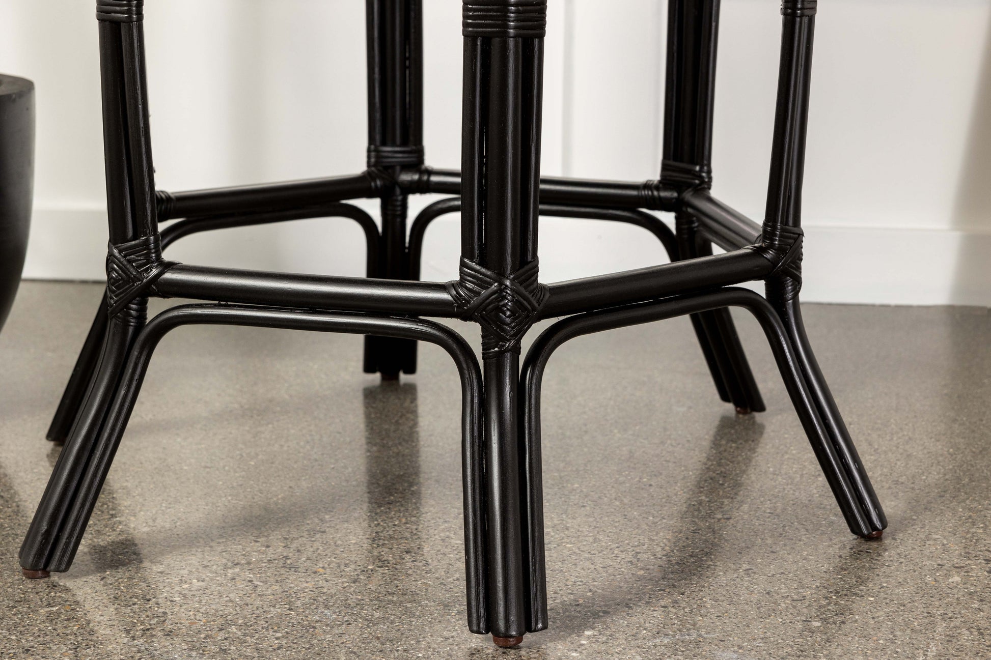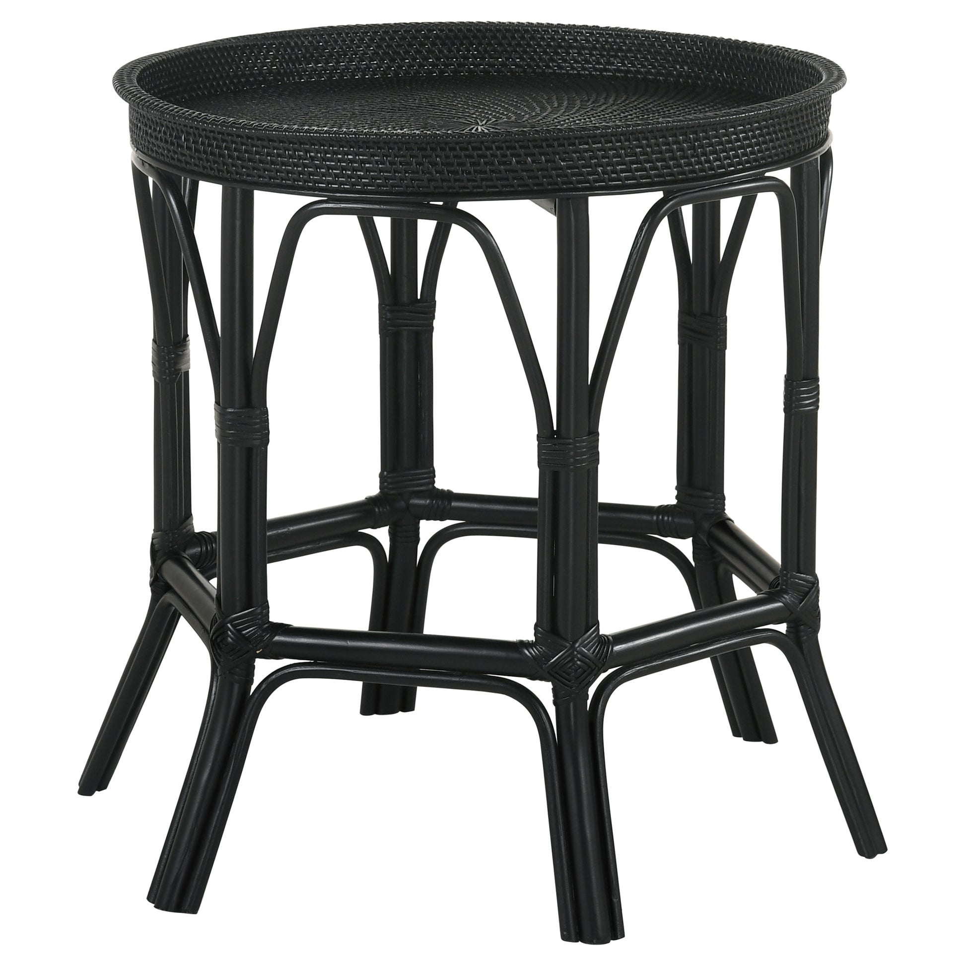 Perfect for coastal-inspired homes, this bohemian rattan accent table brings a natural texture and accent to the space. Designed with a woven rattan table top with a round over bevel edge, this vintage-inspired accent table keeps items close at hand. A base made up of six slender legs creates an open, airy look and feel. With the black rattan material, this accent table slides into your existing decor effortlessly. A lovely addition to boho-leaning interiors and global-inspired tastes.