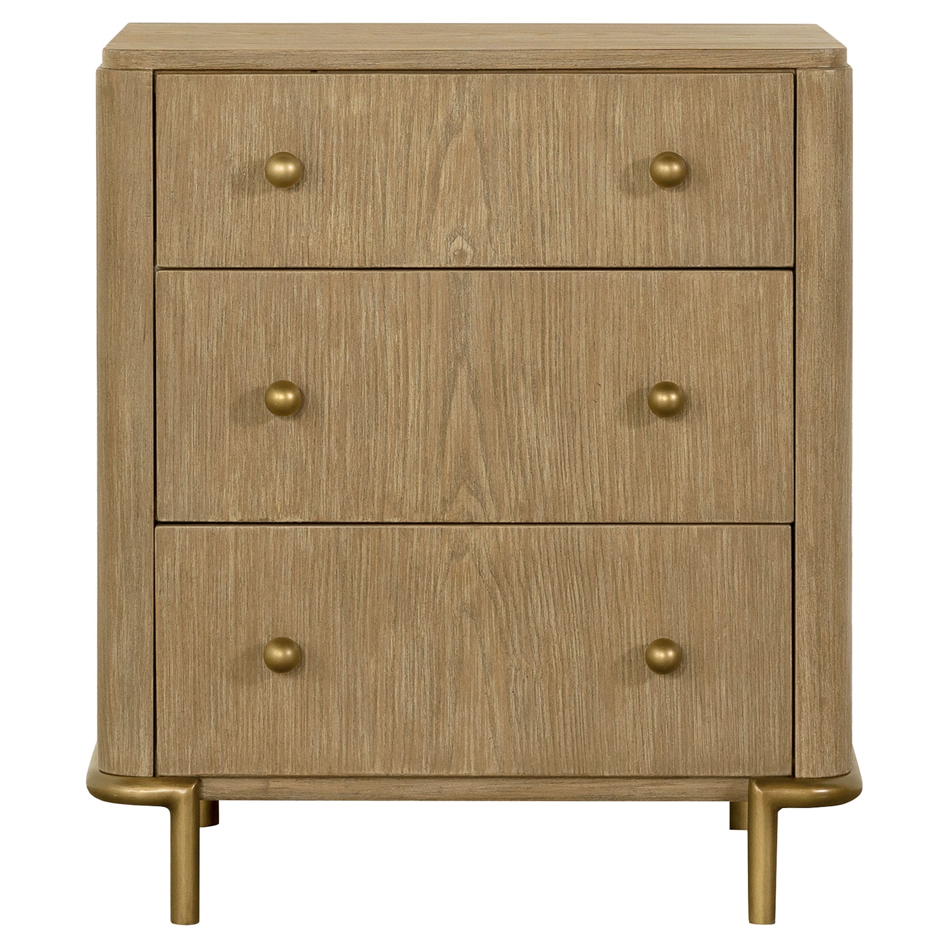 This coastal-inspired bedroom set blends mid-century modern influences with natural textures for a serene retreat. The bed features a cream fabric upholstered headboard and footboard, framed by a wire-brushed wood finish that enhances the beauty of rubberwood, engineered wood, and ash veneer. Aged brass knobs and slender metal legs provide a refined contrast. Designed for modern living, the nightstand includes a built-in dual USB charging port. With its organic textures and functional details, this set offers timeless style and everyday convenience.