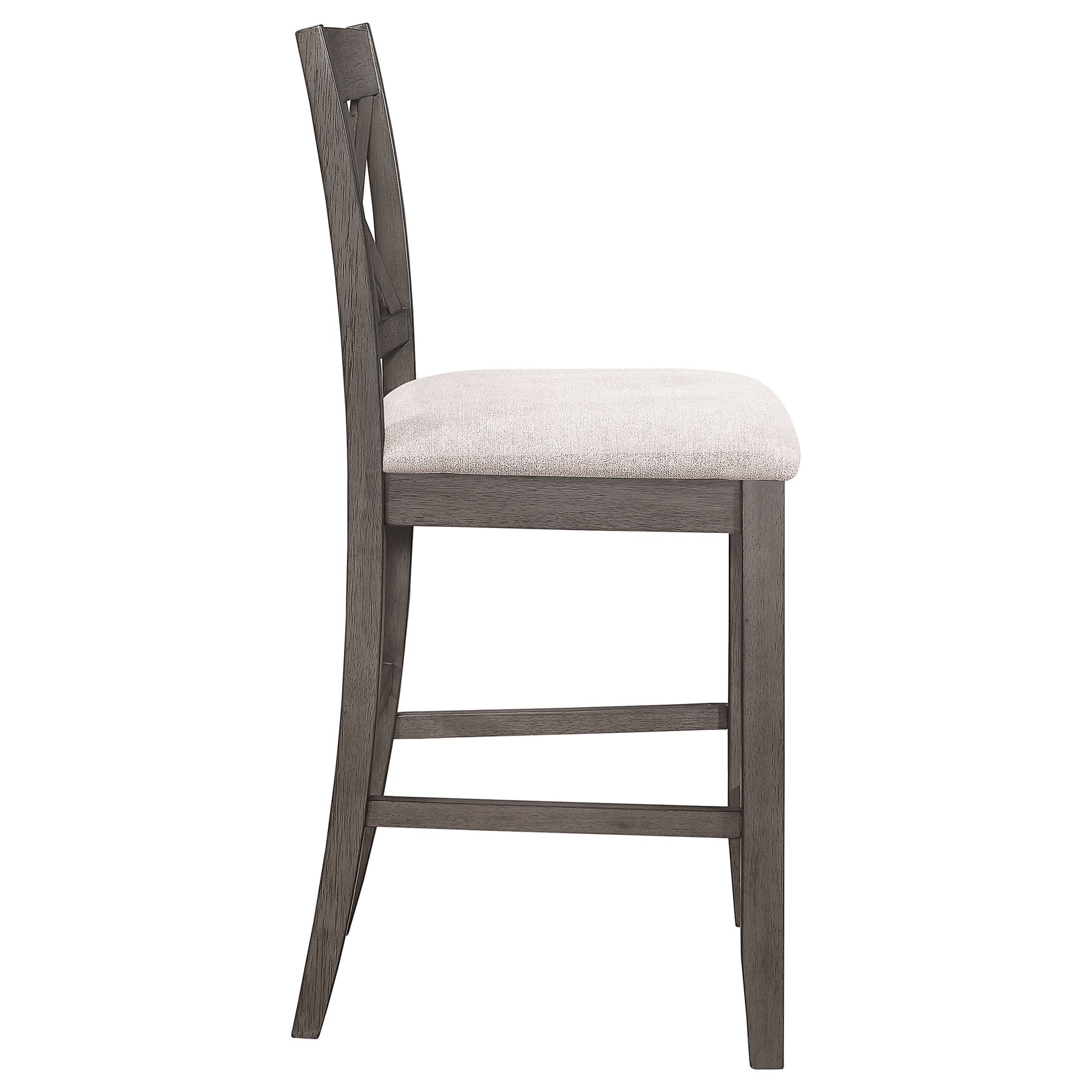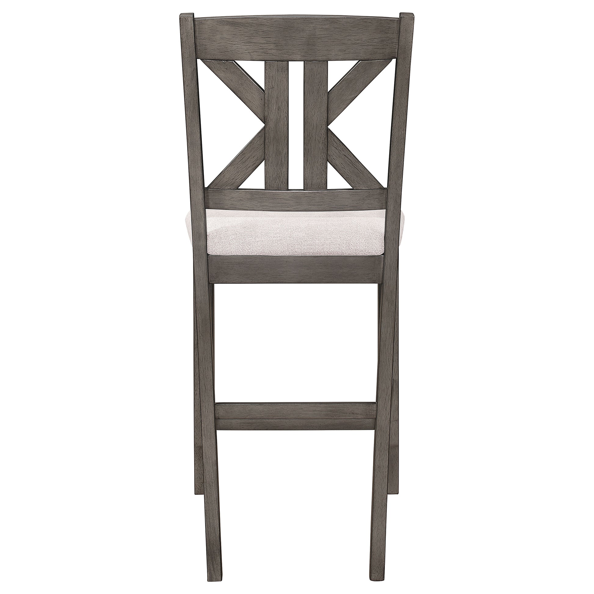 Create a put-together dining space that exudes classic country vibes. This counter height stool is beautifully designed with rich, rustic style in mind. The supportive seat back boasts an intriguing, cutout design with bold, geometric angles. The chair is topped with a plush, upholstered cushion for exceptional comfort and support. A subtle, barn grey finish completes the design with a charming, farmhouse inspired appeal.
