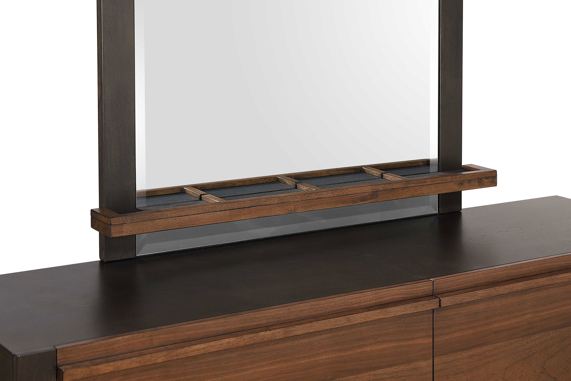 Visually charming as it is functional, this rectangular wood framed dresser mirror completes a design scheme in any space. A thick frame delivers definition and highlighting to add balance and proportion. Options for attaching to a variety of case pieces becomes a positive feature. A panel of beveled glass is framed in rubberwood, walnut veneer, and other wood products, with a bonus jewelry tray attached. Embrace a rich walnut finish frame that warms any space and contributes to flexibility for future bedroom redesigns.