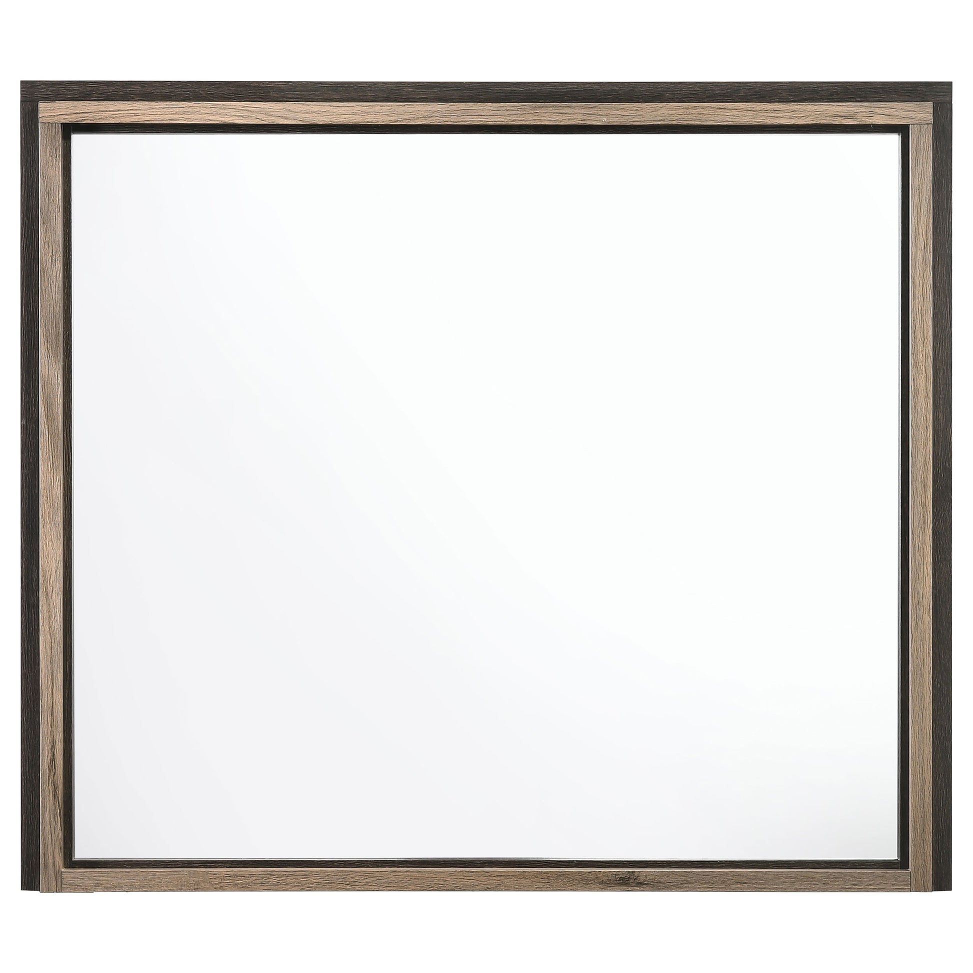 Elevate your bedroom dresser and add height to a focal wall with this rustic modern mirror. A dual level frame surrounds a smooth, non-beveled mirror, offering a minimalist modern touch to bedrooms. Designed with a 3D paper veneer that gives off a wood grain-like texture along with a two-tone brown and light taupe color palette, this framed mirror makes a striking addition to a lakeside cabin or mountainside chalet. Place this mirror on top of a dresser to transform the space into a meaningful vanity setup. Perfect for your bedroom retreat!