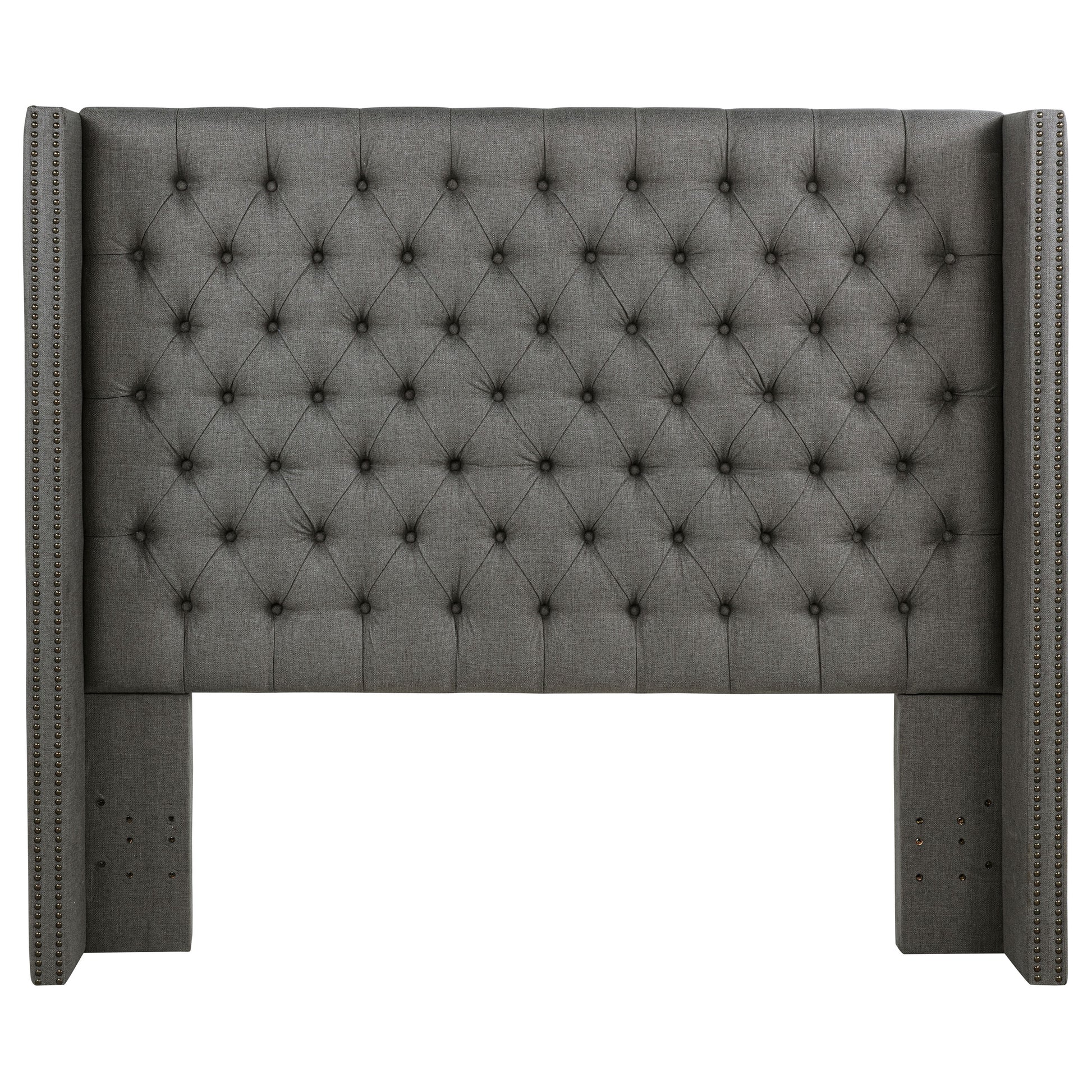 We love the cozy ambiance created with a demi-wing design in this modern upholstered headboard. Perfect for freshening up your bedroom, it offers a contemporary look with classic design details that bring intriguing richness. Dark gray upholstery is padded and button tufting, creating depth and dimensionality. Wings are lined with individually applied nail heads that showcase a warm bronze finish, offering the perfect touch of character. Pair with linens in a soothing color to create a refined, inviting presence in your bedroom.
