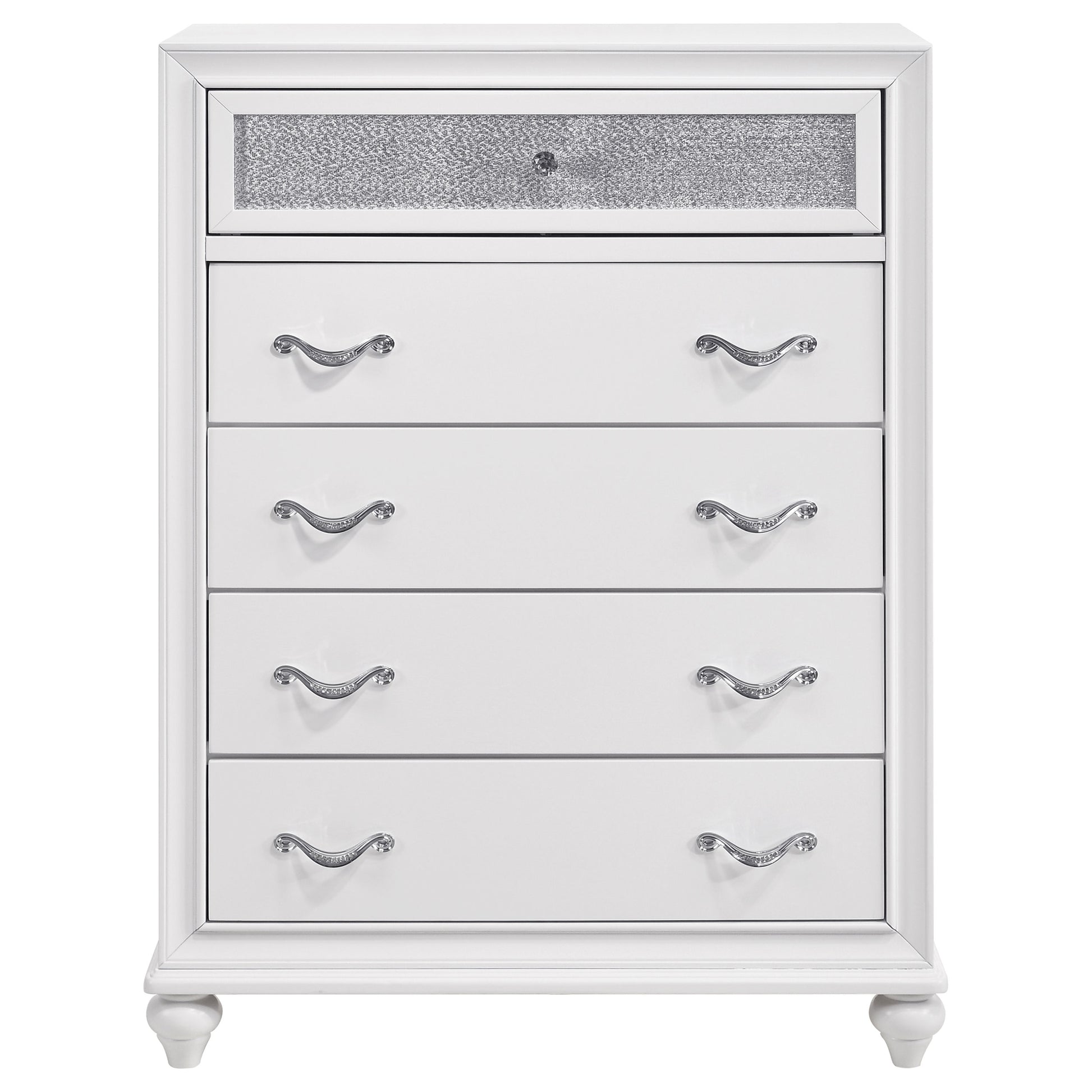 Get ready to add exquisite glamour to your space with this white upholstered bedroom set. The dramatic headboard offers incredible contemporary appeal with velvet upholstery, button tufting, crystal-like accents and hand-applied nailhead trim with a chrome finish. The matching nightstand comes equipped with a crocodile textured door panel and a glimmery chrome top drawer panel. The seven-drawer dresser with mirror and optional five-drawer chest offers the same texture and sparkly finish. Sleek chrome bar pulls perfectly complement the tapered legs on the panel bed and the bun style feet for the storage pieces.
