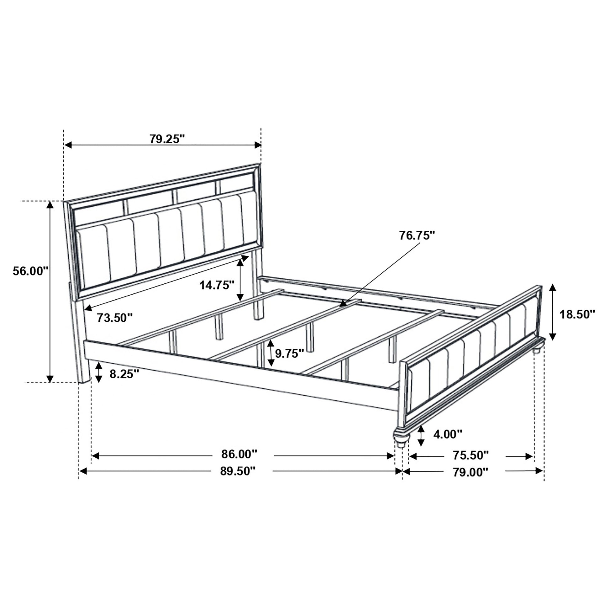 An eye-catching design with sleek style. Make any room a decor haven with this exceptional bed. Easy elegance offers a casual look with modern accents. Bold styling plays with geometric shapes in vertical and horizontal orientations. Add a glam touch with metallic leatherette upholstery.