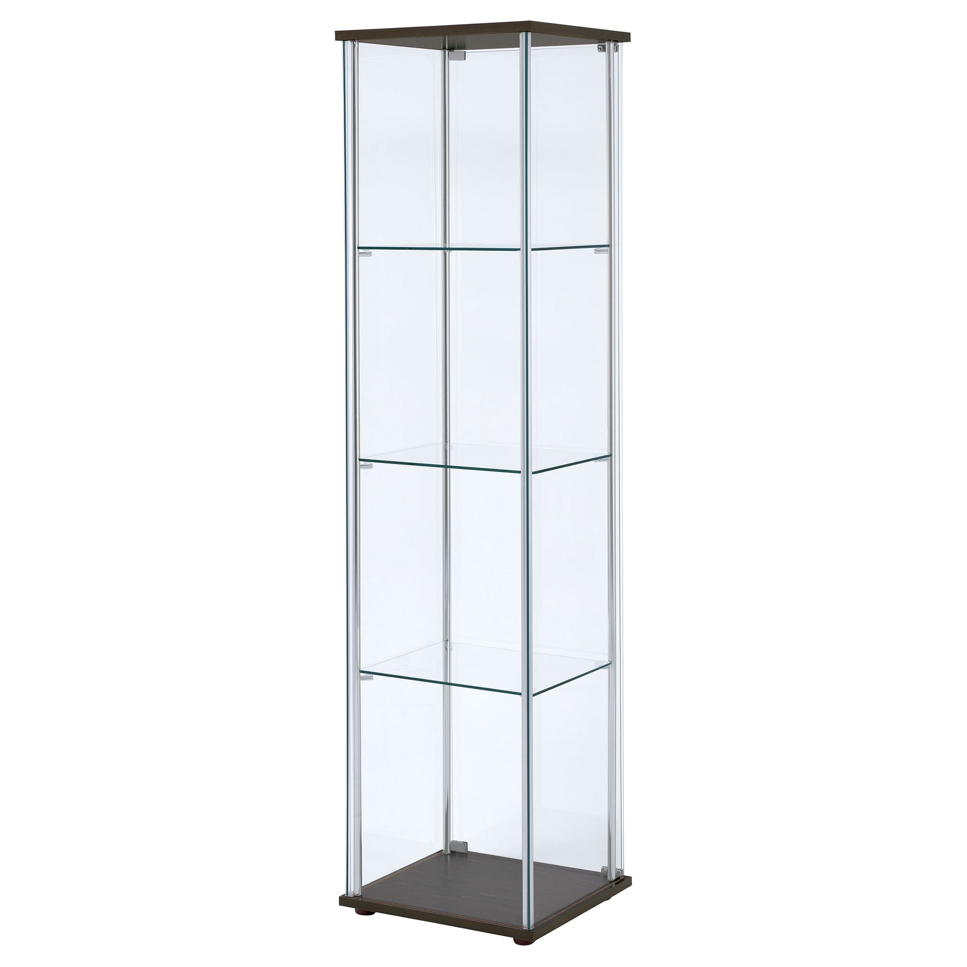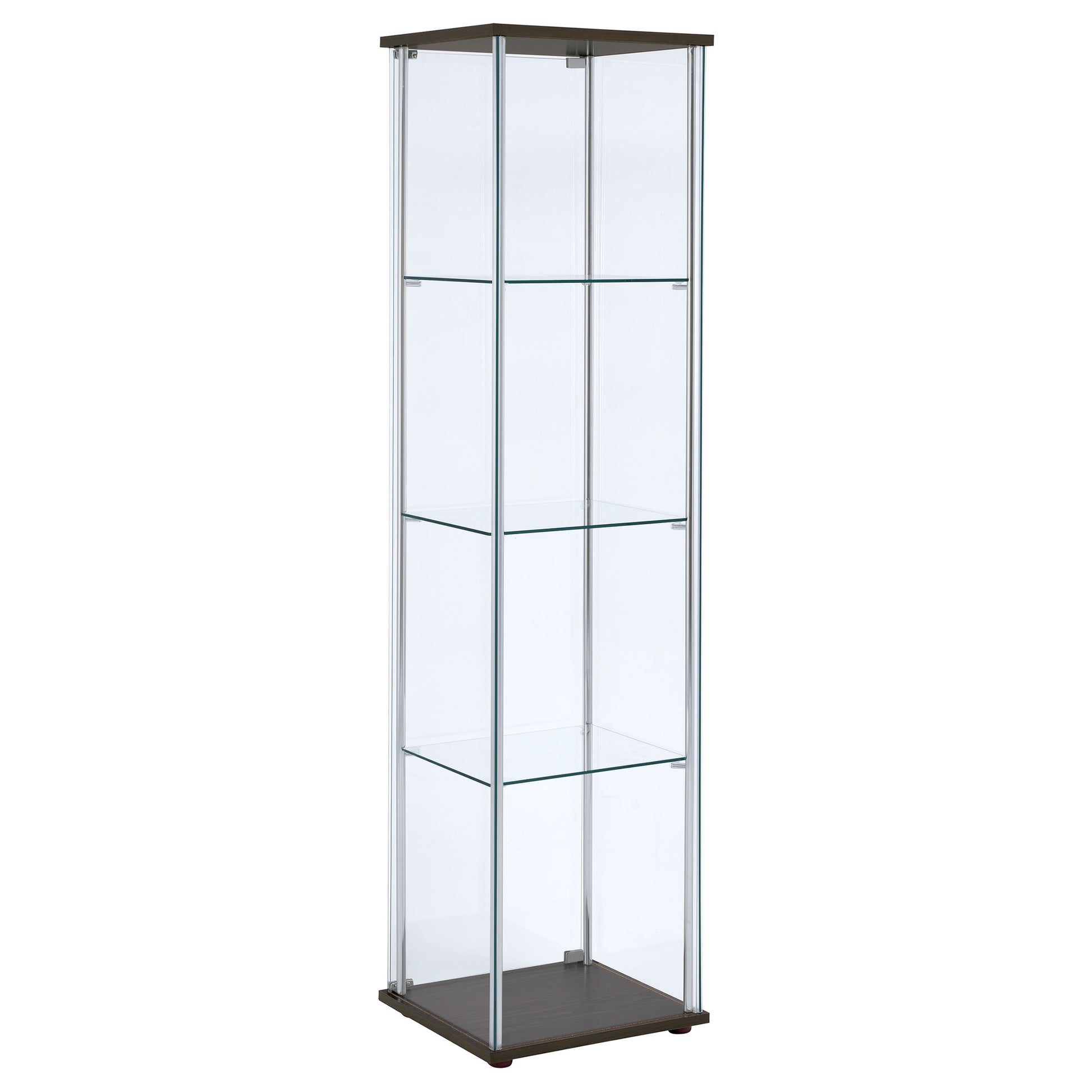 Go for a fresh new look with artistic influence. This curio cabinet turns design on its head with a new twist on tradition. Perfect for transitional spaces, its chrome support beams and cappuccino finish base and top nicely complement glass shelving and exterior panels. Three shelves clear the way for showing off your best decor. Upgrade a stylish living space with this fabulous find.