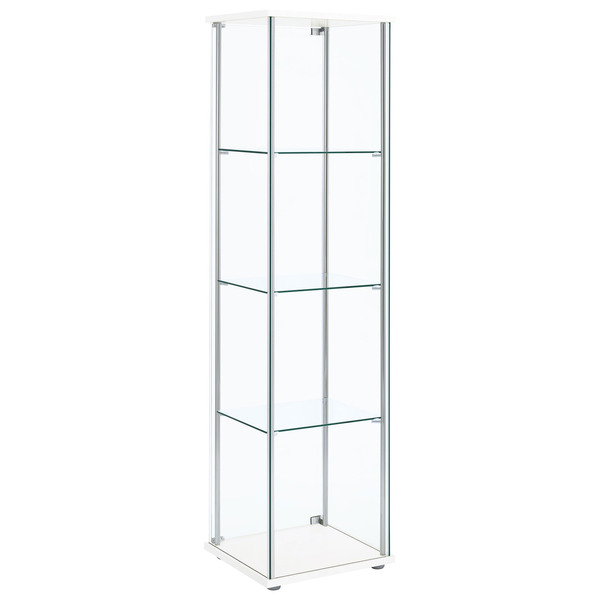 Perfect for decorative plates and vases, this white curio cabinet helps to open up space. Sleek and tall, the four shelves are great for adding visual height to a living or dining room. Smooth chrome details complement the clear modern shape. Neutral in color and silhouette, this cabinet is versatile. Store belongings in style while streamlining space.