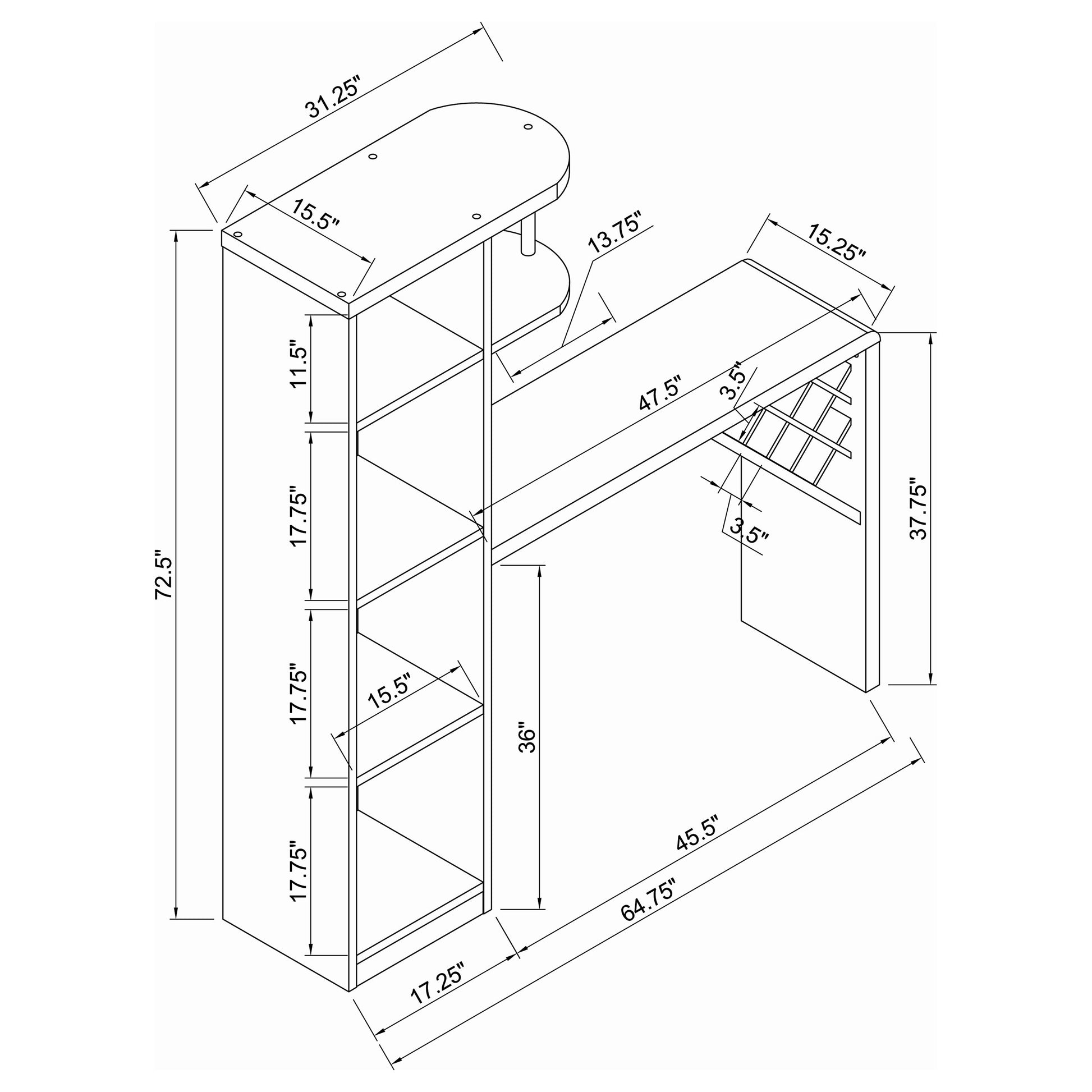 This is an artful, asymmetrical use and storage solution for the wine connoisseur who craves eye-catching style along with practicality. Four roomy vertical compartments allow for intelligent storage of bottles or glasses, with an additional, striking diagonal wine storage unit nestled into the structure. A long horizontal wood surface creates further open, creative storage units, or just stand at the bar and enjoy your drink with friends. The design of this unit allows for placement on the open floor, or alongside a wall for maximum utility in a tight space. It's a smart and elegant solution; if only wine pairings were this easy!