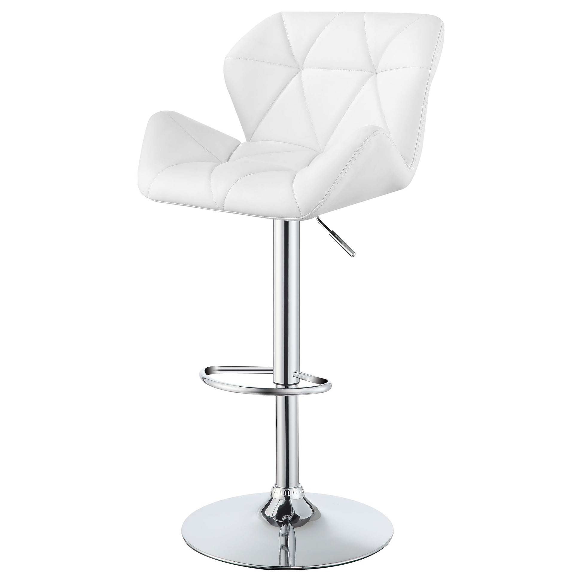 Enhance the look and feel of a breakfast bar with casual comfort and understated glamour. This stylish white bar stool blends appealingly with a variety of decor and color schemes. A simple, round foot rest provides an extra level of comfy relaxation. Elegant tufting enhances the modern design of its plush, cozy seat, while a gleaming chrome finish base adds a pleasing touch of polish. Its height is conveniently adjustable, opening up a variety of placement options to meet your seating needs.