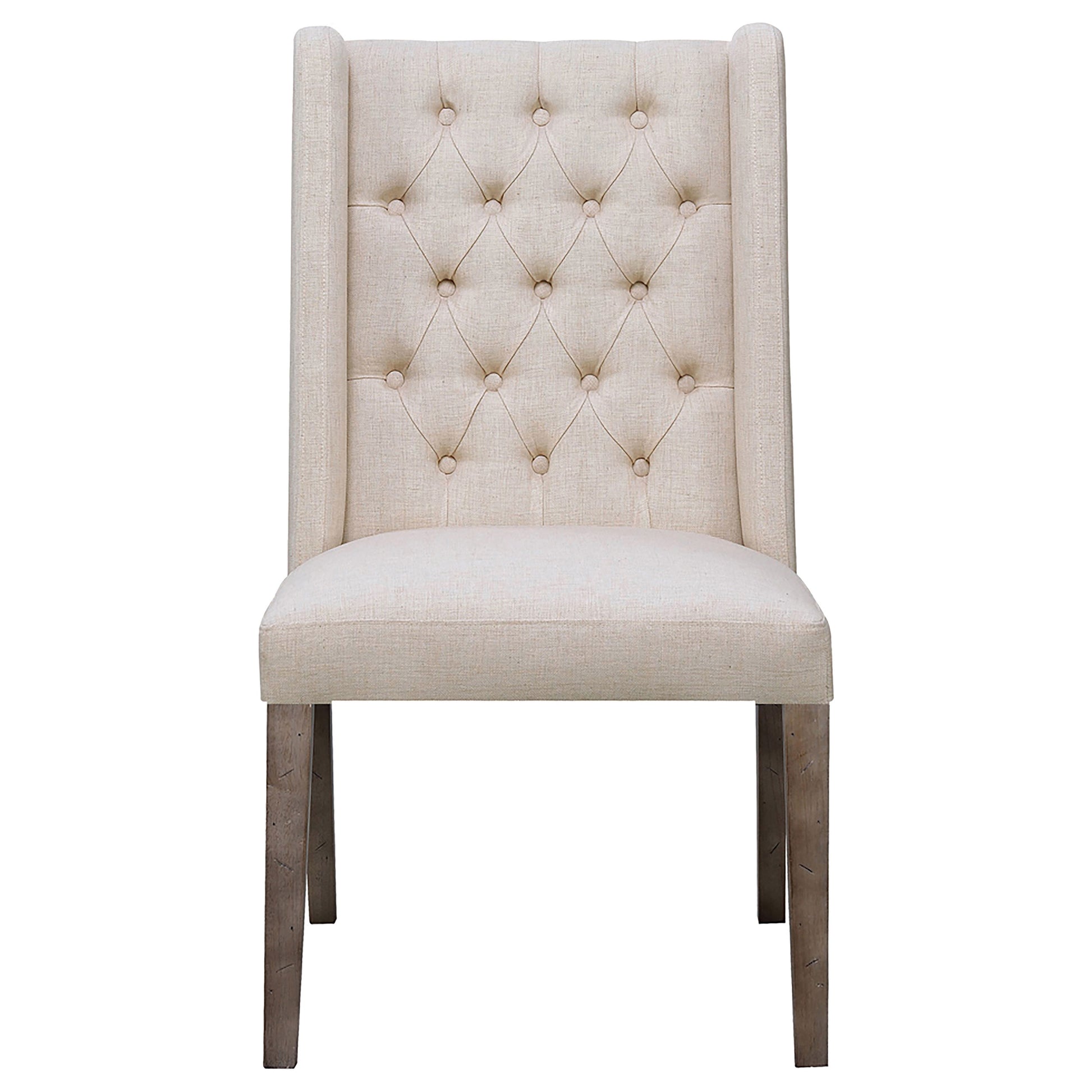 This stately dining chair has a luxurious look and feel that's fit for royalty. A soft, plush, comfortable seat allows for restful relaxation. The seat is embellished with eye-catching rivets, giving it a classic look. A sleek silhouette and gently curved legs add glamorous opulence. Elegant and refined, this chair adds graceful style to a formal dining room.
