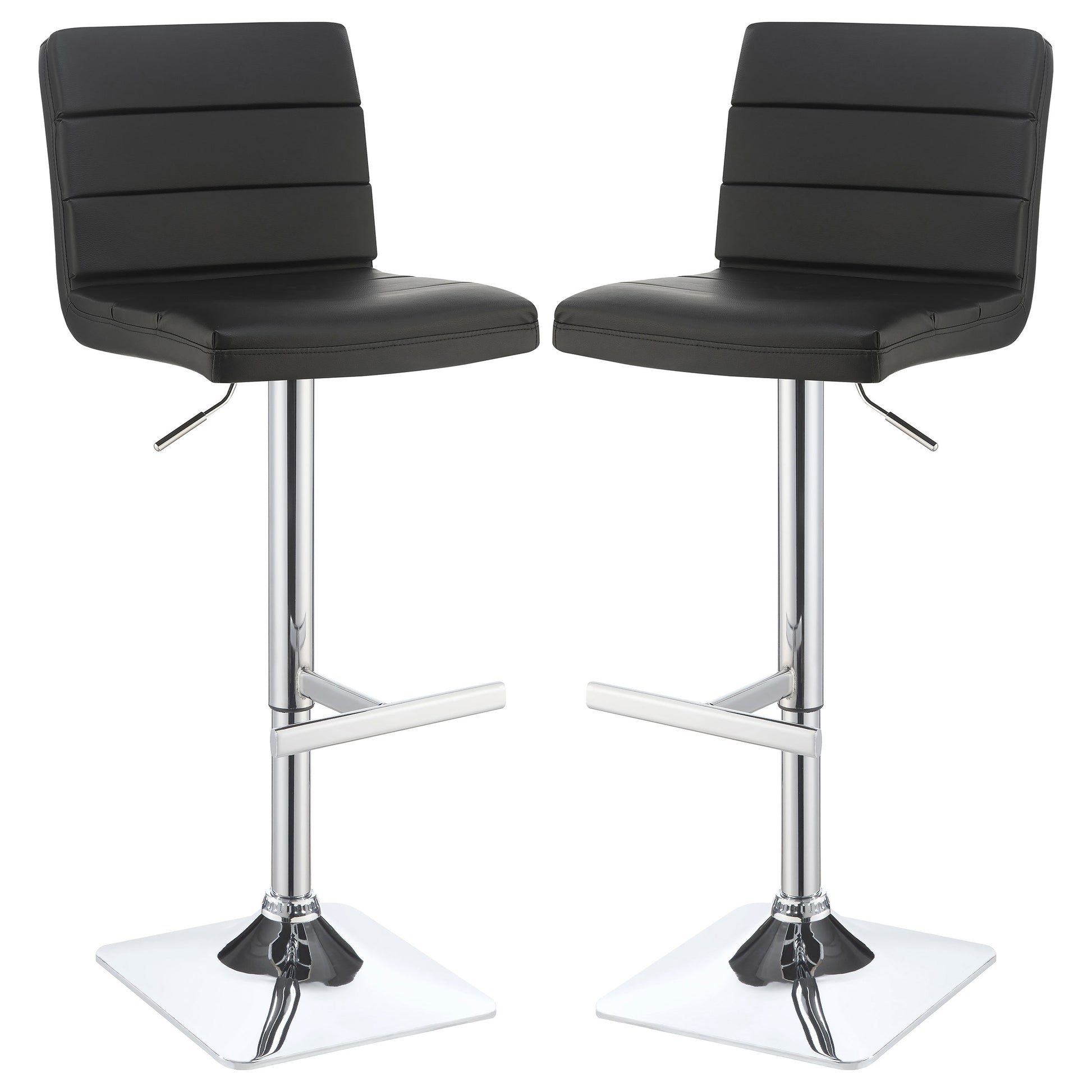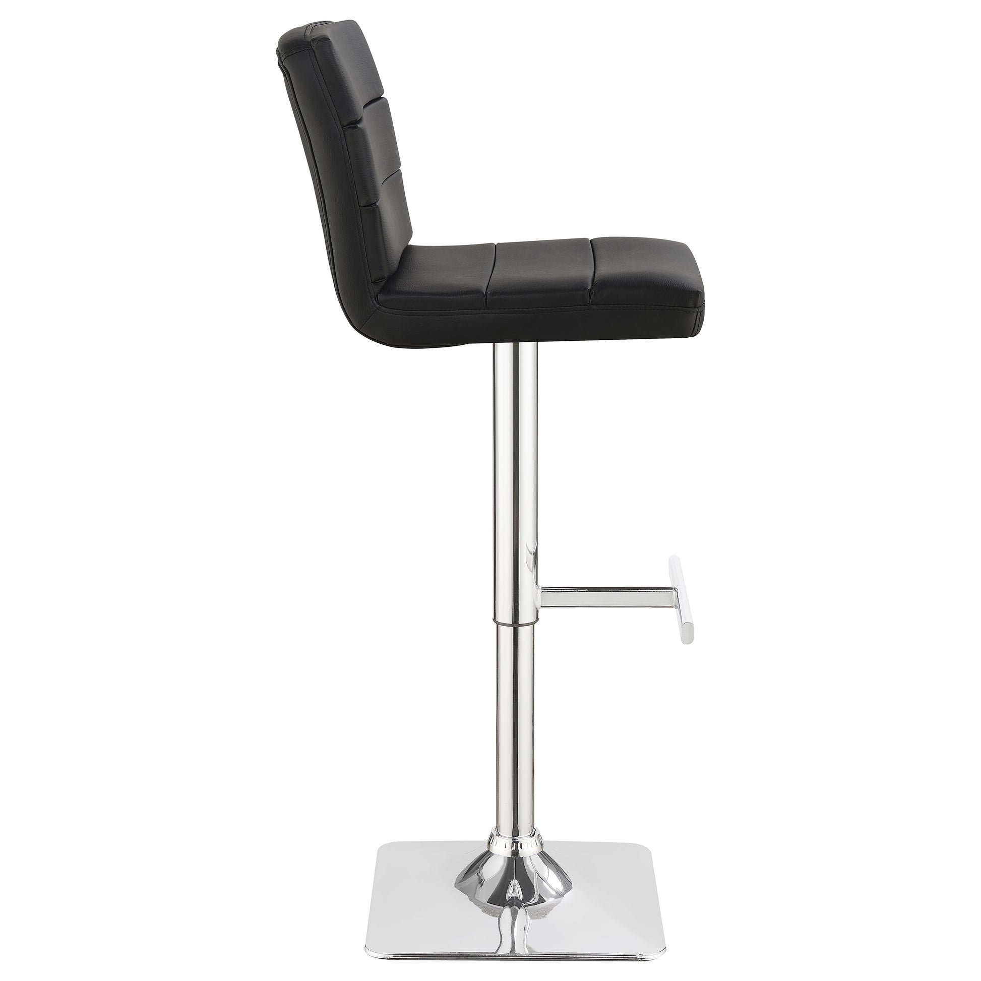 Modern finishes reinforce the contemporary aesthetic of this adjustable barstool. Featuring a height adjustable seat for easy, convenient adjustments to best fit your space. Its seat is upholstered in black leatherette with horizontal stitching that adds depth and detail. A pedestal base features a square foot and a gleaming chrome finish. A T-shaped footrest is built in, offering easy relaxation for a quick bite or a leisurely night cap.