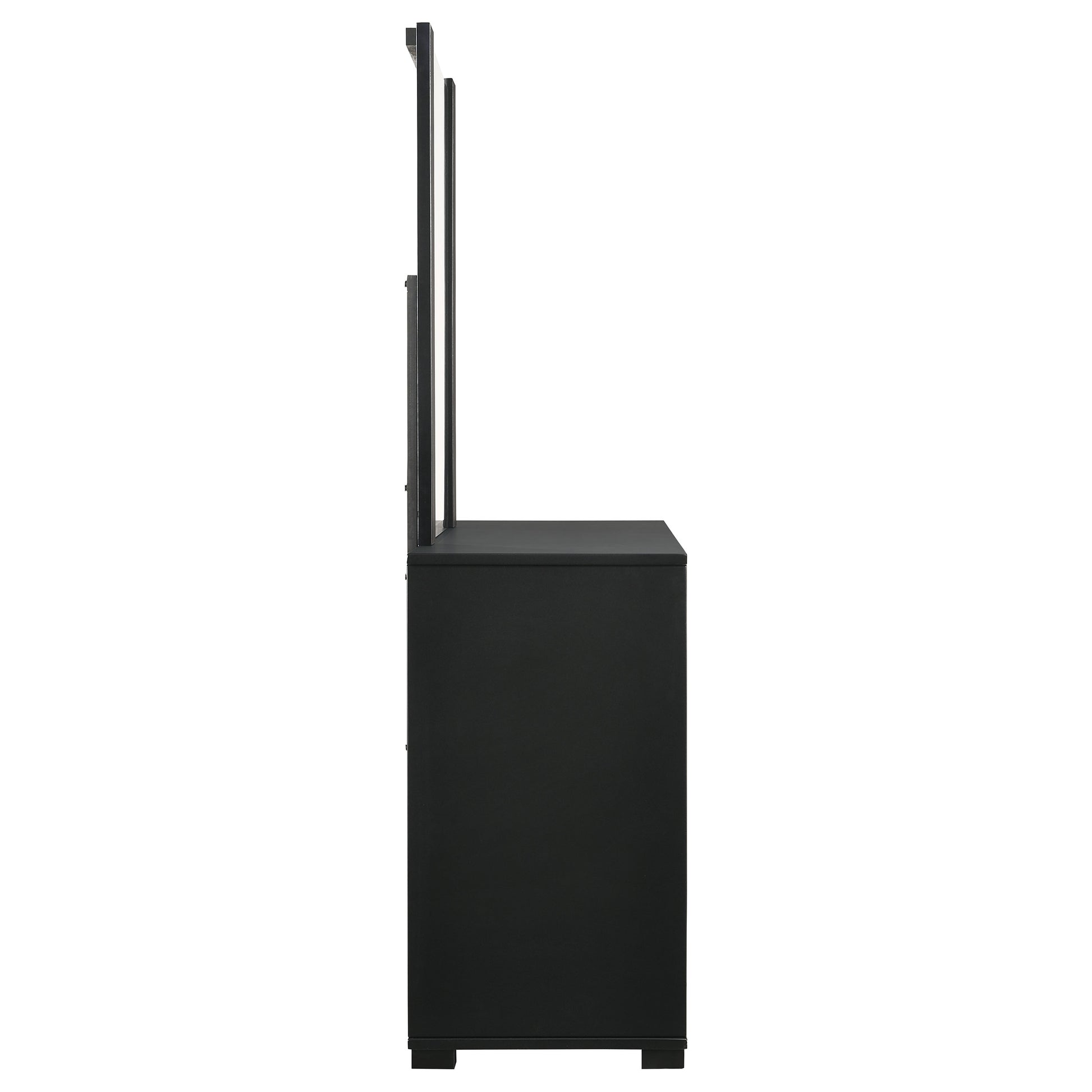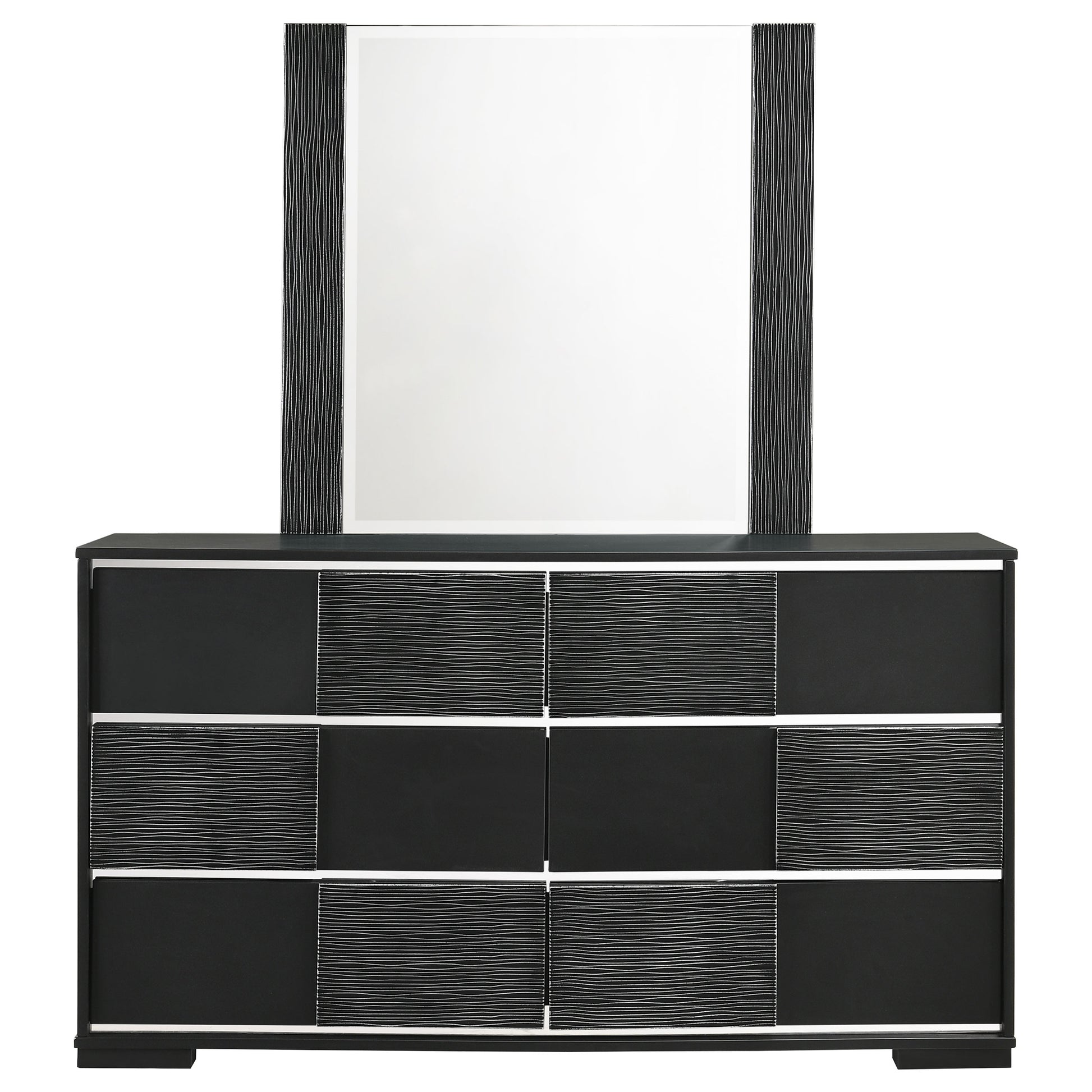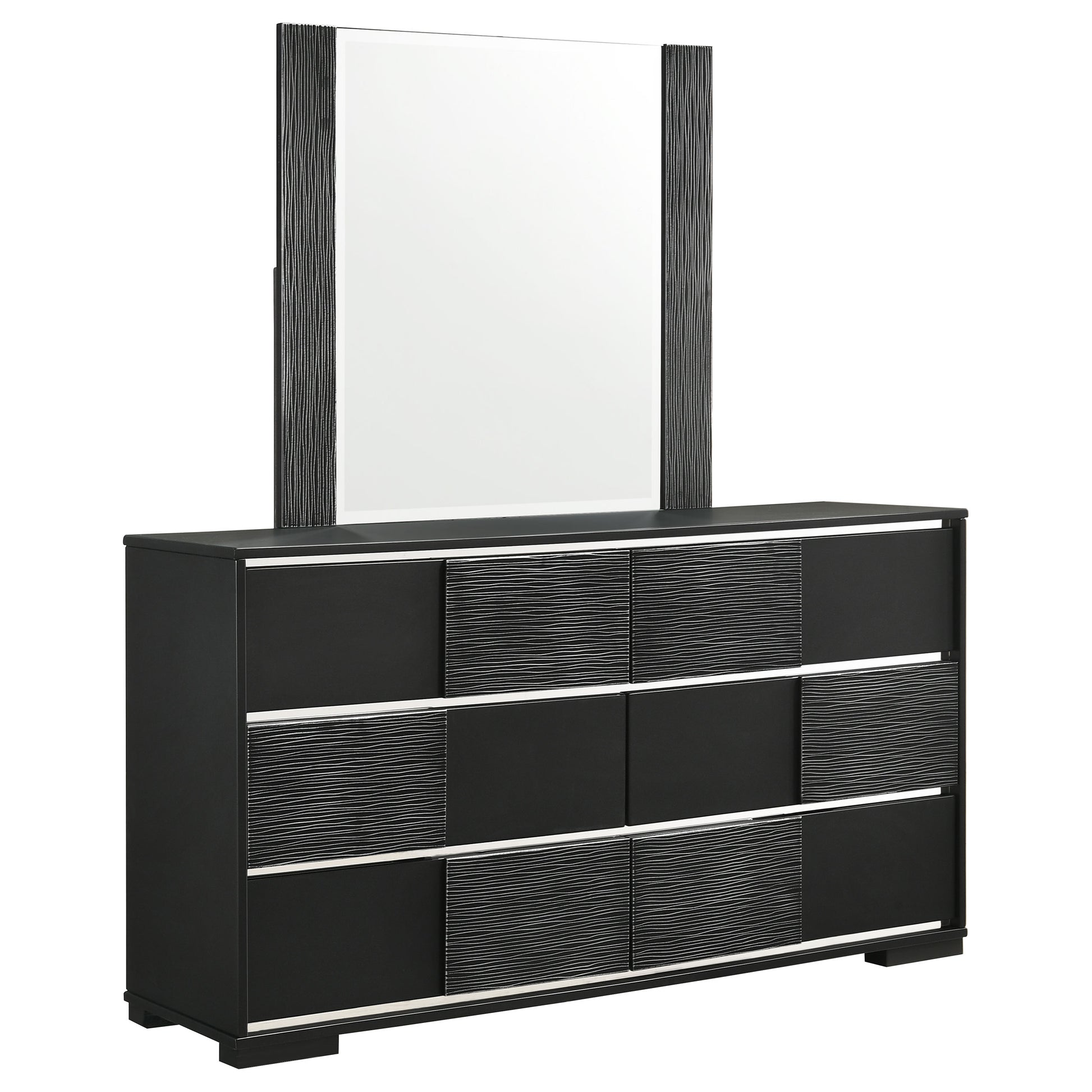 Energize your bedroom with the bold aesthetics of this modern black dresser. Gleaming chrome accents and stylish chambered trim enhance its cool, contemporary glamour. Spacious drawers provide ample storage to keep your wardrobe organized and out of sight. The matching mirror, with a tropical hardwood frame in rich black, adds modern elegance to any bedroom, perfectly atop the dresser for a cohesive and fashionable look.