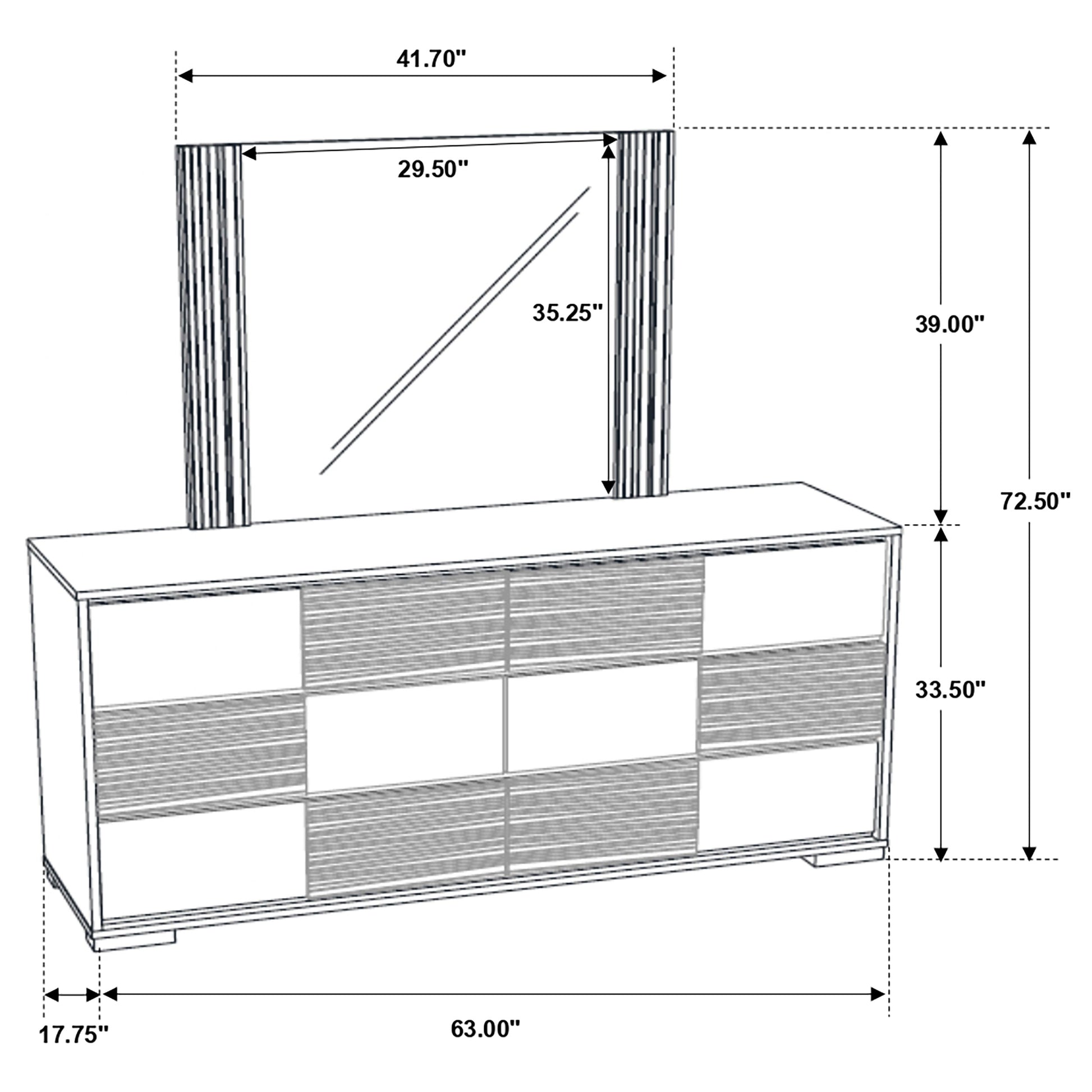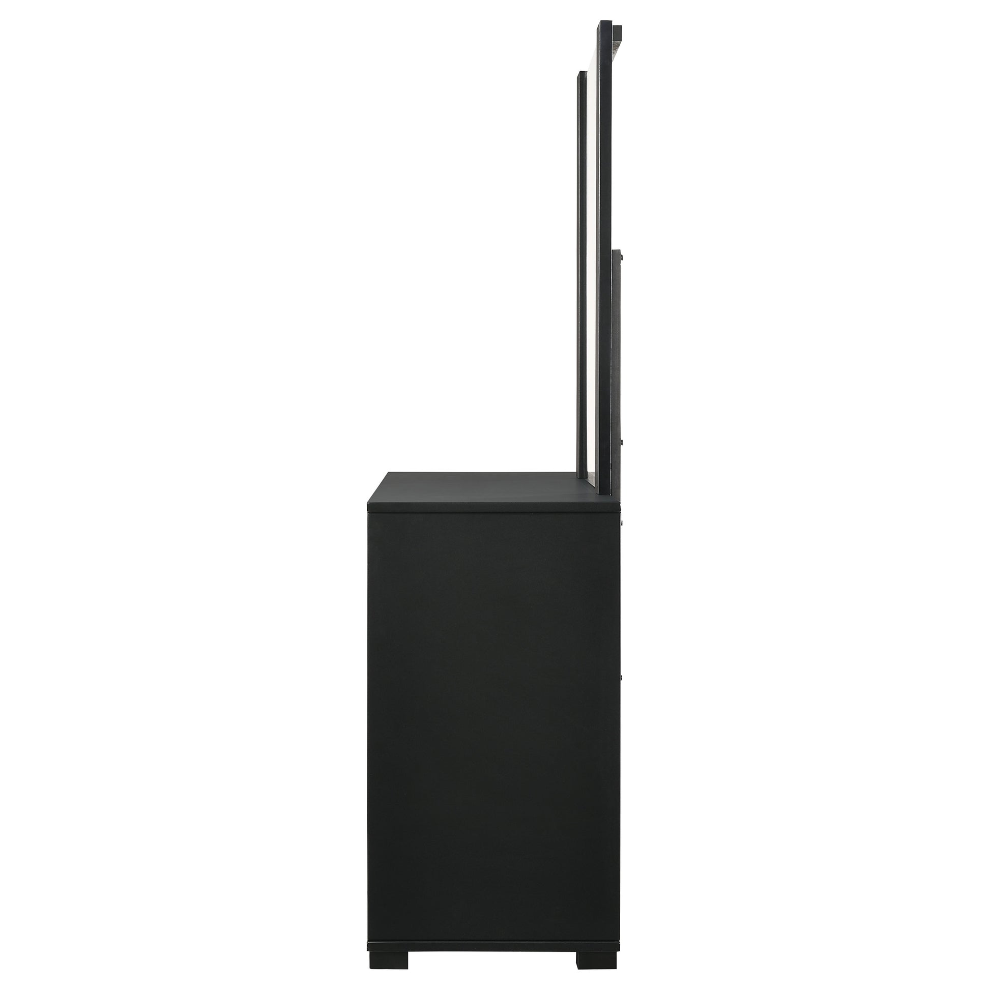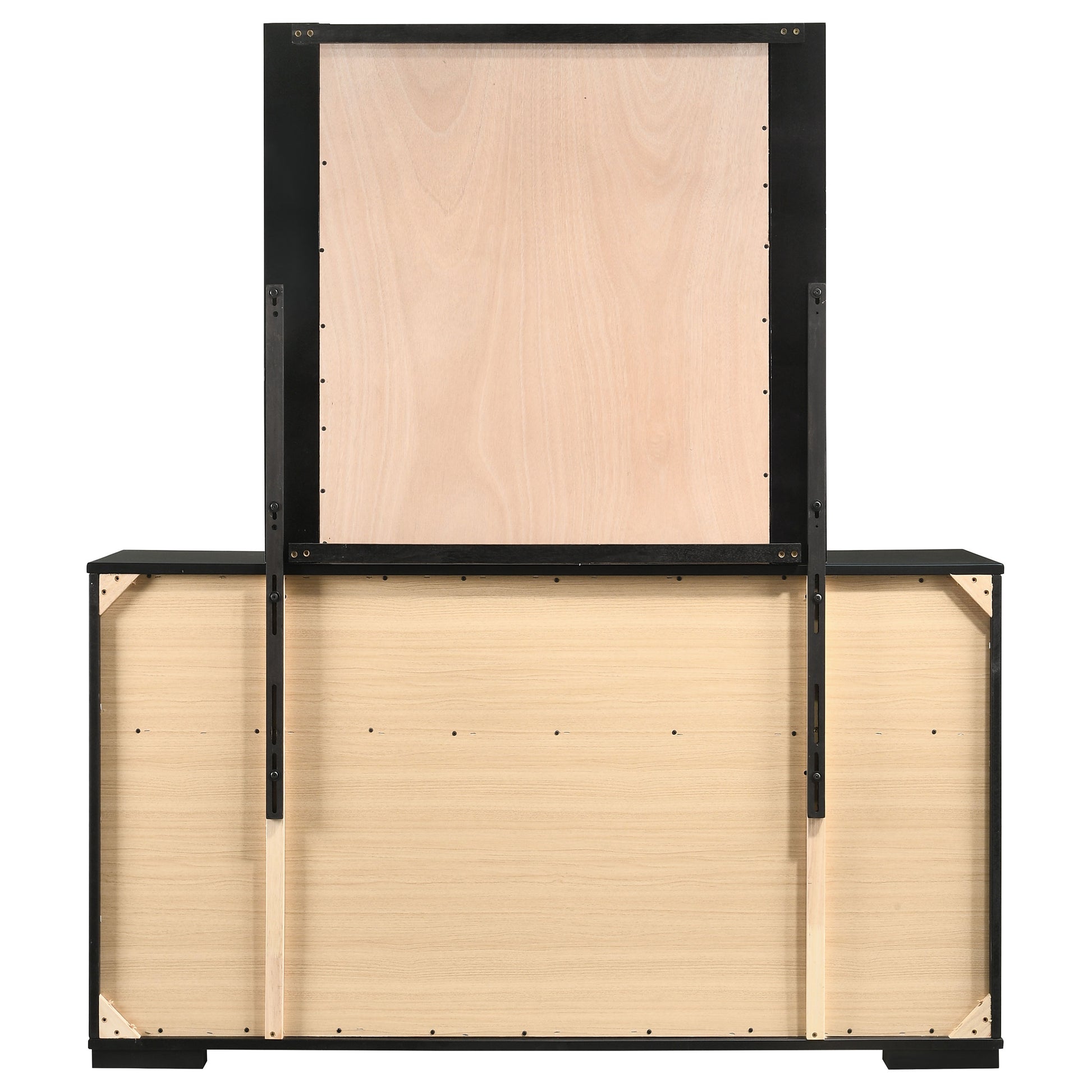 Energize your bedroom with the bold aesthetics of this modern black dresser. Gleaming chrome accents and stylish chambered trim enhance its cool, contemporary glamour. Spacious drawers provide ample storage to keep your wardrobe organized and out of sight. The matching mirror, with a tropical hardwood frame in rich black, adds modern elegance to any bedroom, perfectly atop the dresser for a cohesive and fashionable look.