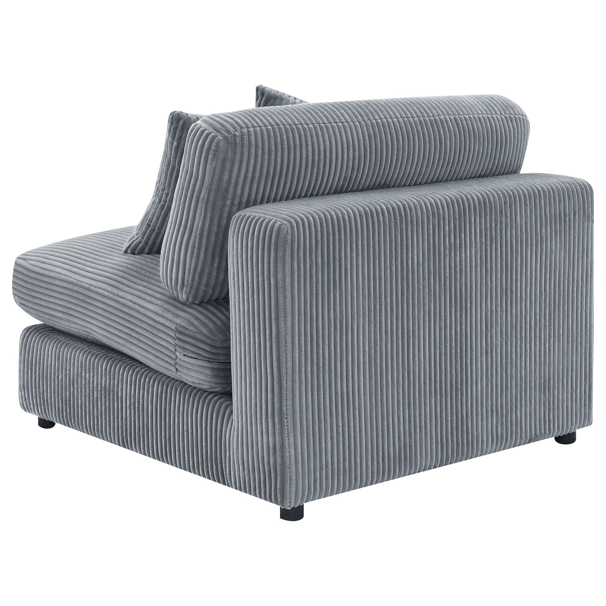 Instill cozy and inviting energy in your den or living room with a modern armless chair. Plush and comfortable, it features soft cushions and wide wale corduroy style upholstery in a soft neutral hue, perfect for augmenting existing seating. The seat and back cushions are each reversible, adding versatility and perfect for families and entertaining. Feet include non-skid grip to help keep the chair just where you place it within your space. Group couple by the fire, or add a cozy spot for reading and relaxing to your home office.