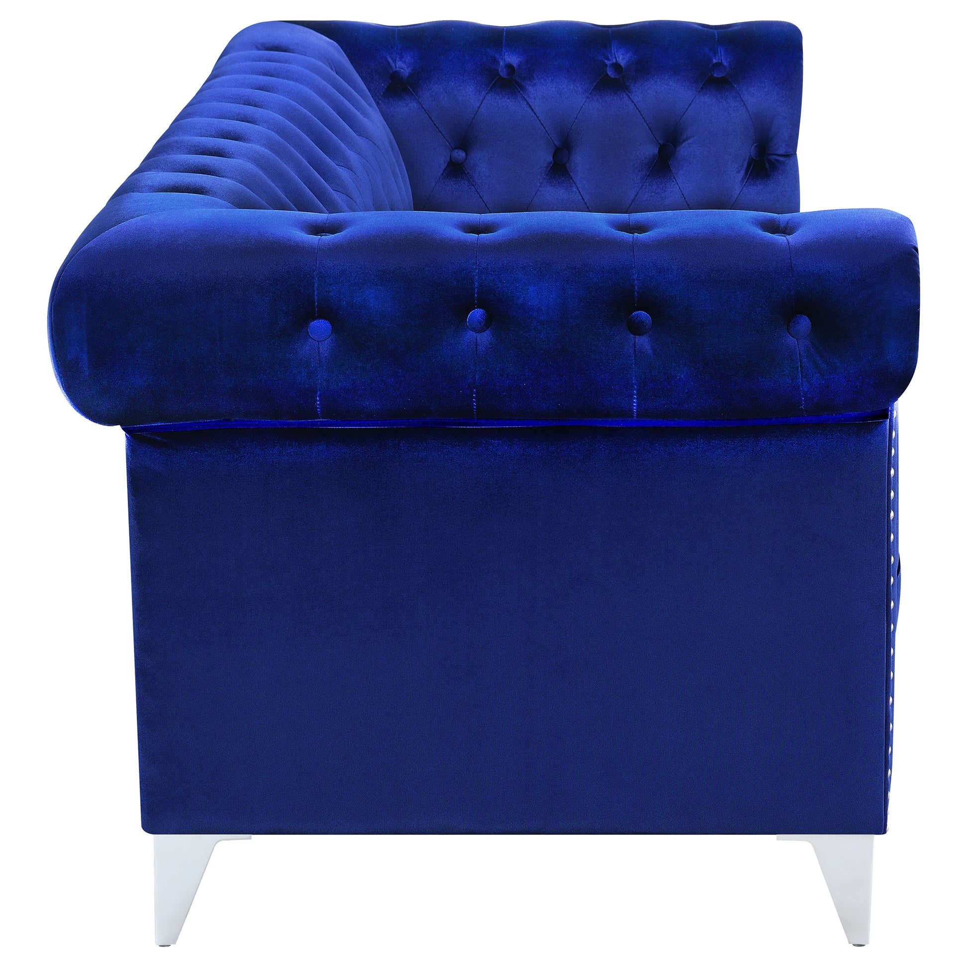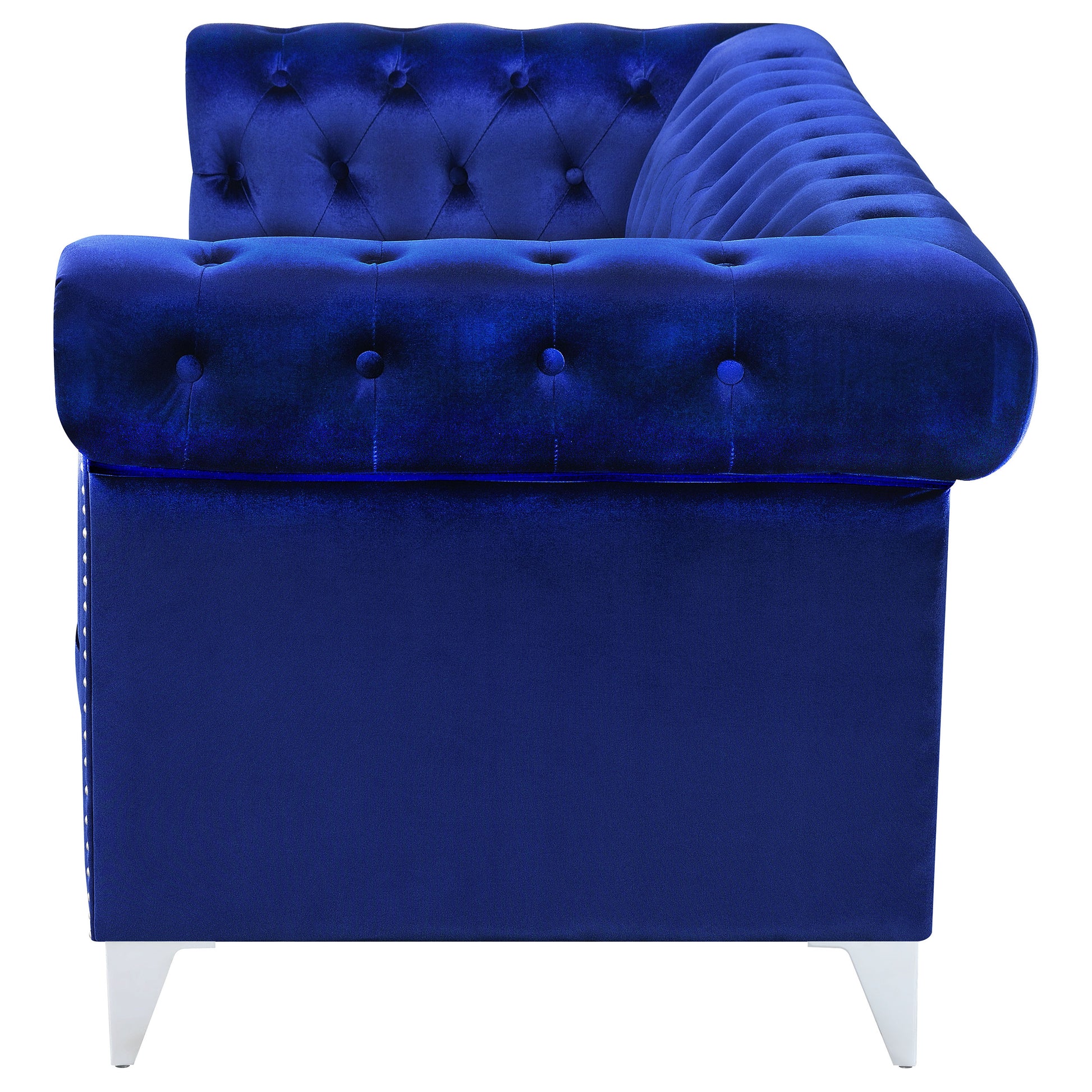 Dazzle and delight your guests with this exceptional blue sofa. Striking blue velvet upholstery steals the spotlight in your living room, making for a soft and comfortable seating arrangement. Gorgeous tuxedo arms flaunt stylish nail head trim. Button tufting makes for the perfect upgrade for this piece, adding another level of elegance. This blue sofa is supported on chrome tapered legs.