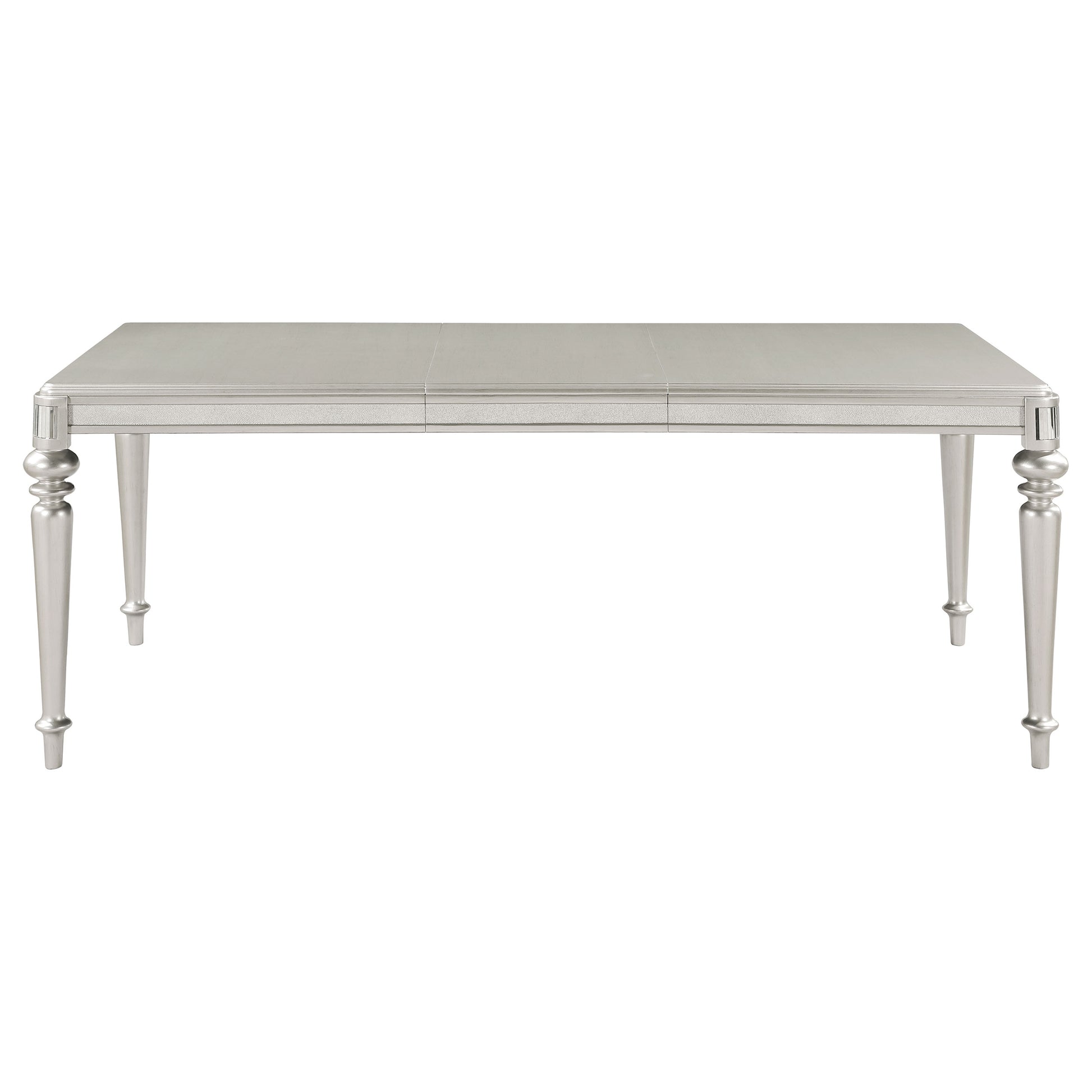 Add glamor to family gatherings around the dinner table with this stunning 5-piece set. Rectangular table is fashioned from rubberwood that's durable and reliable. It also has an extension leaf with all wood glides to accommodate the ultimate dinner party. Four sumptuous side chairs come upholstered in metallic leatherette with button-tufted backs. Entire set is finished in a brilliant platinum metallic with a magnificent hand-applied glaze.