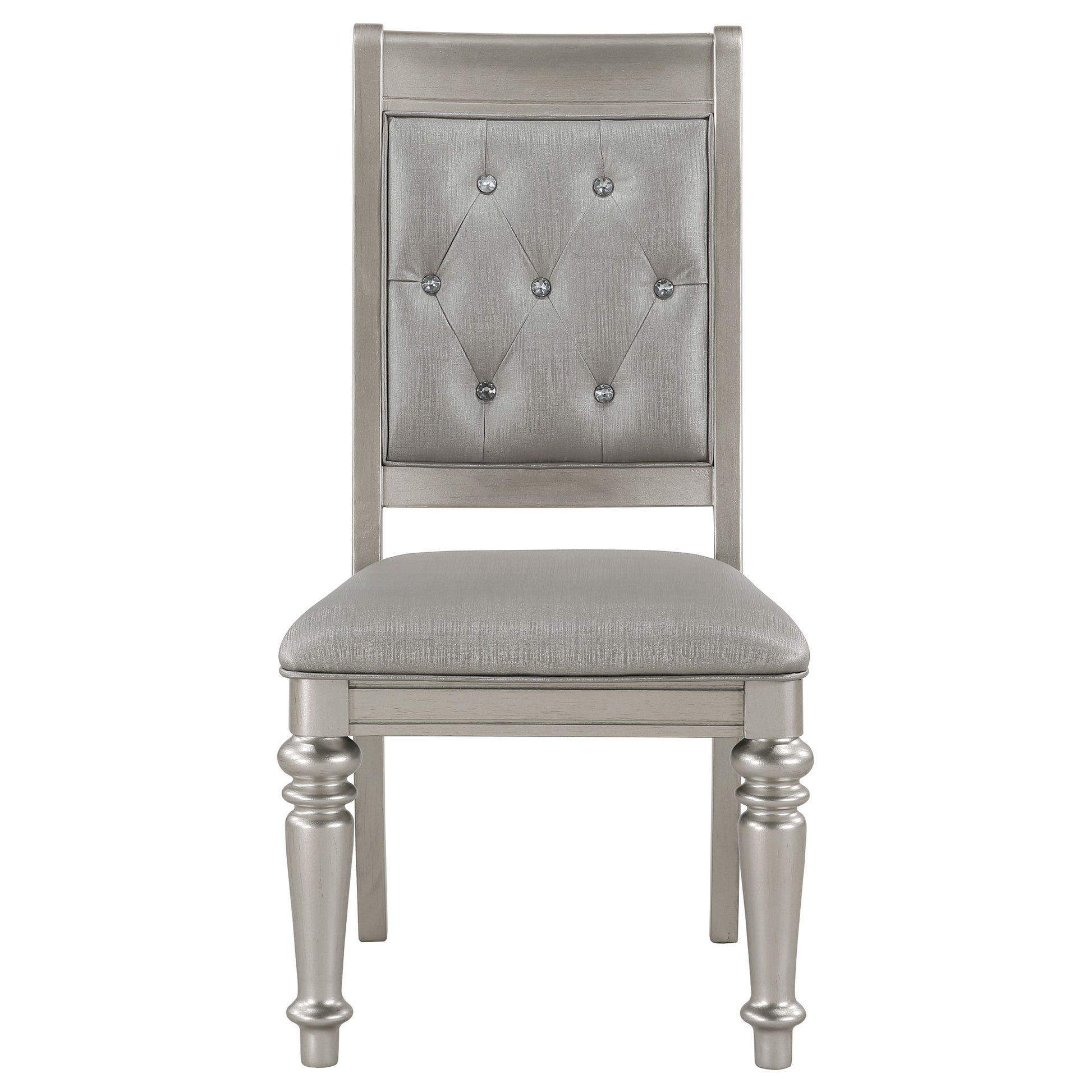 This magnificent 7-piece dining set will add a glamorous touch to the dining room. The rectangular table is crafted from sturdy, durable rubberwood that will stand the test of time. Table can accommodate a larger gathering when the extension leaf with all wood glides is pulled out. Four luxurious side chairs and two similarly plush armchairs feature metallic leatherette upholstery with button-tufted seat backs. Each piece in this splendid set is finished in platinum metallic with a hand-applied glaze that's simply breathtaking.