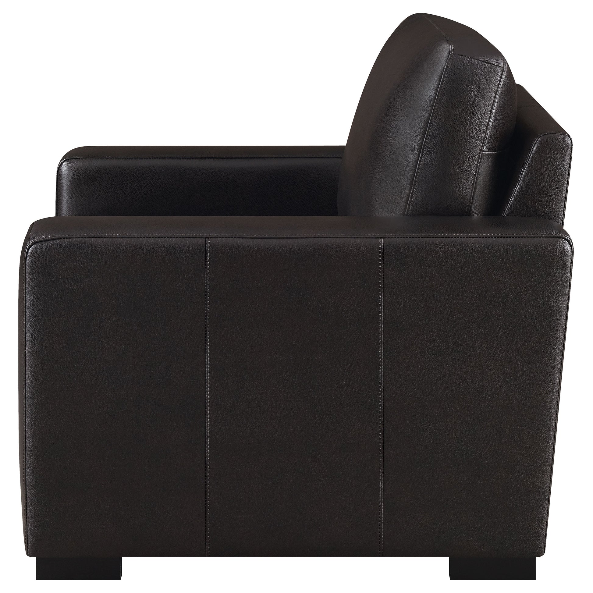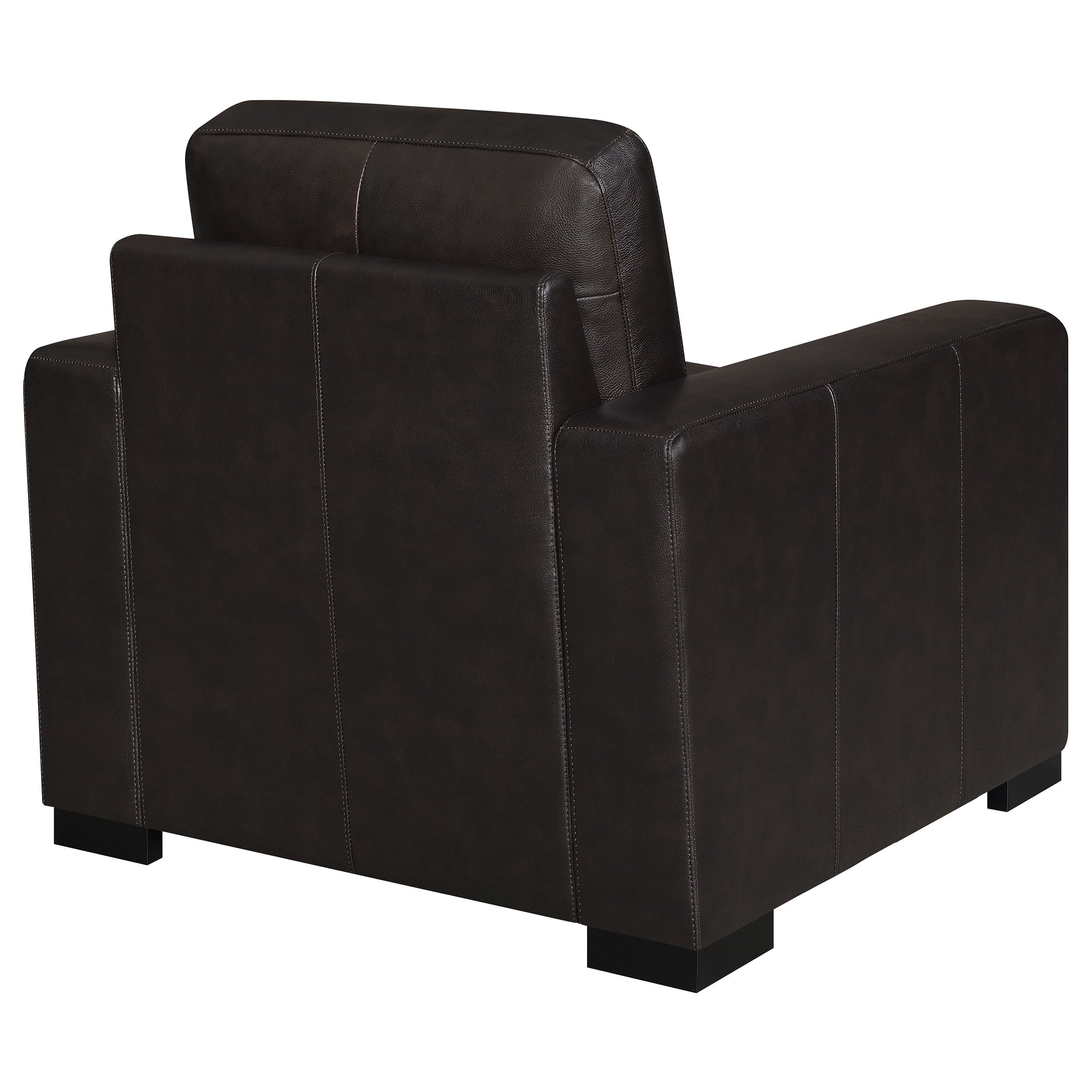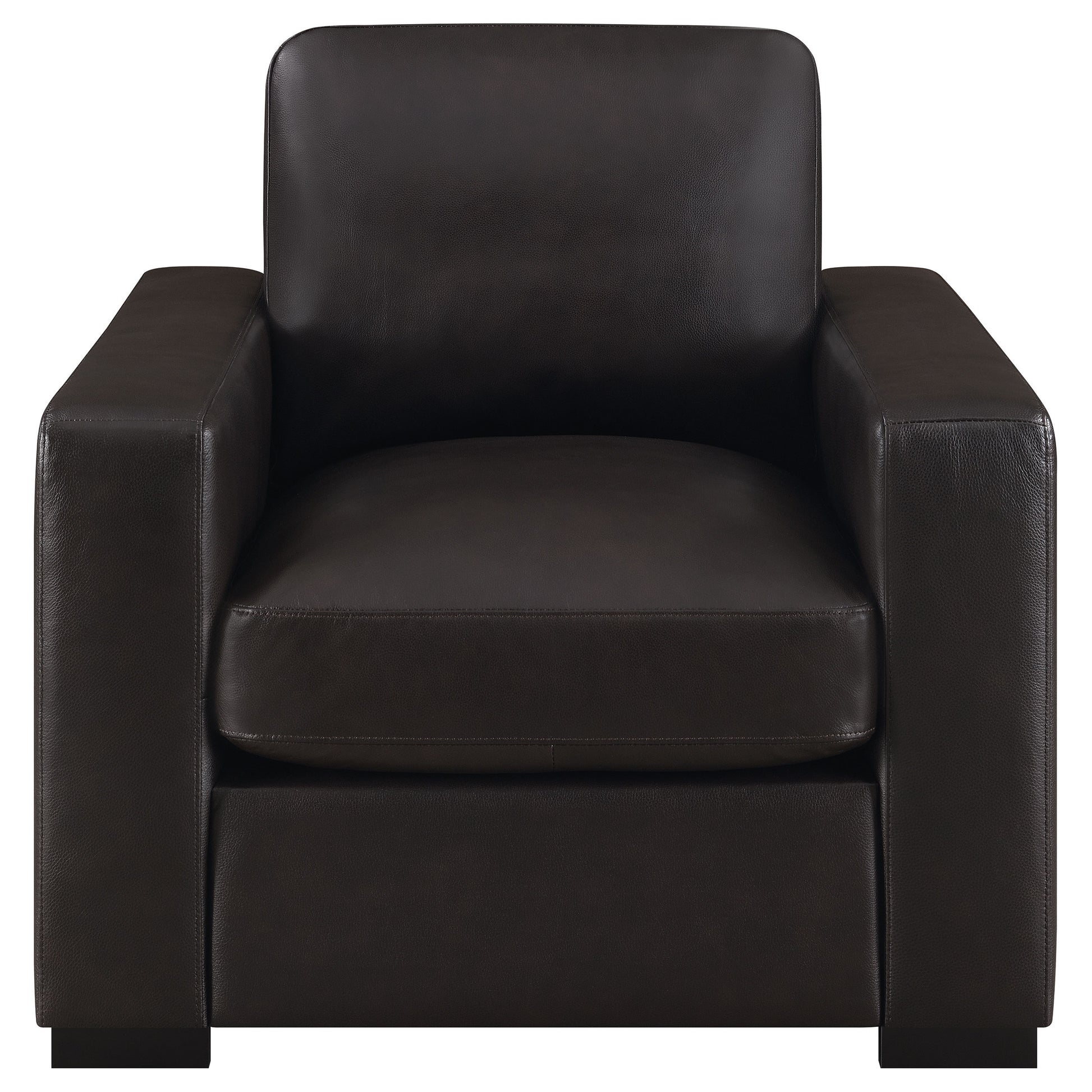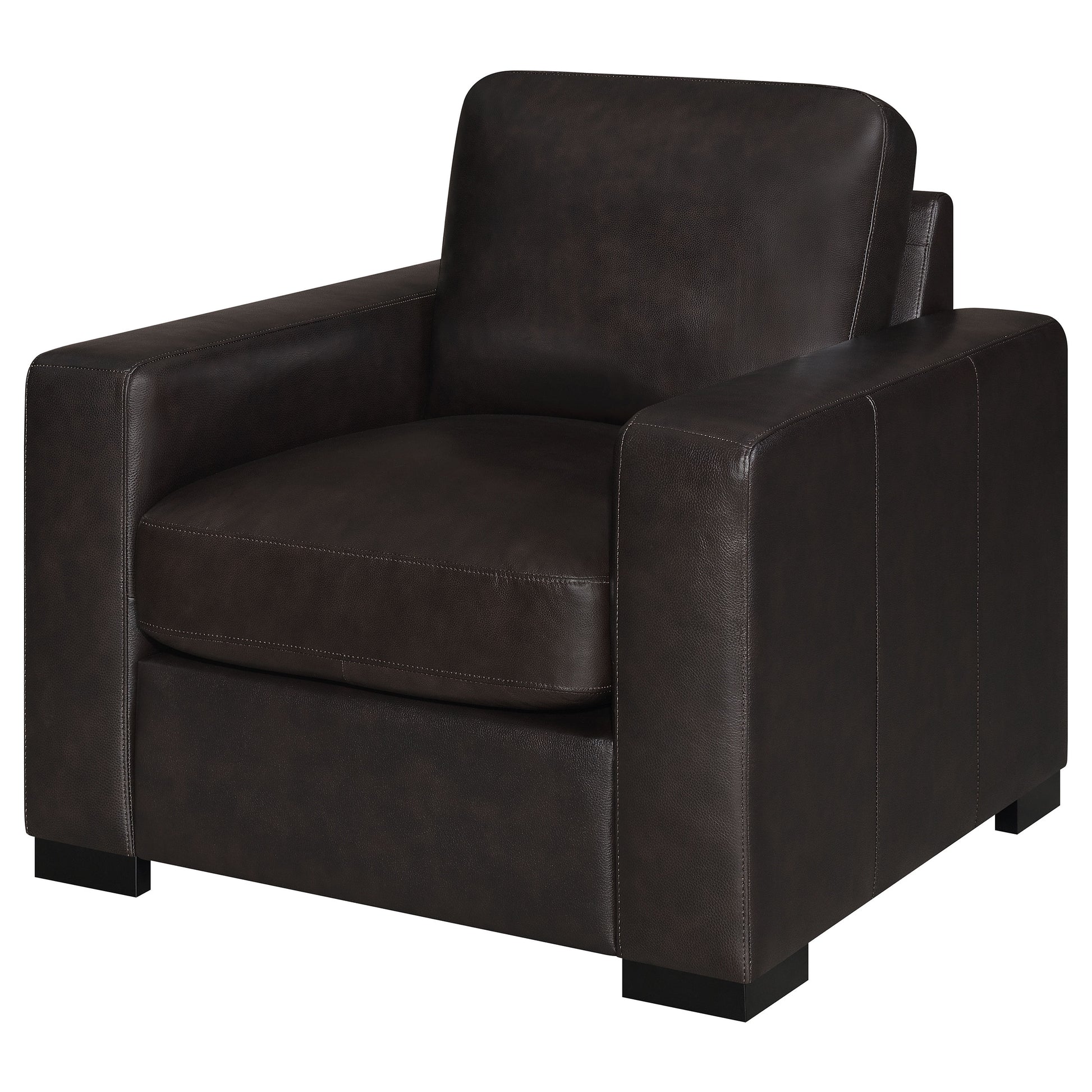 A modern style dark brown armchair is ready to enhance your living space. Made from luxuriously soft top grain fabric, you'll instantly feel like curling up with a book. Track arms provide additional comfort while vertical stitching enhances its style. Down-filled cushions will make this armchair the new favorite seating spot in the house. Easily remove the cushions when it's time for cleaning.