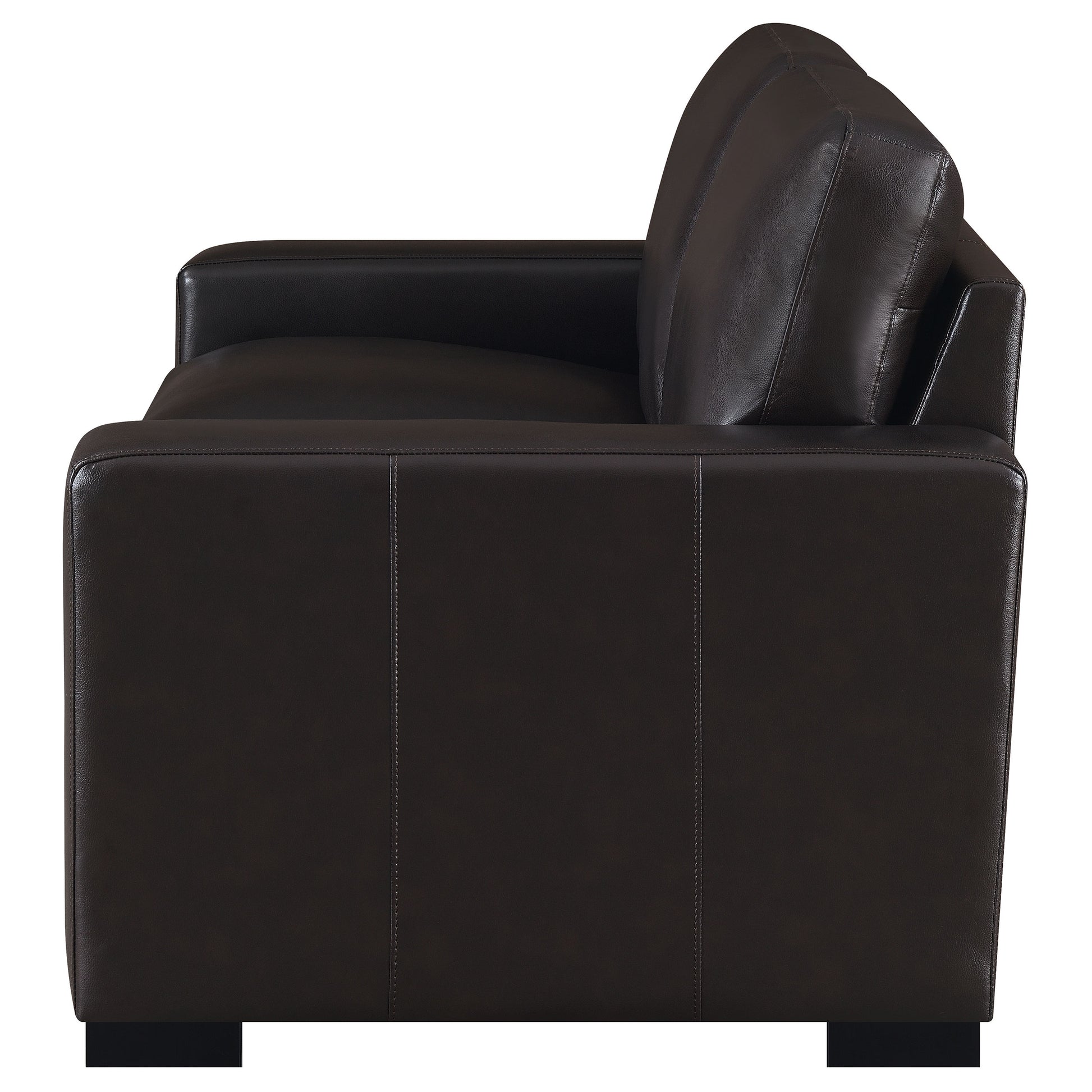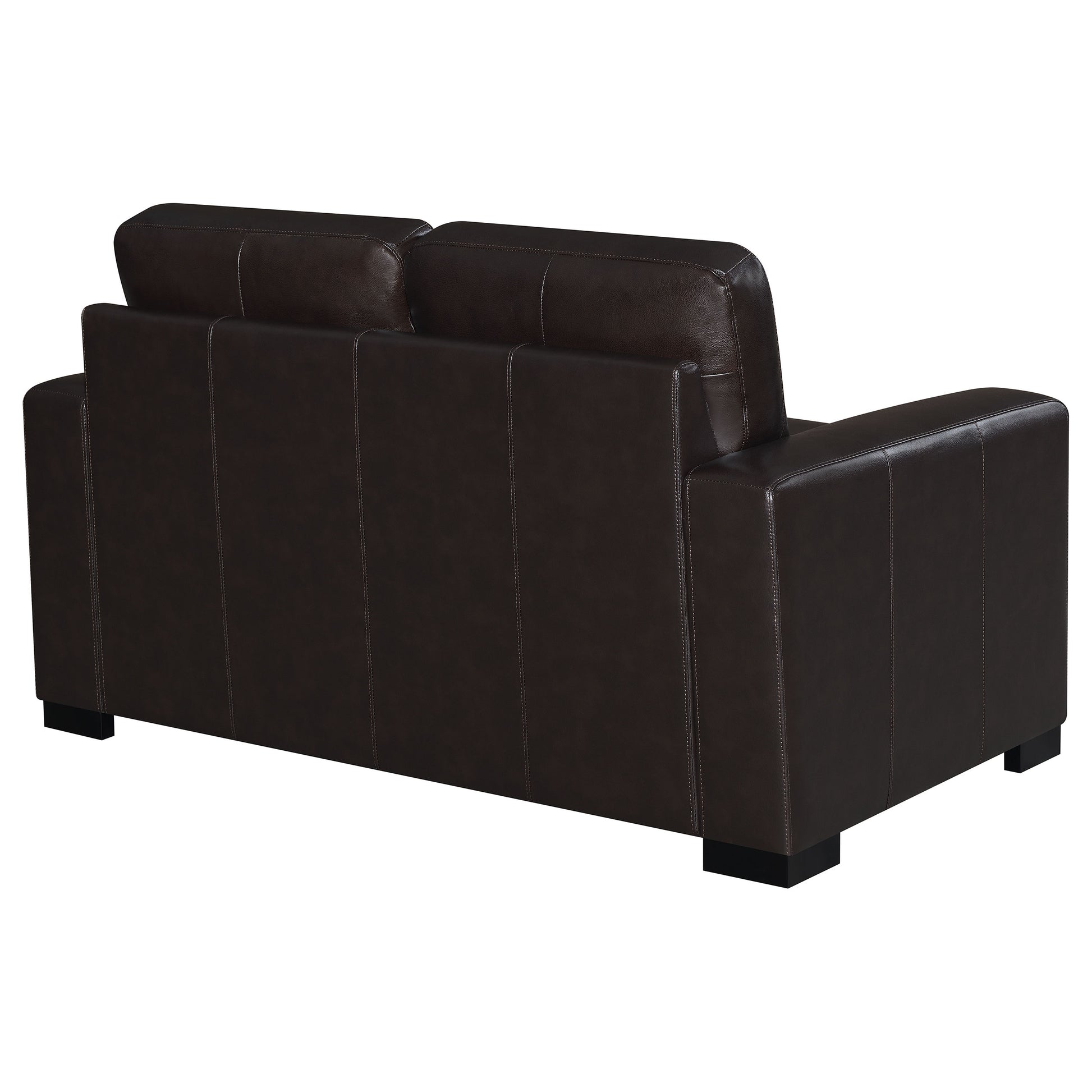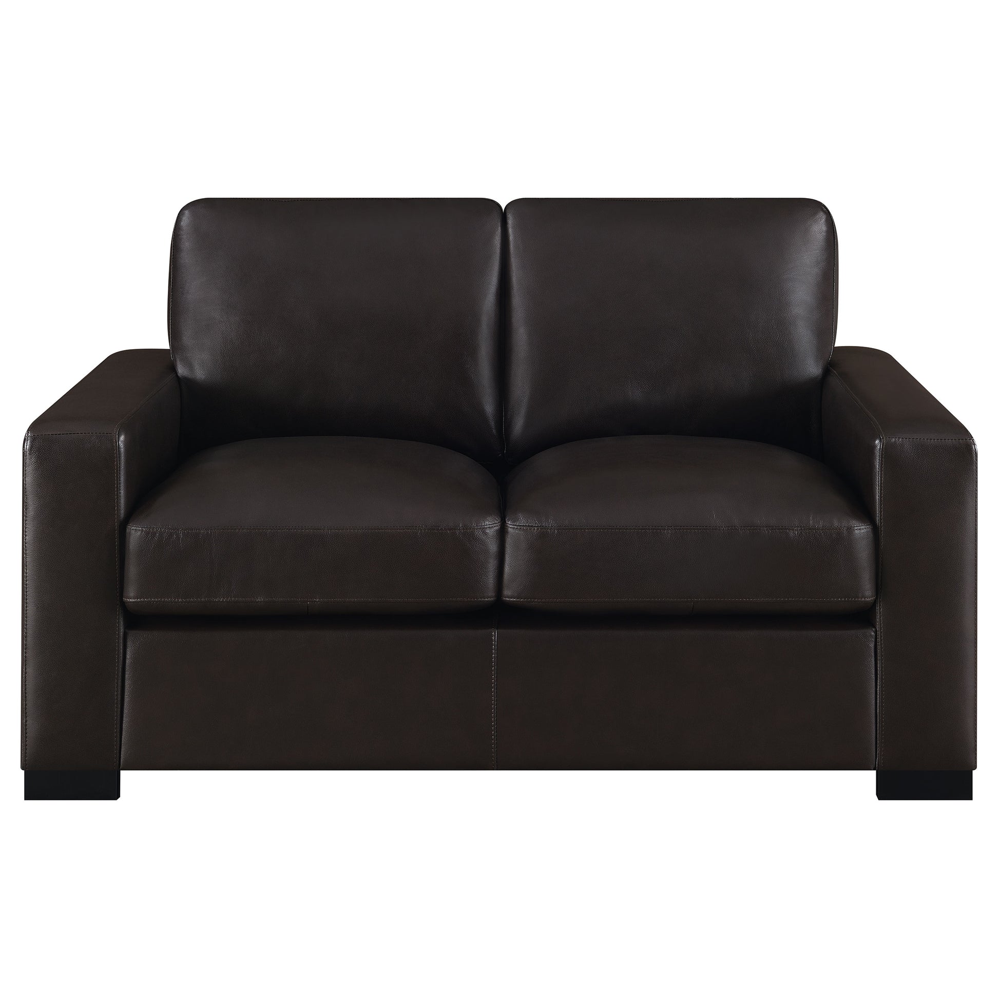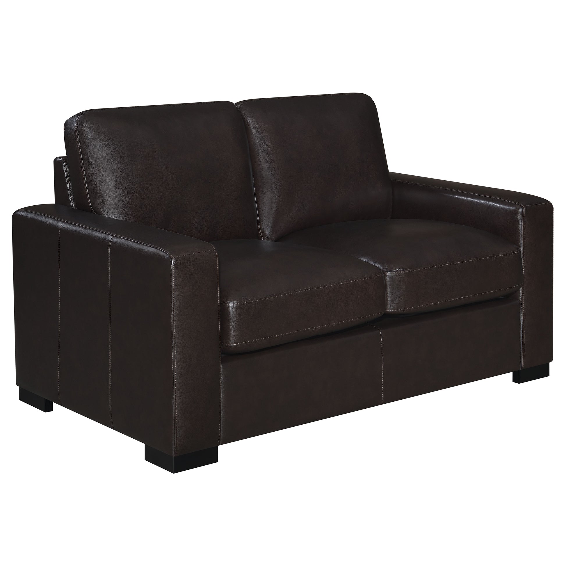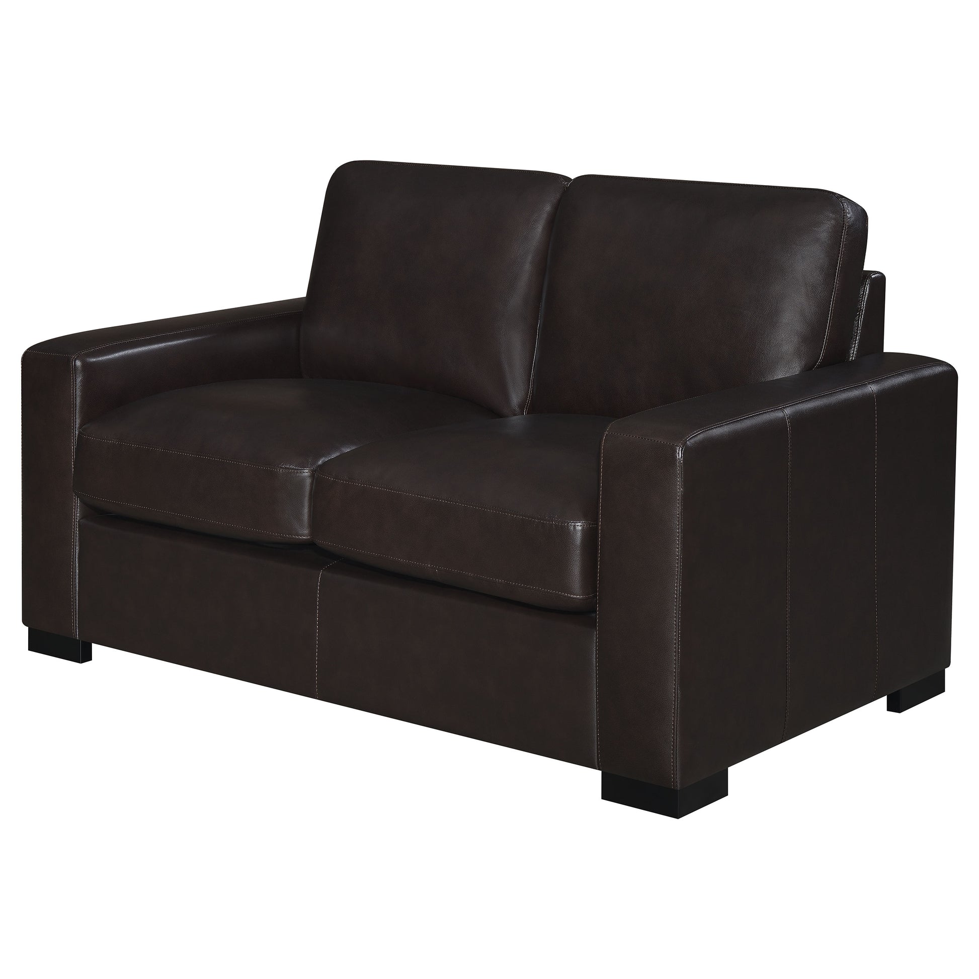 Create your dream living room with the addition of this dark brown loveseat. Top grain leather provides a luxuriously soft feel for this piece, ready for you to enjoy movies or a good book. Track arms provide a comfortable place for lounging along with the down-filled cushions. With vertical stitching on the frame, this loveseat is wonderfully modern in style. Easily remove the cushions as needed for cleaning.