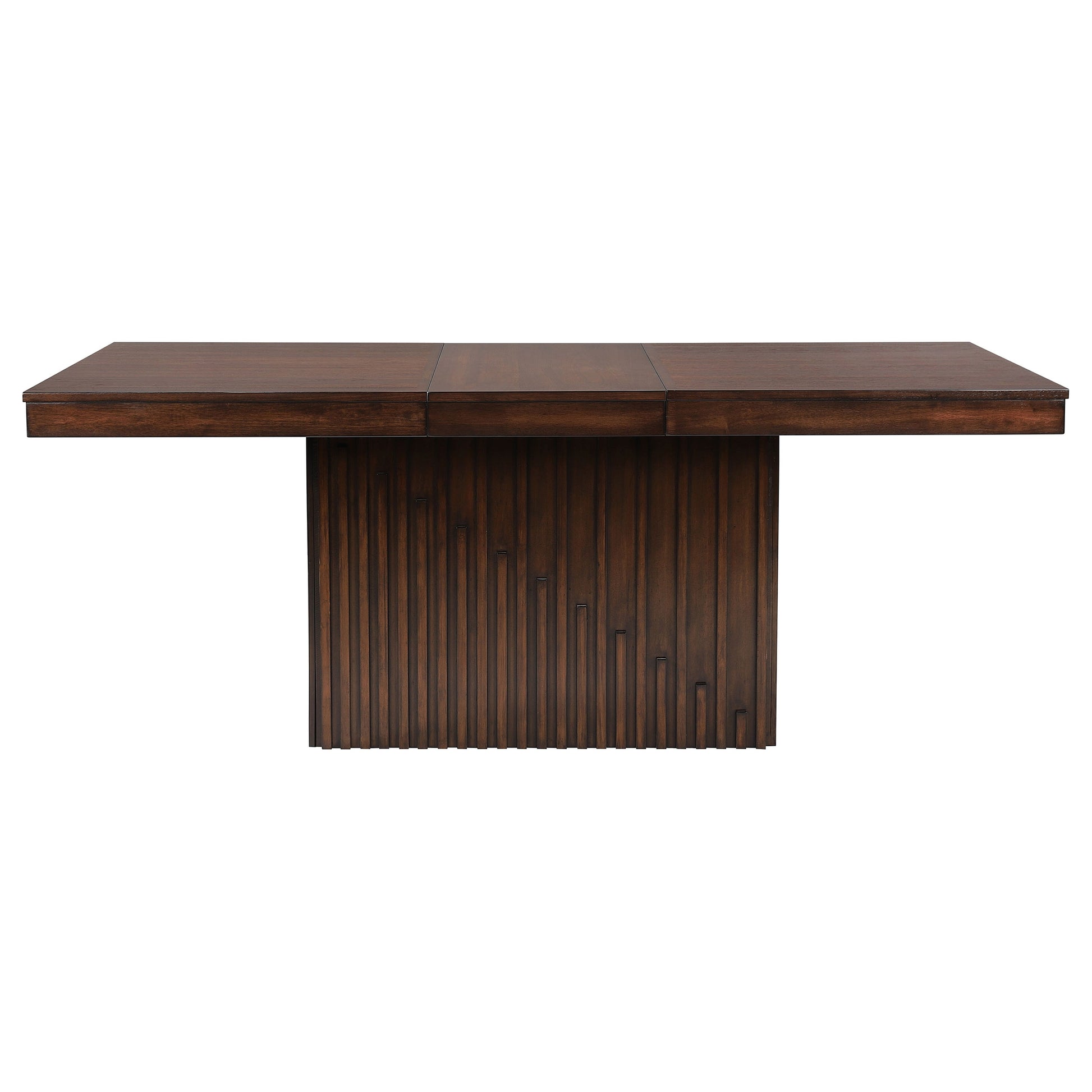 Imagine hosting family gatherings at the holidays and dining with friends around this charming, contemporary seven-piece dining set. Its modern look is established with a robust pedestal base complete with a decorative slat pattern. Its deep, rich mango oak wood grain finish is a lovely complement in casual and more formal spaces, and the table is equipped with an expansion leaf perfect for guests. Chairs are included, offering a padded seat with light brown upholstery, and a slatted back with a gentle curve for extra support and comfort. The set delivers a cohesive, artistic look and feel to center your dining space with both energy and soothing, welcoming ambiance.