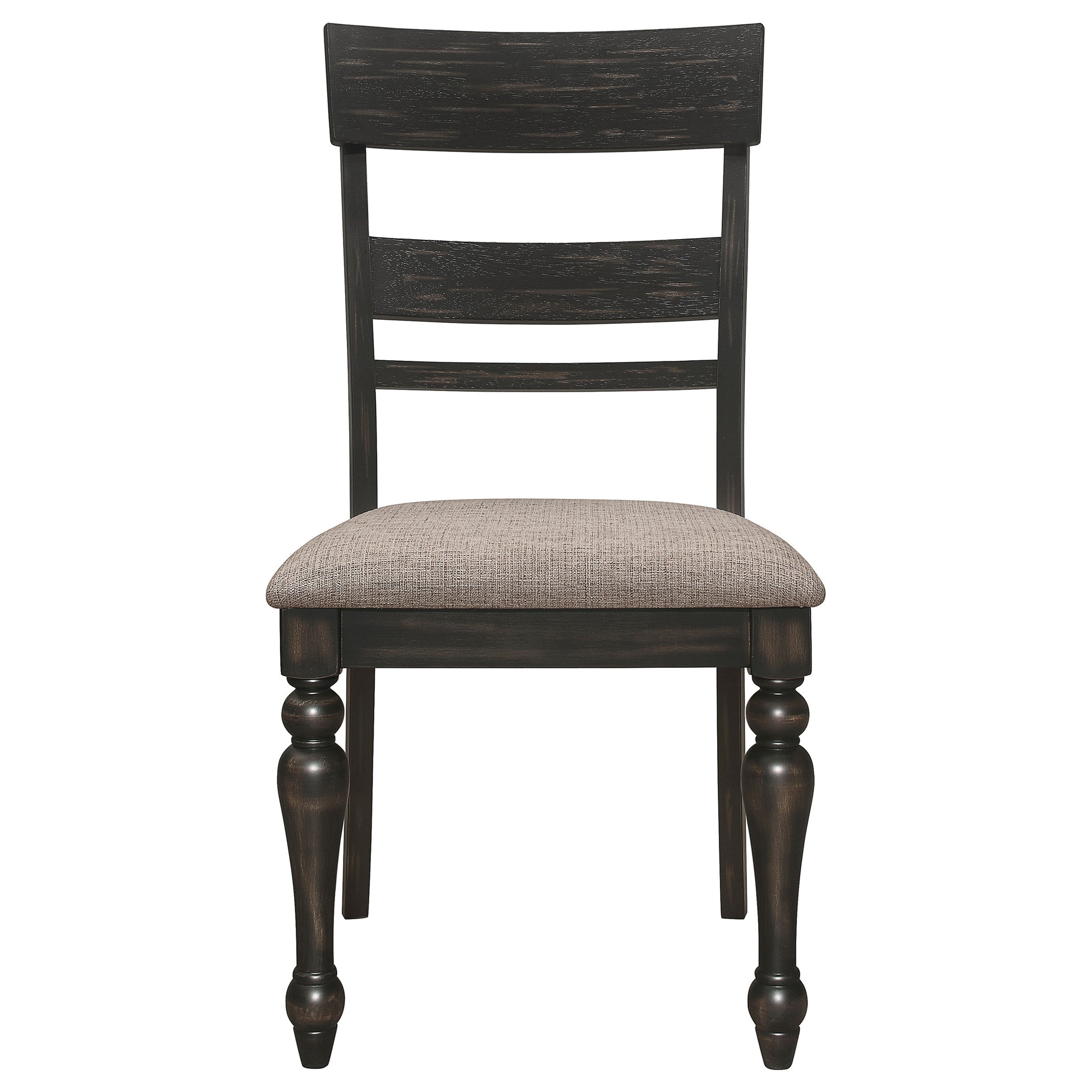 This set of two dining side chairs defines the classic traditional aesthetic with an extra dose of bold, opening up multiple options for assembling a dining space you’ll come to love. Rubberwood and wood products construction is sturdy and stable, reflecting the best of old-style quality. With a dramatic charcoal sand through finish and notable farmhouse-inspired details that include a flared back silhouette, a ladderback design, and turned front legs. A lightly curved side silhouette offers tapered back legs. Dine or relax with comfort in padded chairs featuring textured light stone brown fabric upholstery.