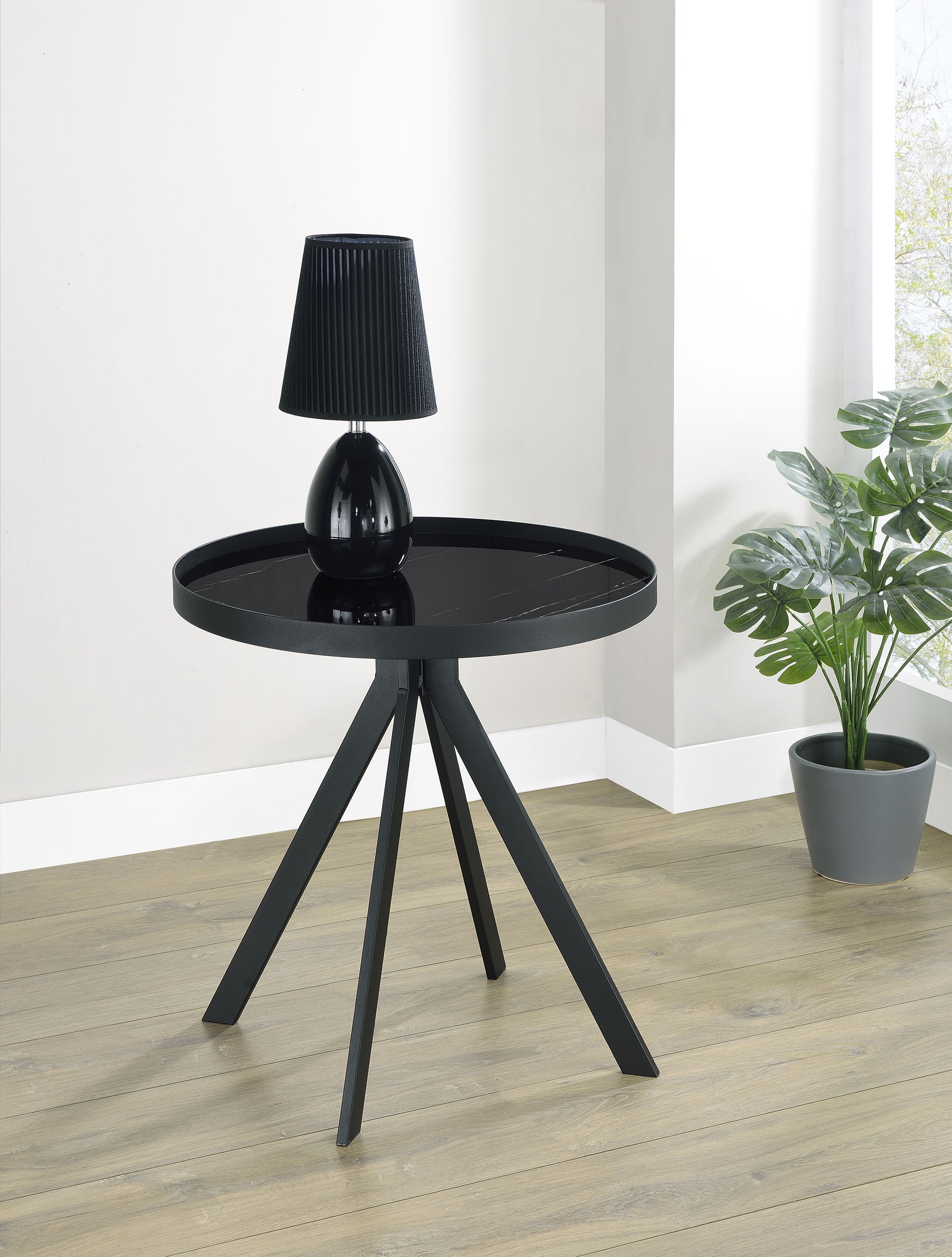 This modern round end table combines durability and elegance with its tempered glass top featuring a marble-patterned print. Supported by a sturdy four-legged metal frame, its minimalist design adds sophistication to any room. Perfect for use as an accent table in living rooms, bedrooms, or offices, it blends functionality and style effortlessly while offering a durable surface for daily use.