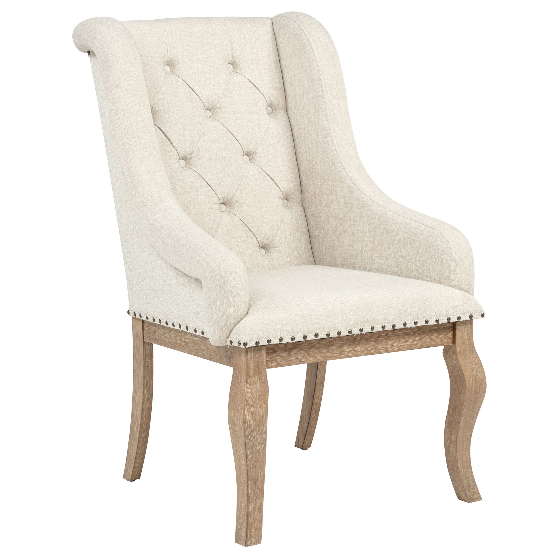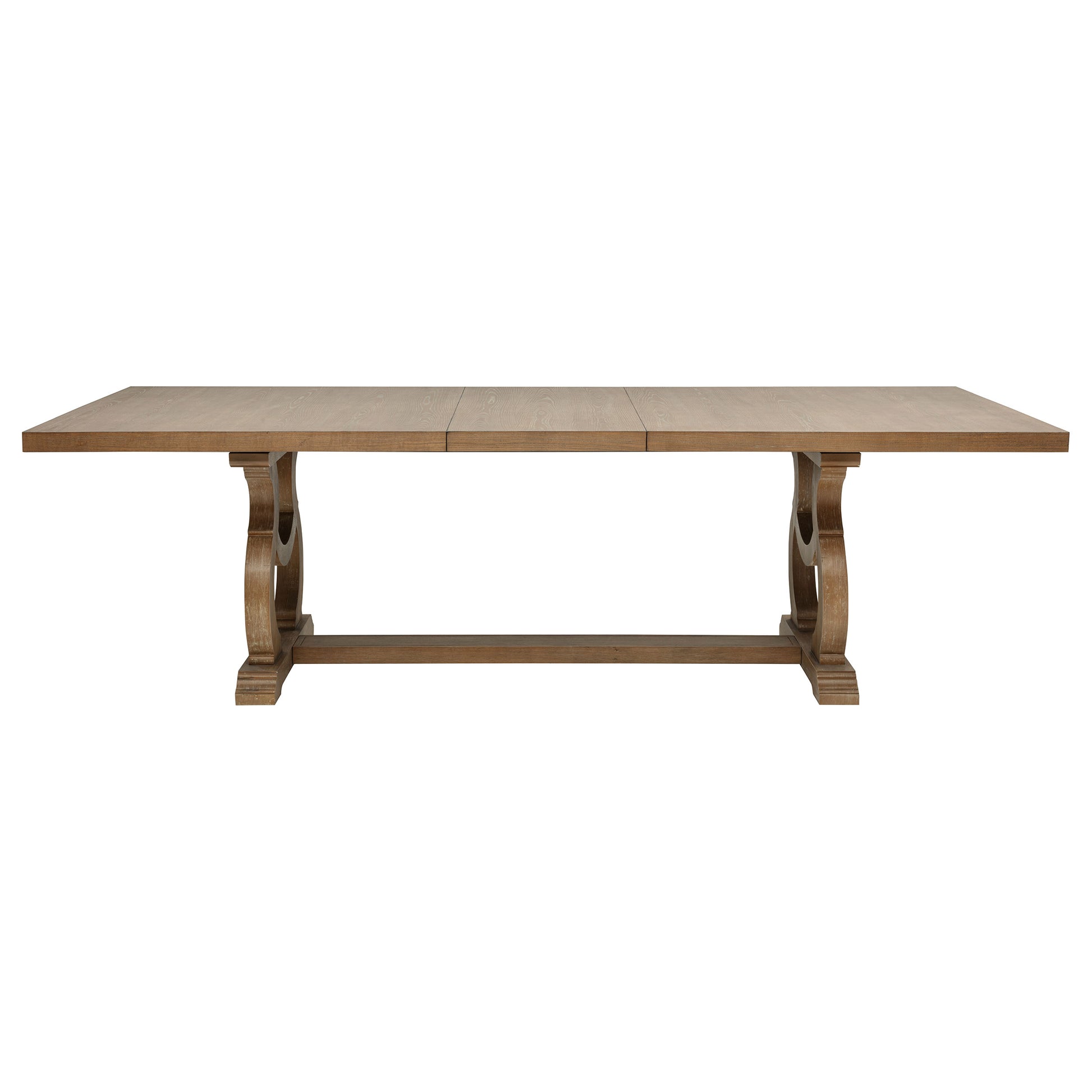 Terrifically transitional with subtle glam details comes this wood and upholstered dining set. Including a 20” removable extension leaf, this beautiful wood dining table is finished in a natural wood color with distressed wood grain accents. The dual pedestal base offers a final touch of traditional appeal. Find gorgeous coordinating dining chairs, upholstered in cream fabric. The dining chairs are adorned with individually applied nailhead trim with cabriole style legs for a finishing touch.