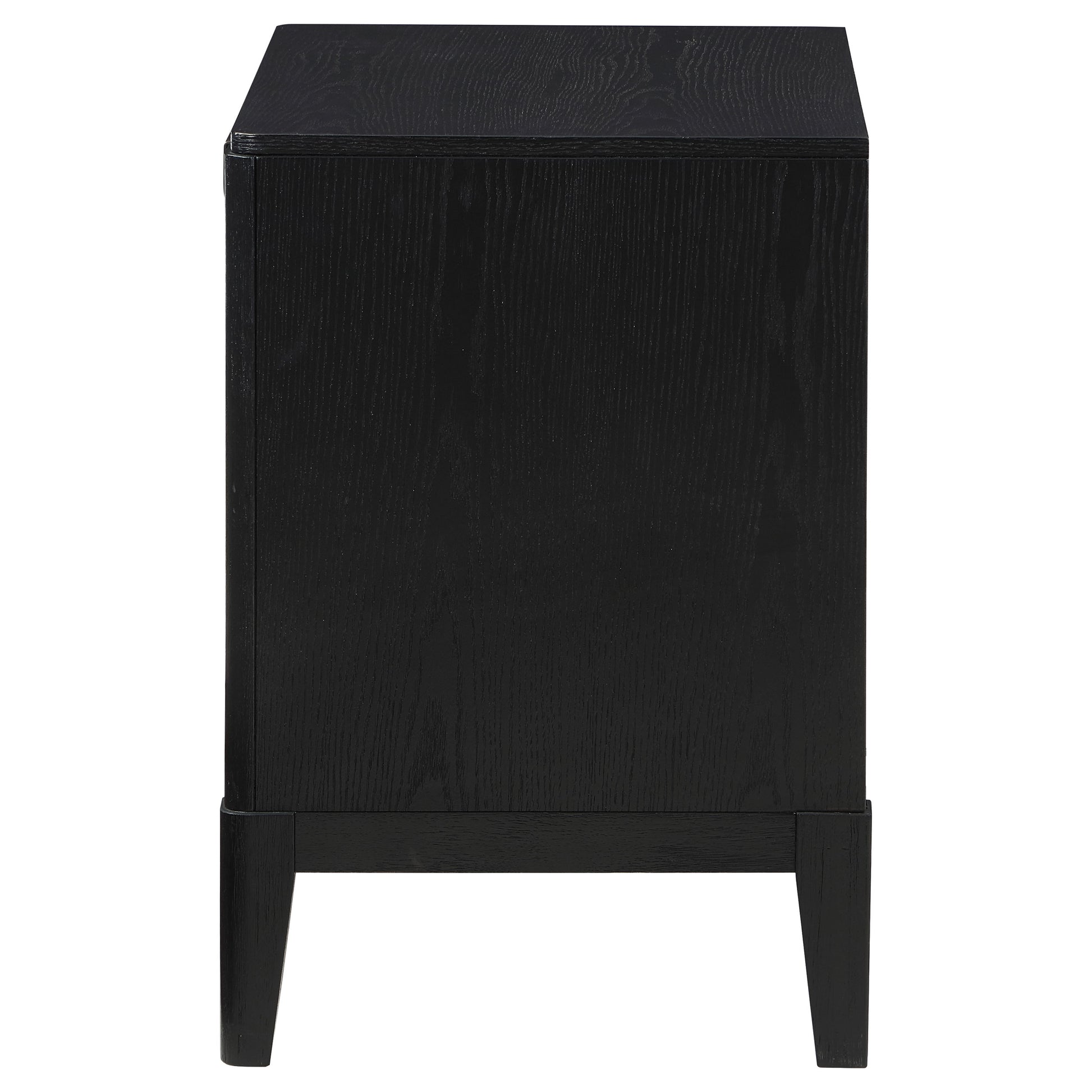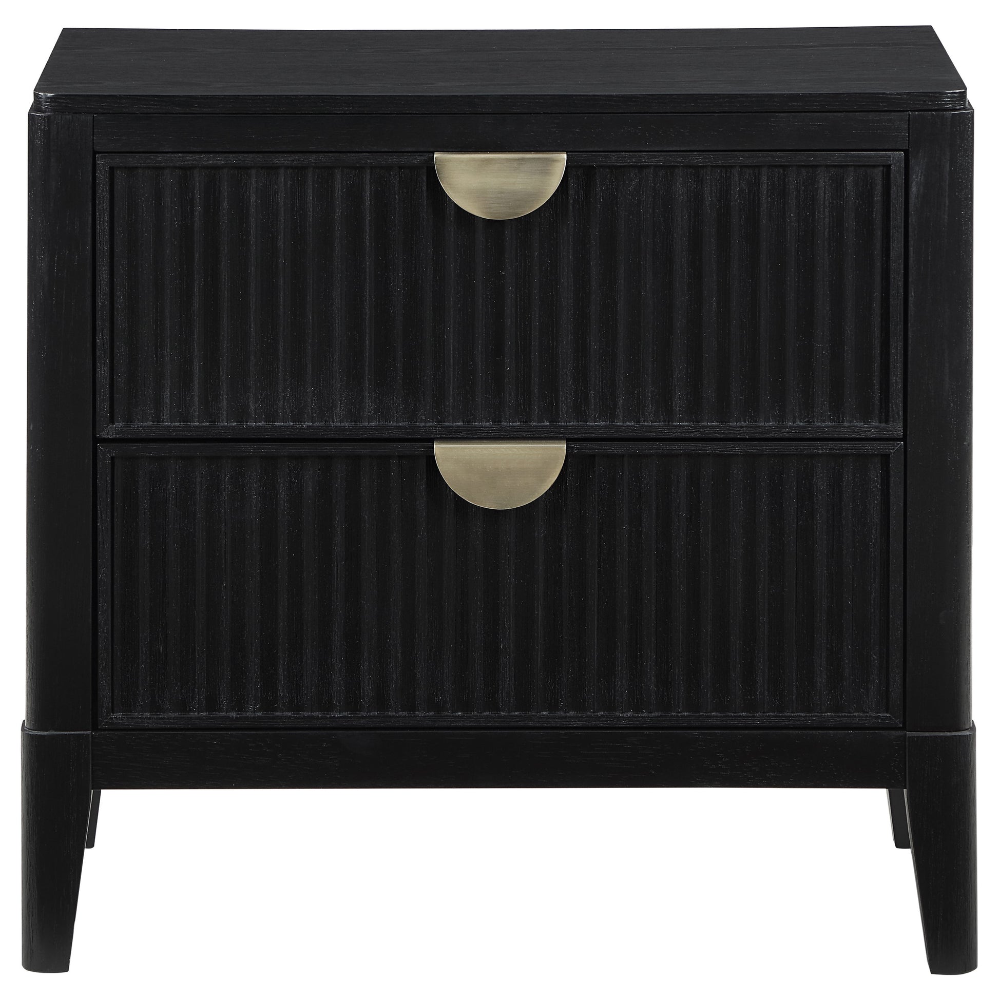Augment your sophisticated bedroom with the addition of a modern two-drawer nightstand. It boasts a classic stance, with two drawers that offer a place for overnight essentials and personal necessities like books. The top drawer includes felt lining while half-moon pulls add metallic contrast with a soft golden hue. Drawer fronts are fluted, offering impressive texture and dimensionality at your bedside. Its black finish is wire brushed, adding the perfect touch of texture and depth.