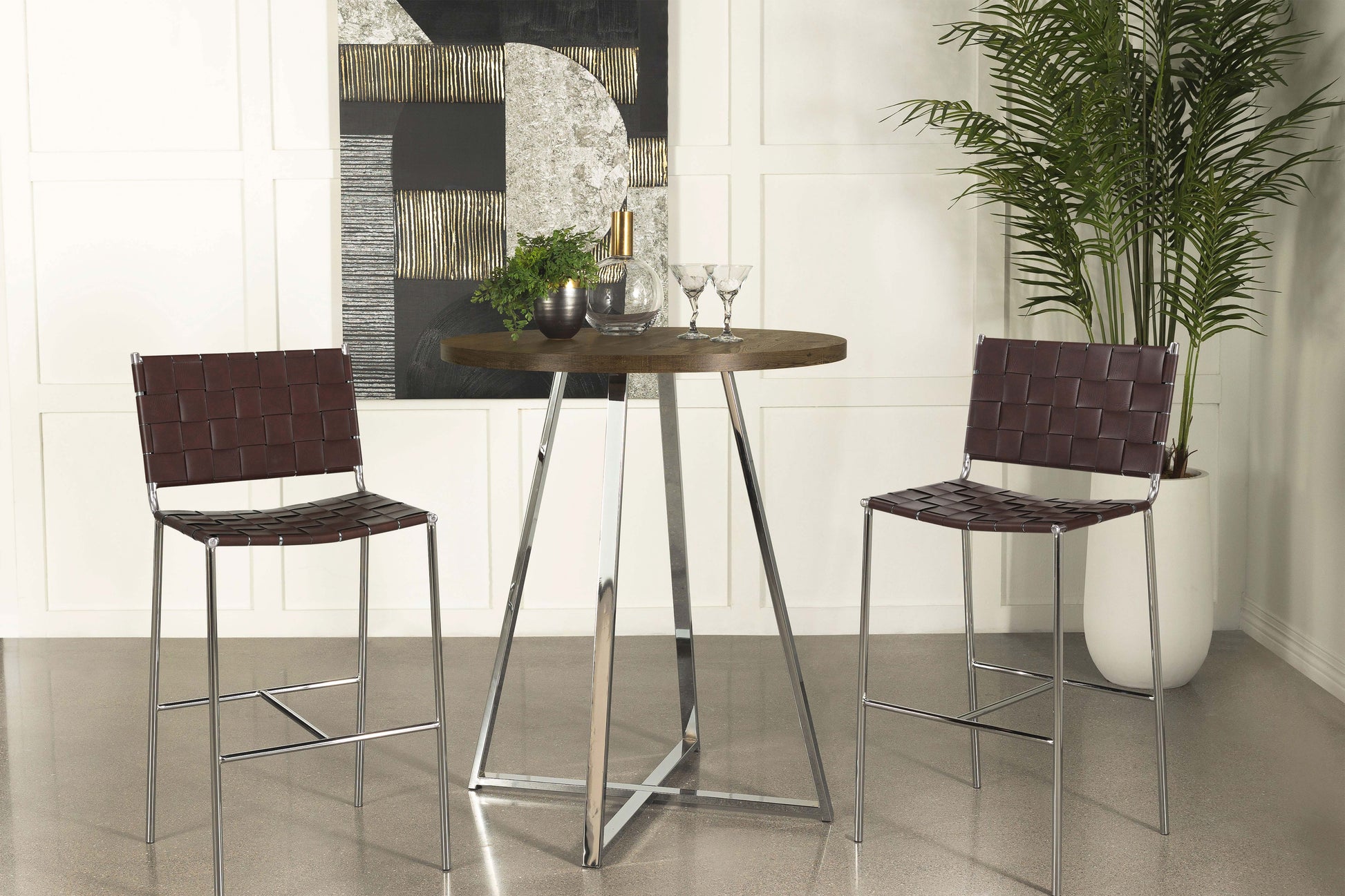 Host your closest friends around this contemporary bar table. Designed with a round, brown oak finished top, this sleek modern bar table invites you stand and converse around or pull up a coordinating rustic-inspired bar stool. Slim metal bars in a bright chrome finish make up the exposed pedestal base silhouette for a metallic accent in your space. Inspired by geometric angles and shapes, the legs join at the bottom, creating an X-shape motif. Place this modern rustic bar table in an entertainment area or home bar for a beautiful statement piece.