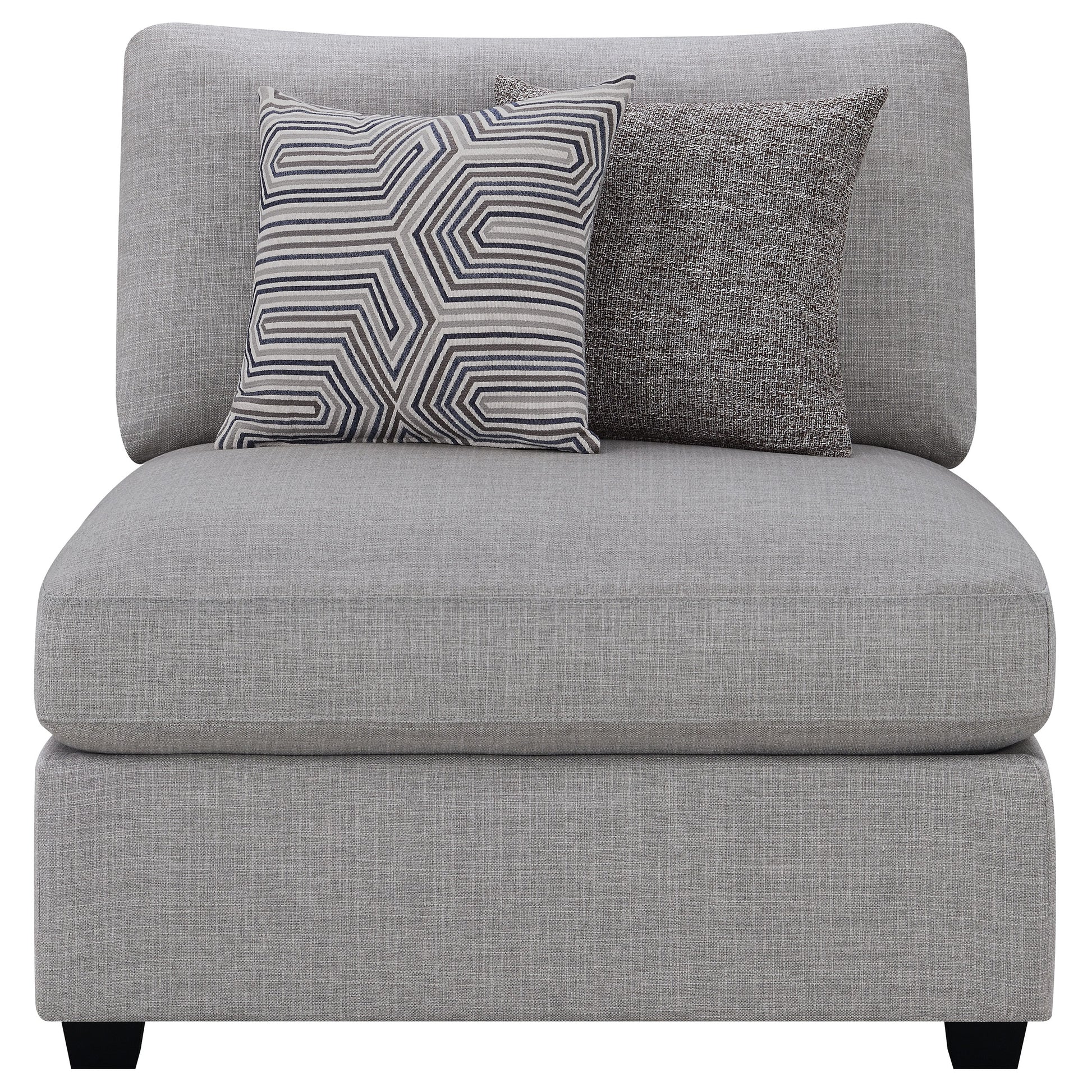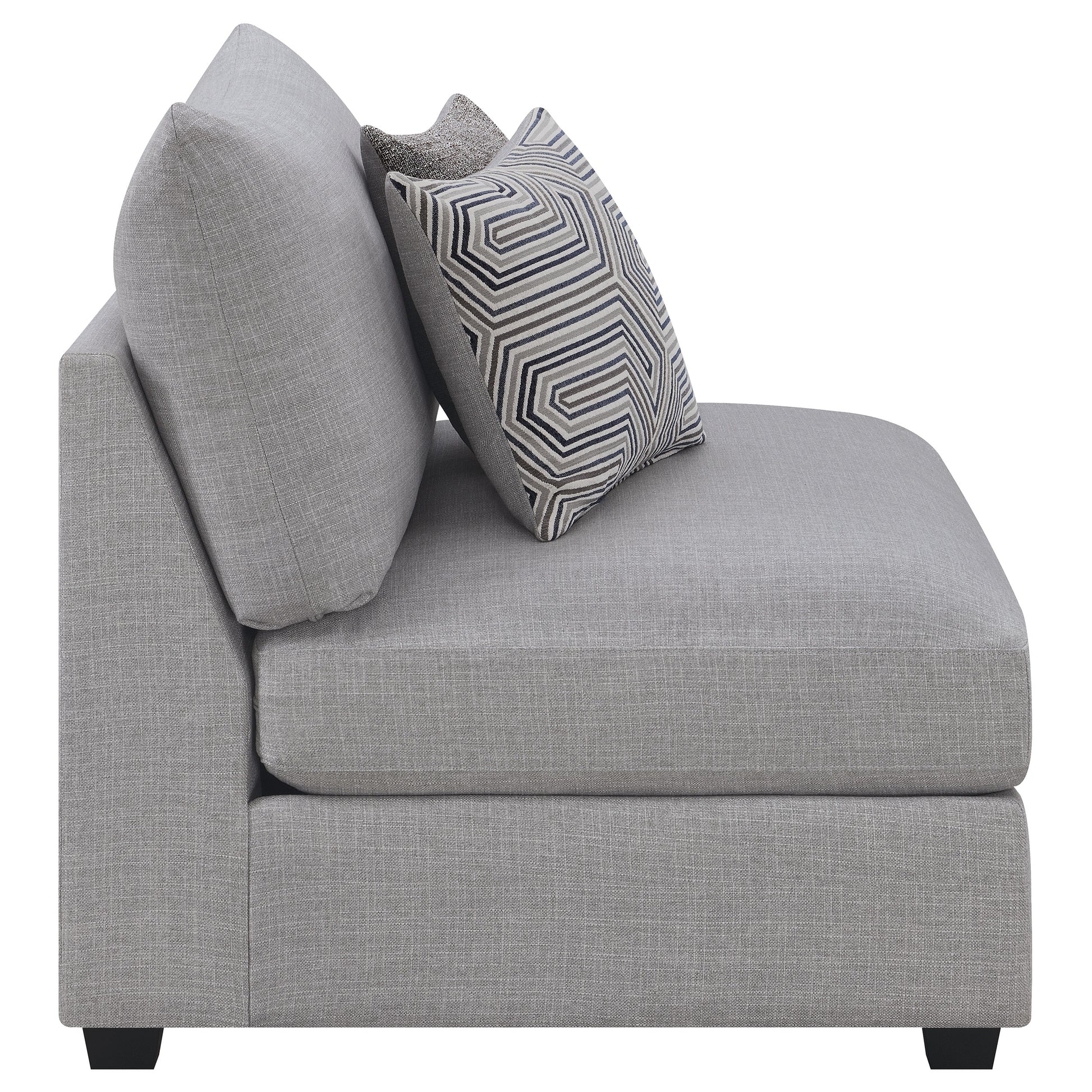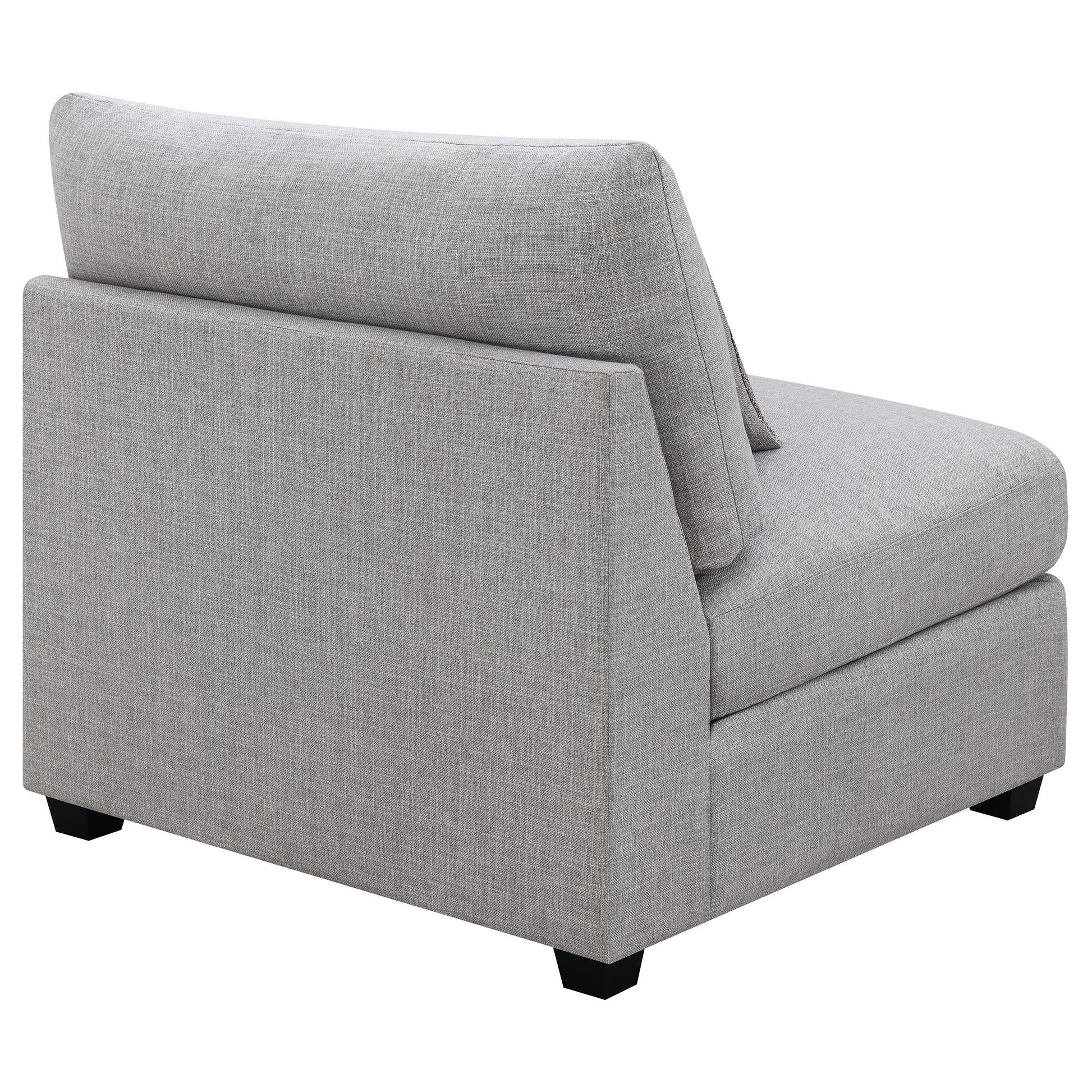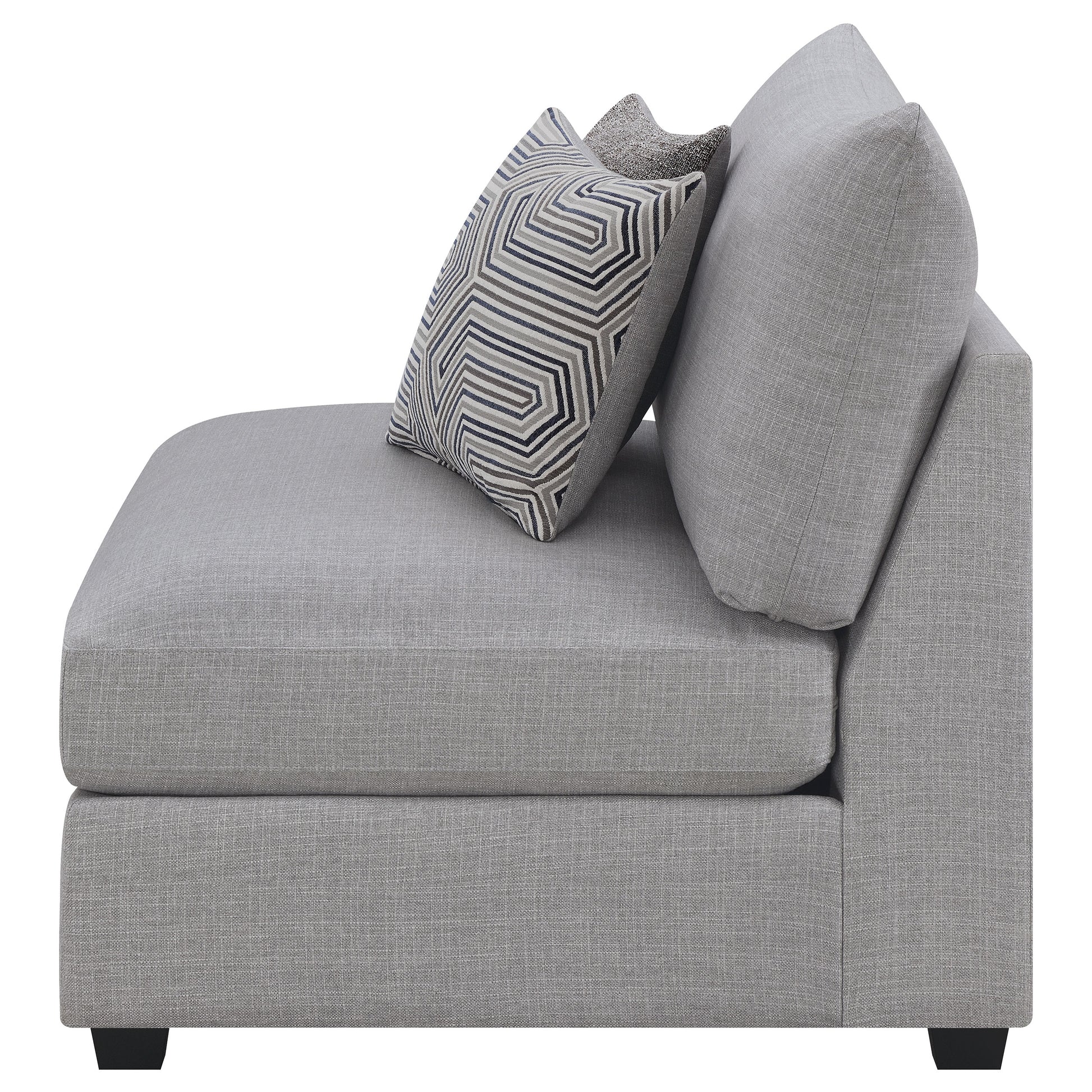 With a simple silhouette, this modern armless chair showcases contemporary design. Great for a neutral or colorful space, the light grey fabric upholstery complements a variety of decor schemes. The modular design allows for a customizable sofa or sectional, ideal for hosts and families. Clean and elongated, the lines on the seat and back cushions mirror each other for an updated feel. Sink into the plush cushioning on a family movie night or game night.