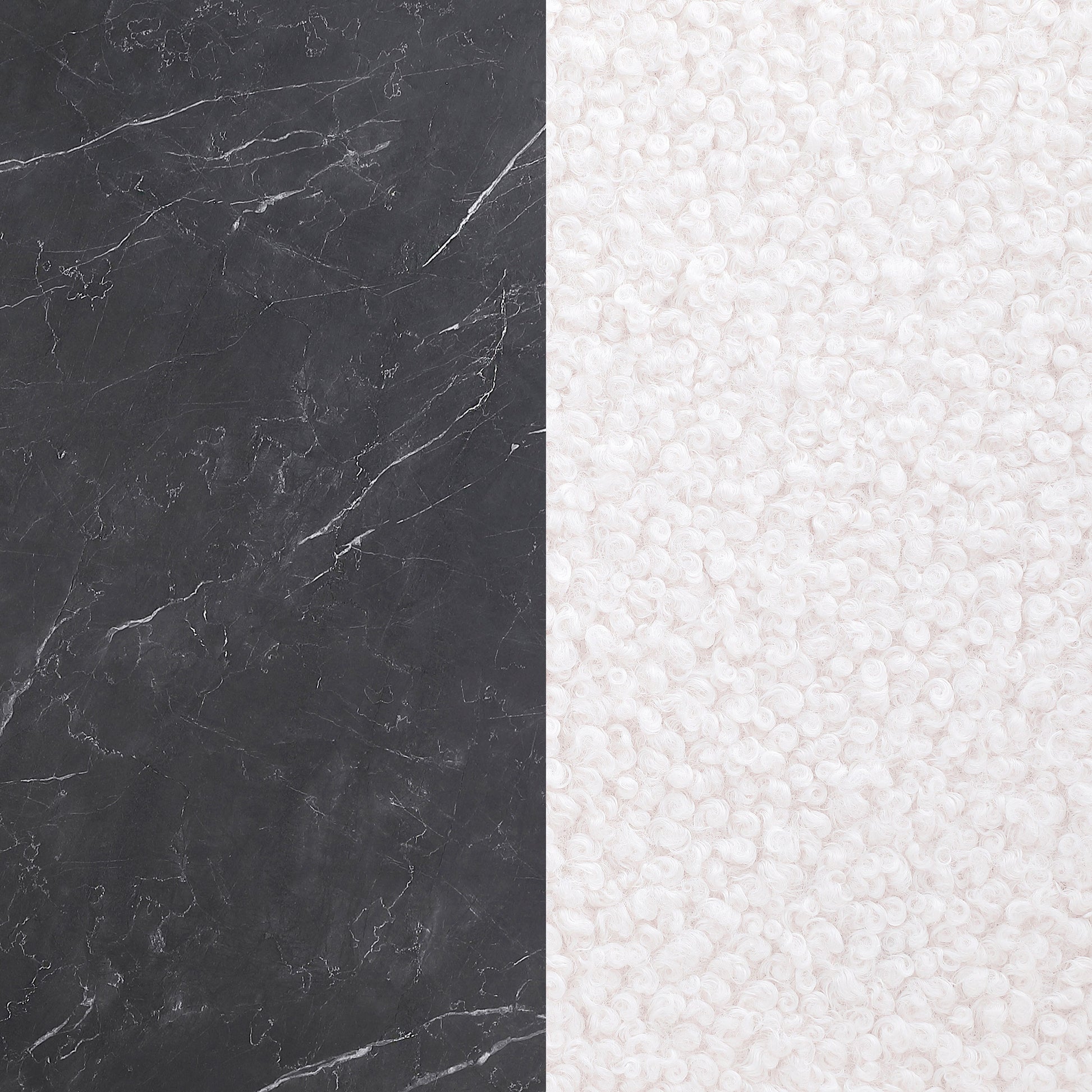 Reimagine your dining room with the fresh, elegant character of a five-piece modern dining set. Centered on a round table with a faux black marble tabletop, the set offers compelling contrast and dimension in a kitchen or dining room. The tabletop is printed black melamine, designed to provide seamless character at an affordable price point. The base of the table is a star pedestal crafted in hammered black metal, offering artistic flair to your space. Four side chairs complete the set, pairing black hammered legs with plush cream upholstery with charming texture and plush cushioning.