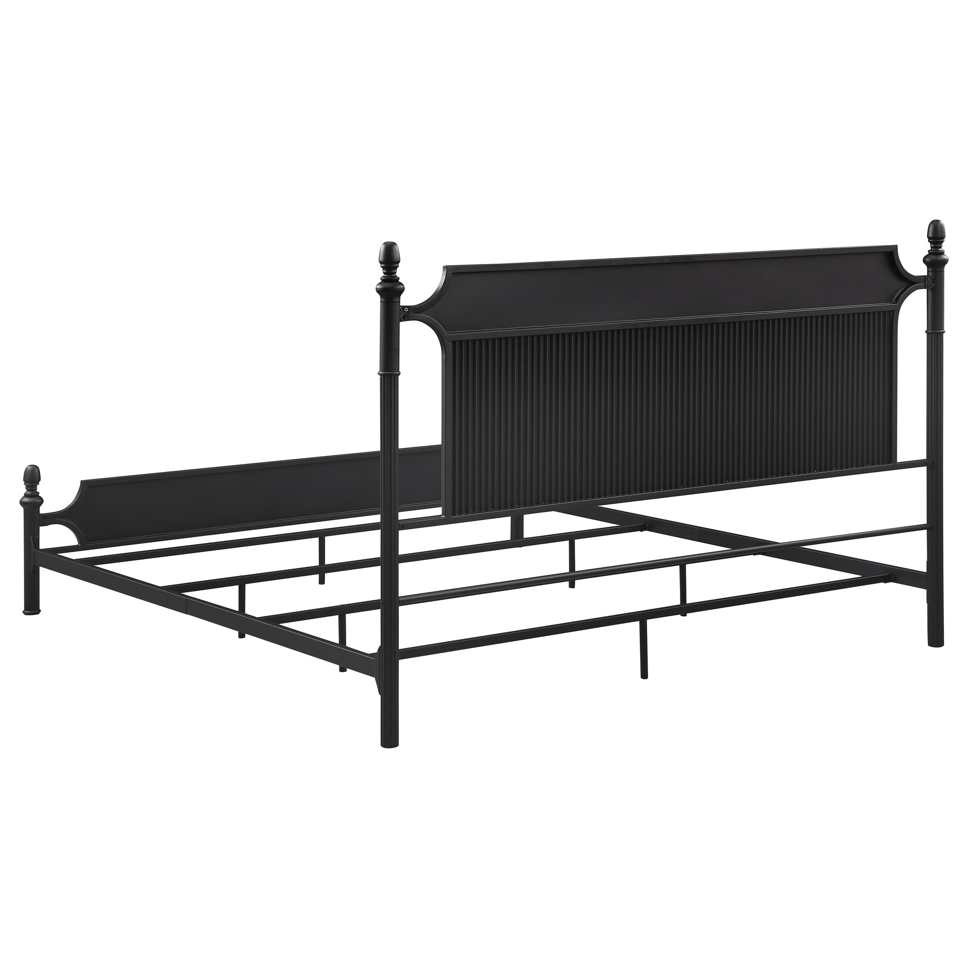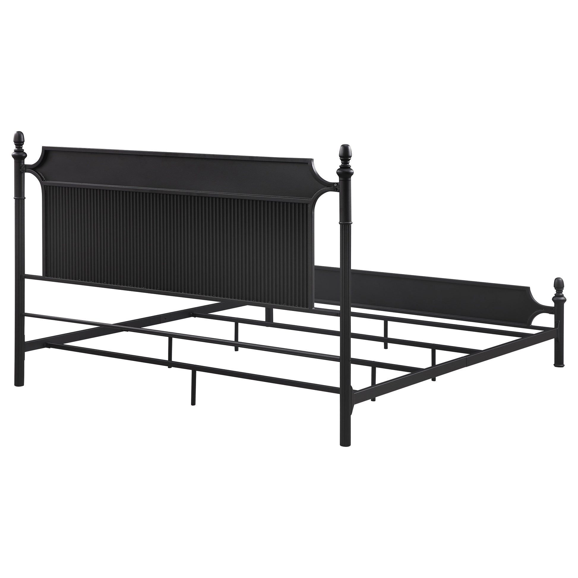 This is a metal bed frame featuring a classic and timeless design. The bed includes both a headboard and footboard, each adorned with turned finial posts that add a touch of traditional elegance. The headboard showcases a vertical ribbed texture, providing visual interest and a subtle contrast against the smooth surfaces of the frame. The black finish lends a sophisticated and versatile appeal, making it suitable for various bedroom styles, from traditional to industrial. The sturdy metal construction ensures durability and long-lasting support, while the open design maintains an airy, spacious feel in the room.