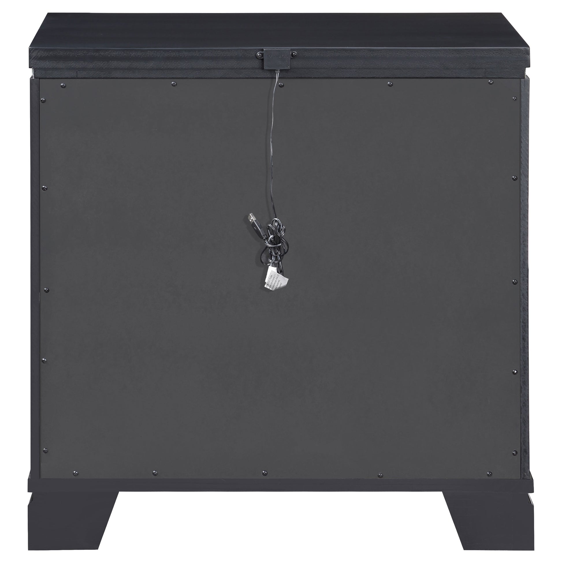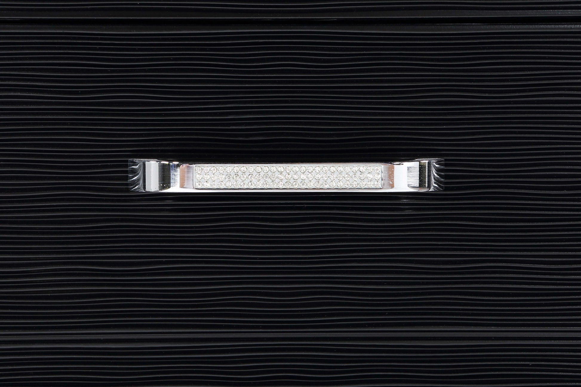 Bold, dramatic hues set the stage for clean lines and luxe details in this glam nightstand. Glimmering accents such as polished mirror trim create a border around the stacked drawers, capped with corner mirror tiles. A dark black finish offsets the polished and sparkling accents, while offering modern sensibilities like USB charging ports and a felt-lined top drawer for delicates. Along the drawer fronts is a wood grain surface that adds a hint of texture. Along the tabletop surface is a crystal-like border, mirrored also in the sleek hardware pulls.