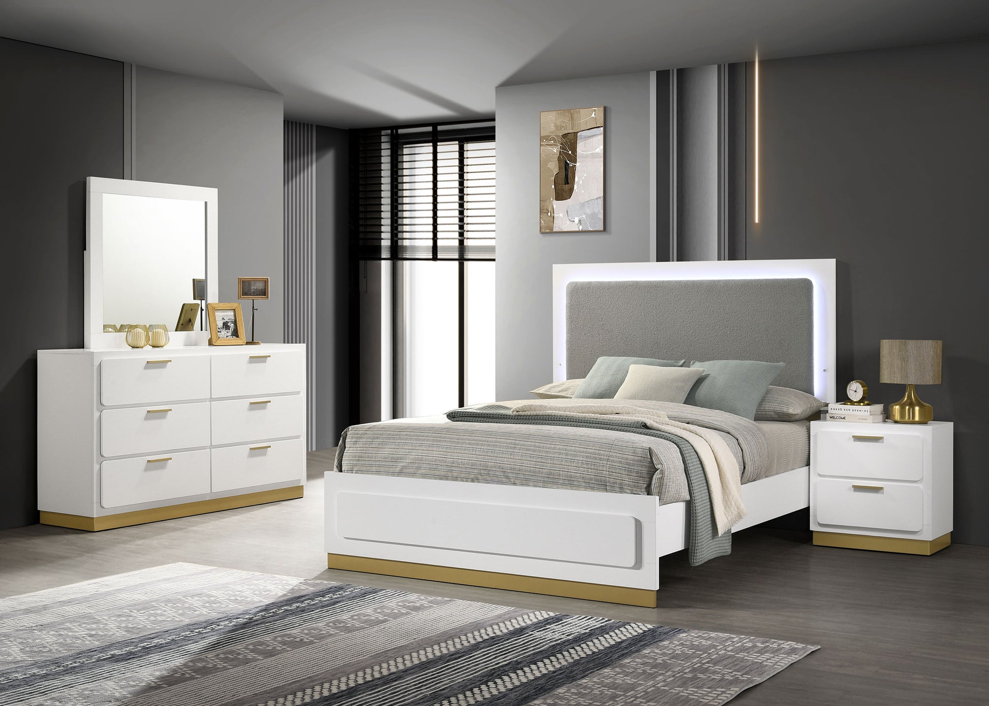 Build a modern bedroom oasis with the chic style and impressive simplicity of a contemporary bedroom set. The set offers abundant storage in various drawers, with a chic two-tone finish complete with bar drawer pulls and metallic kickplates that add dimension. The centerpiece of the set is a streamlined bed design complete with an upholstered headboard. Light gray fabric is lightly padded, offering impressive comfort for lounging. Built-in LED strip lighting surrounds the upholstered panel and is operated with a touch switch for easy, inviting ambiance and a low-profile footboard completes the look with, airy, modern appeal.
