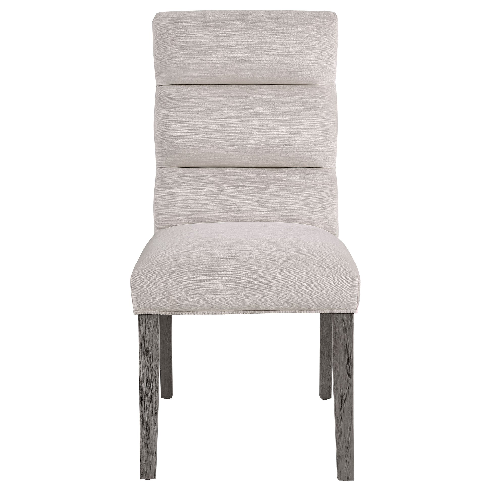 A pillowy look and feel brings ultimate comfort to a casual living space, targeting your kitchen or dining room with a light, floaty vibe, and adding a festive feel. This set of two side chairs checks all the boxes of design, comfort, and easy-living elegance standards you embrace to make a setting fashionable and functional. These chairs feature rubberwood and hickory wood framing, with a cool gray finish over slightly tapered legs. Soft fabric upholstery embellishes a cleverly styled seating unit with an extra-high back and horizontal channeling. A tight yet plump seat provides perfect balance to round out a sleek design.