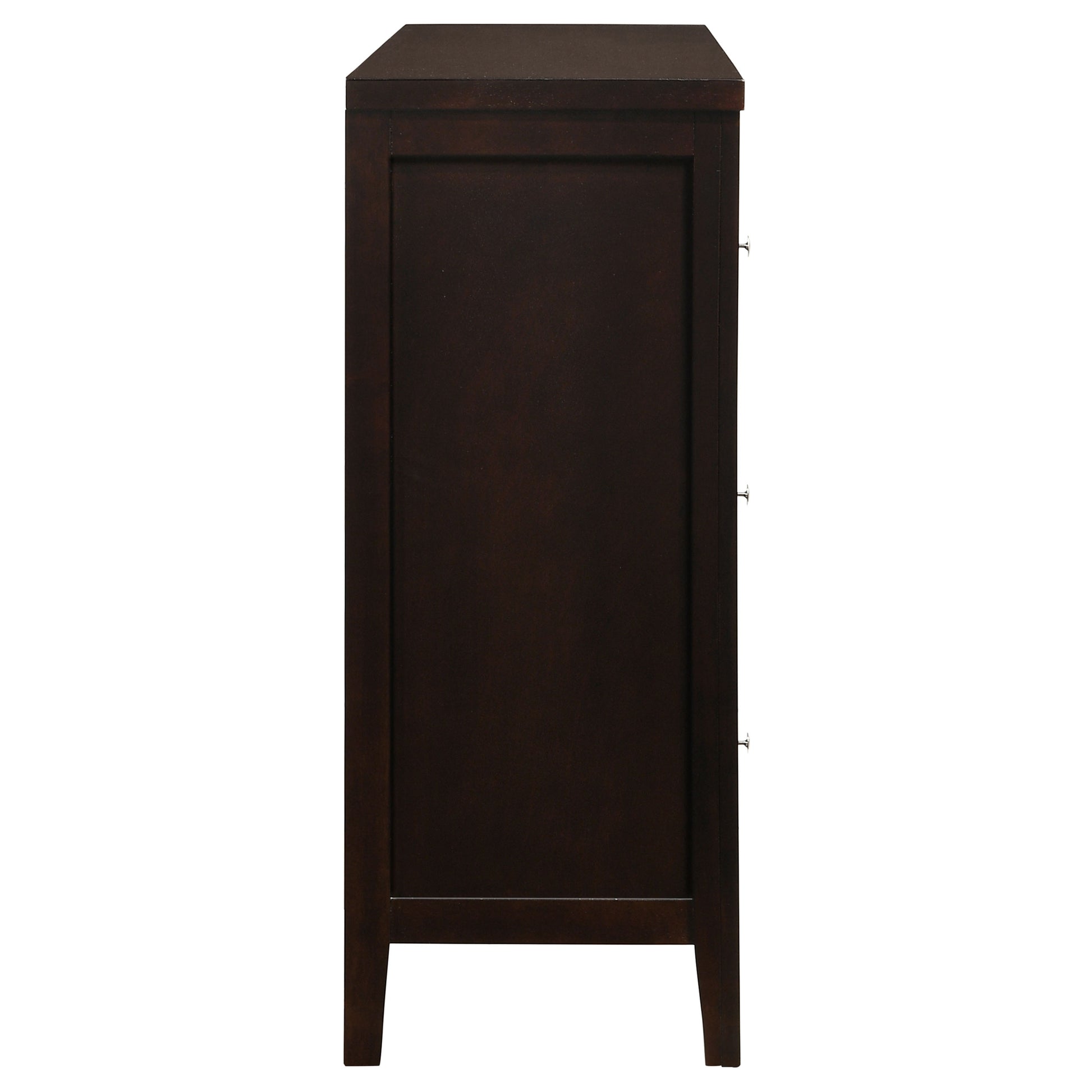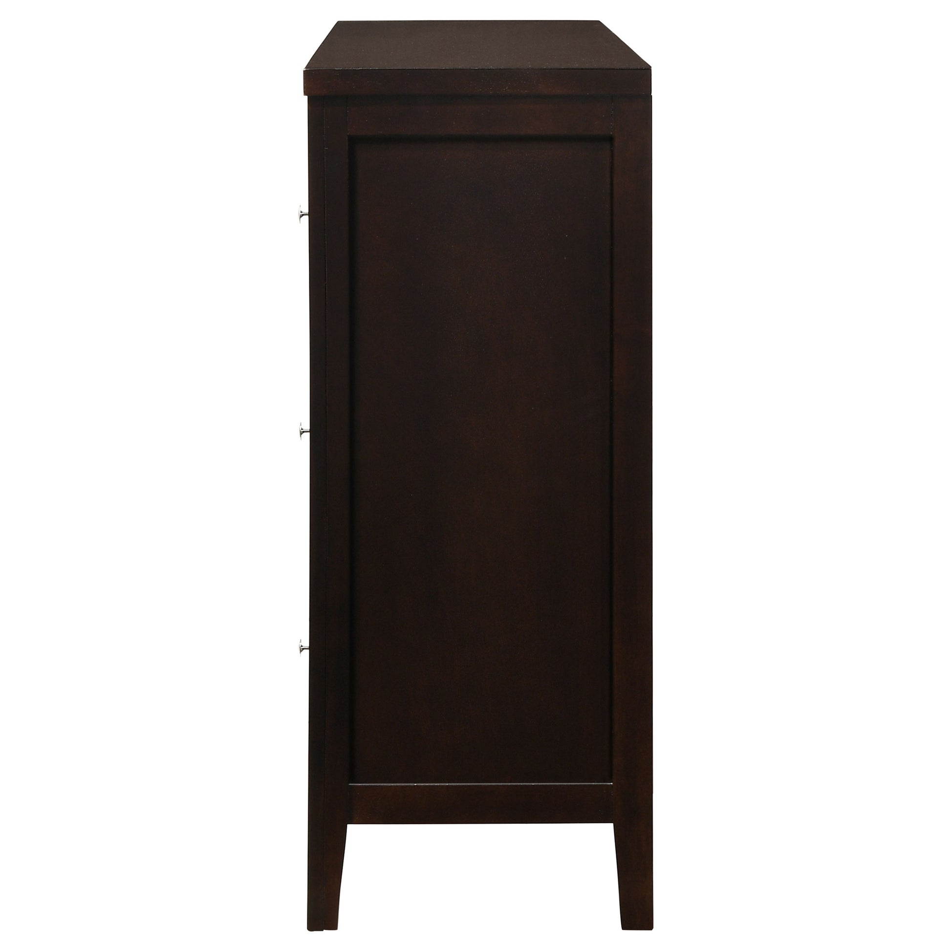 A perfectly designed dresser adds impressive character to any bedroom. This simple but classy wood dresser from the Carlton collection is a showcase piece of any master bedroom. It's impressively sized and expertly constructed with six wide drawers that hold everything from undergarments and swimsuits to an extra fleece to take the edge off an unexpectedly chilly night. Wide, roomy top holds a large mirror and decorative pieces like a vase. Wrapped in a luxuriantly warm cappuccino for the perfect ambiance.