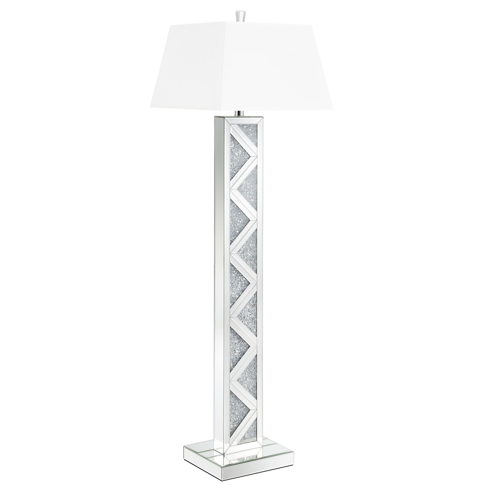Bring bold glamour to your interior with this contemporary floor lamp, featuring a mirrored base adorned with sparkling crystal-like accents in a striking geometric pattern. A crisp white fabric shade adds contrast and diffuses soft ambient light. Perfect for modern living rooms or chic bedrooms, this lamp doubles as a dazzling décor statement.