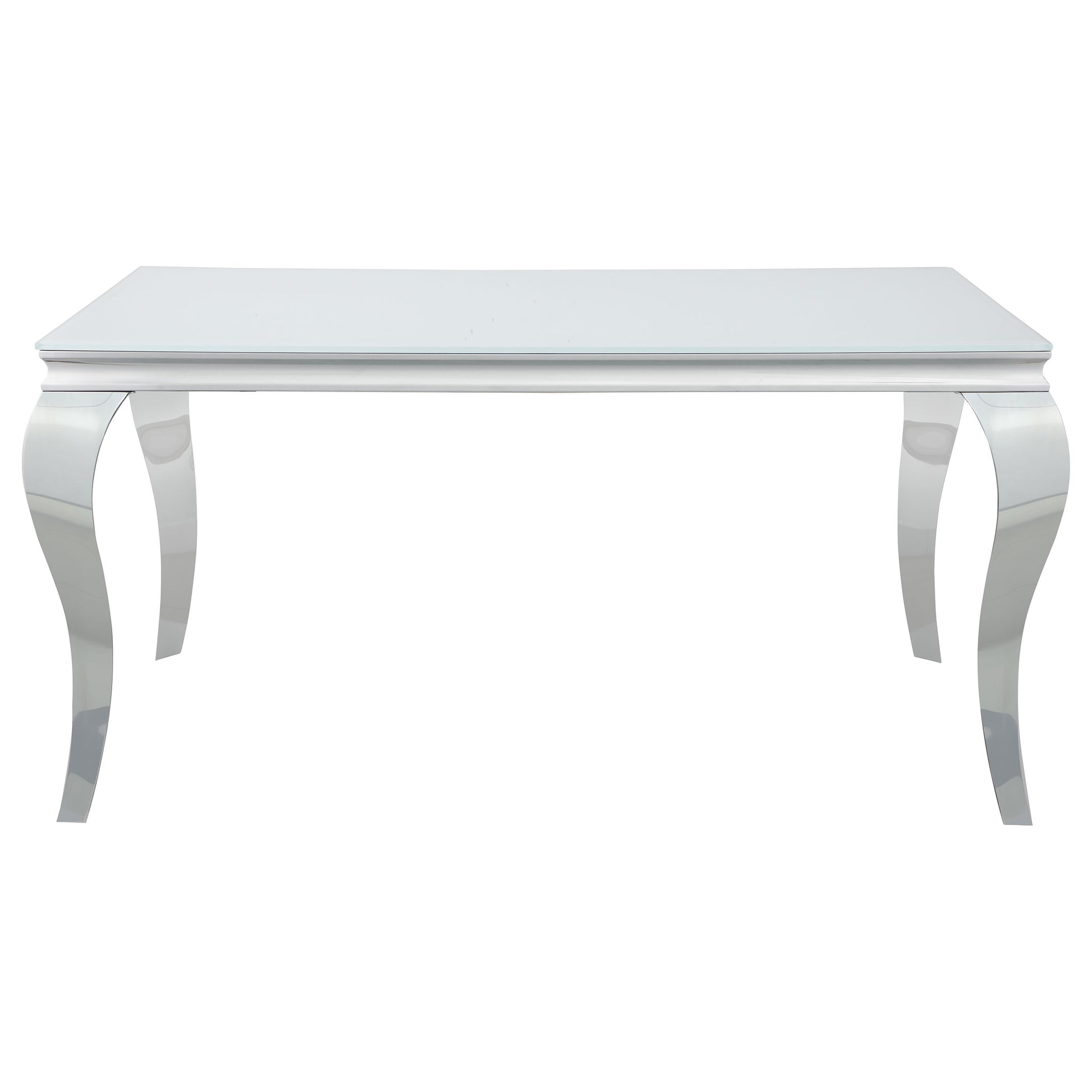 Experience the Carone dining set, seamlessly fusing modern design with timeless elements. The table's stainless steel legs bring sophistication, curving artistically and contrasting the 12mm tempered glass top with beveled edges. Hosting formal feasts is effortless on this table. Complementing this, the elegant dining chairs exude sleek sophistication. Their chrome-finished legs, including creatively curved front legs, offer a captivating shine. Luxe velvet upholstery graces the seats, available in various colors to personalize your space. Elevate your dining area with the Carone collection, where innovation meets opulence.