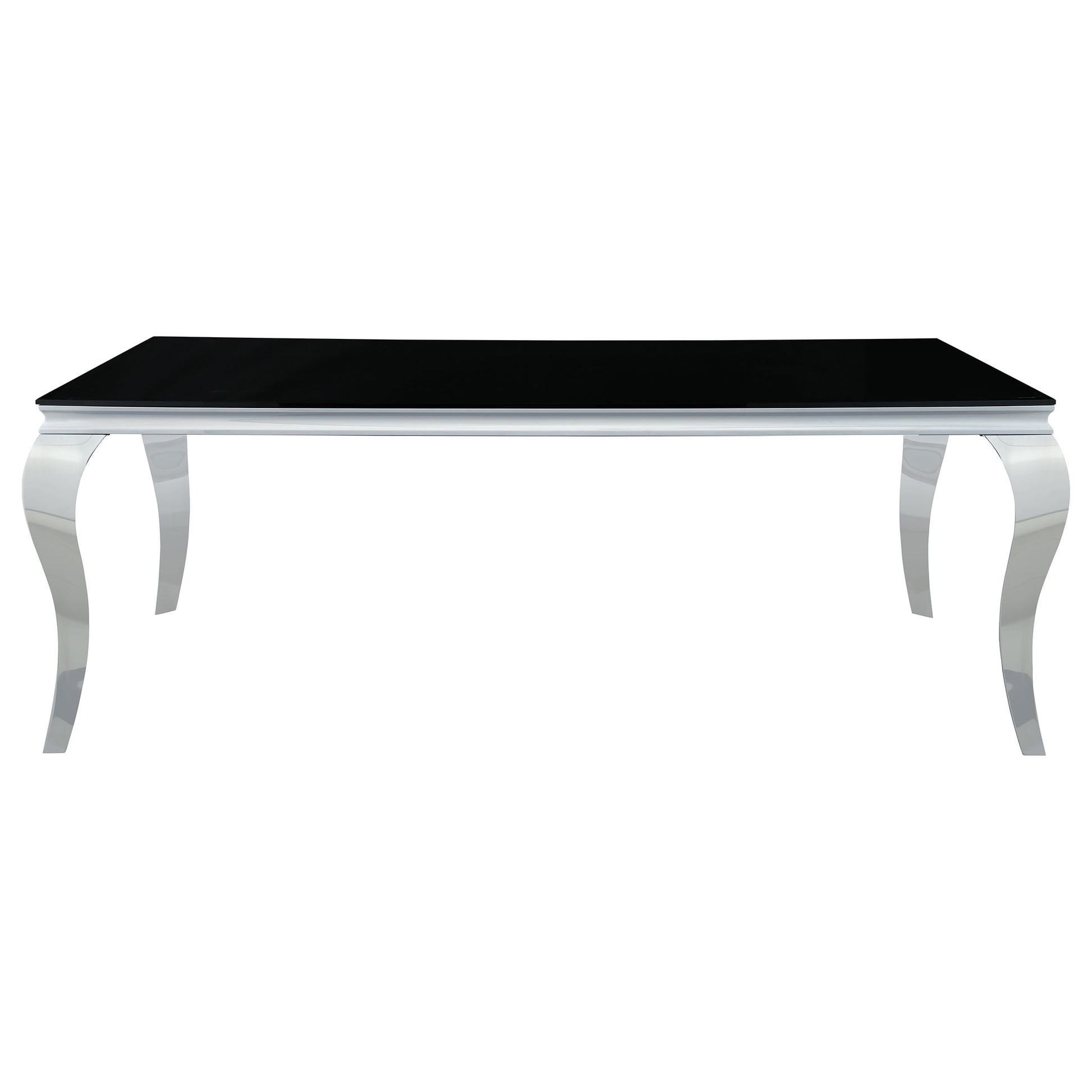 Experience the Carone dining set, seamlessly fusing modern design with timeless elements. The table's stainless steel legs bring sophistication, curving artistically and contrasting the 12mm tempered glass top with beveled edges. Hosting formal feasts is effortless on this table. Complementing this, the elegant dining chairs exude sleek sophistication. Their chrome-finished legs, including creatively curved front legs, offer a captivating shine. Luxe velvet upholstery graces the seats, available in various colors to personalize your space. Elevate your dining area with the Carone collection, where innovation meets opulence.