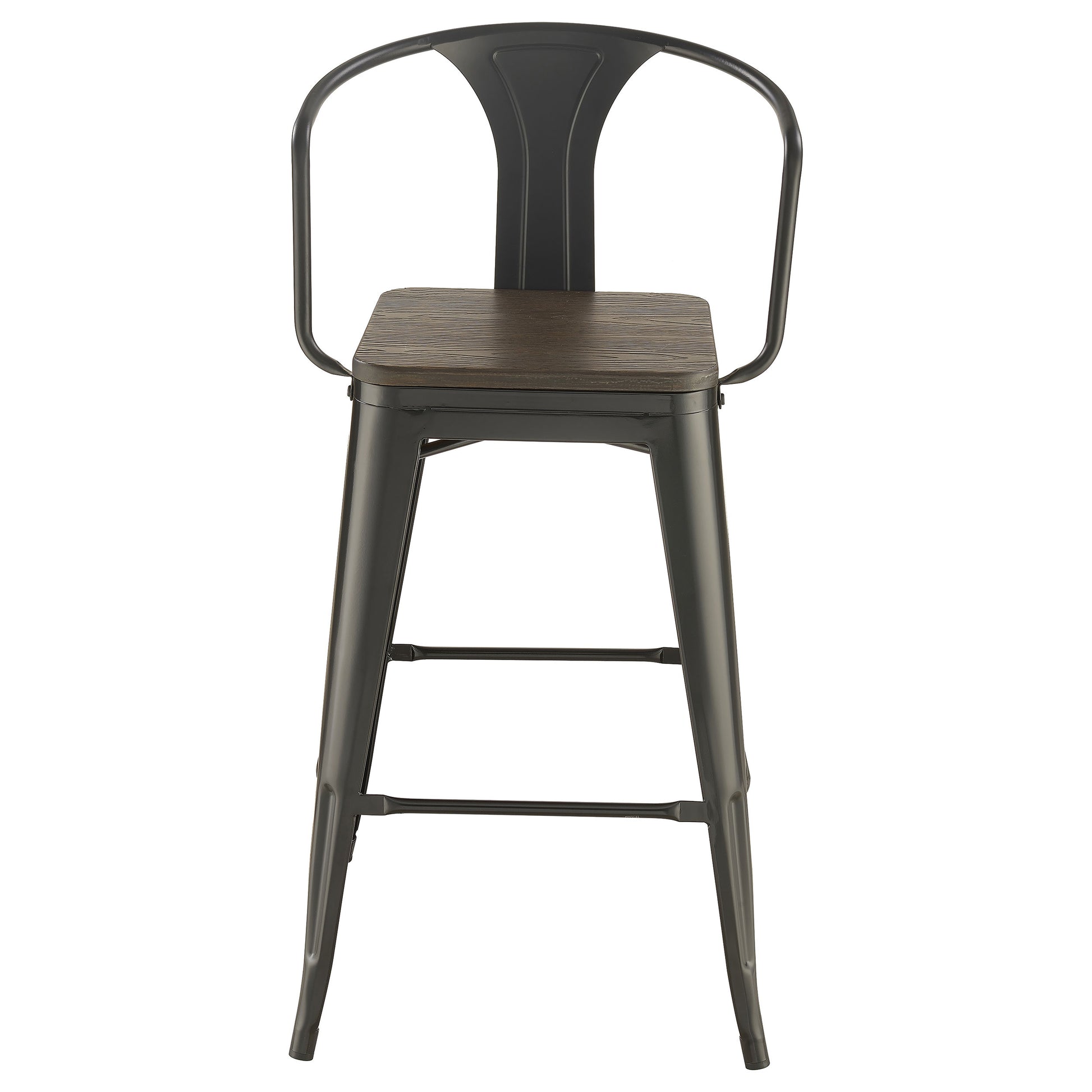 Add a touch of industrial flair to your bar or kitchen area with this Tolix style bar chair, featuring a blend of metal and wood-inspired textures. The chair boasts a sturdy metal frame with a sleek matte black finish, paired with an embossed solid bamboo seat in a dark elm finish. Its curved backrest and integrated armrests provide ergonomic support, allowing for relaxed seating during meals or gatherings. With its minimalist design and durable construction, this chair is perfect for both home and commercial settings. The combination of rustic wood tones and modern metal accents makes it a versatile addition to any decor, offering both comfort and style.