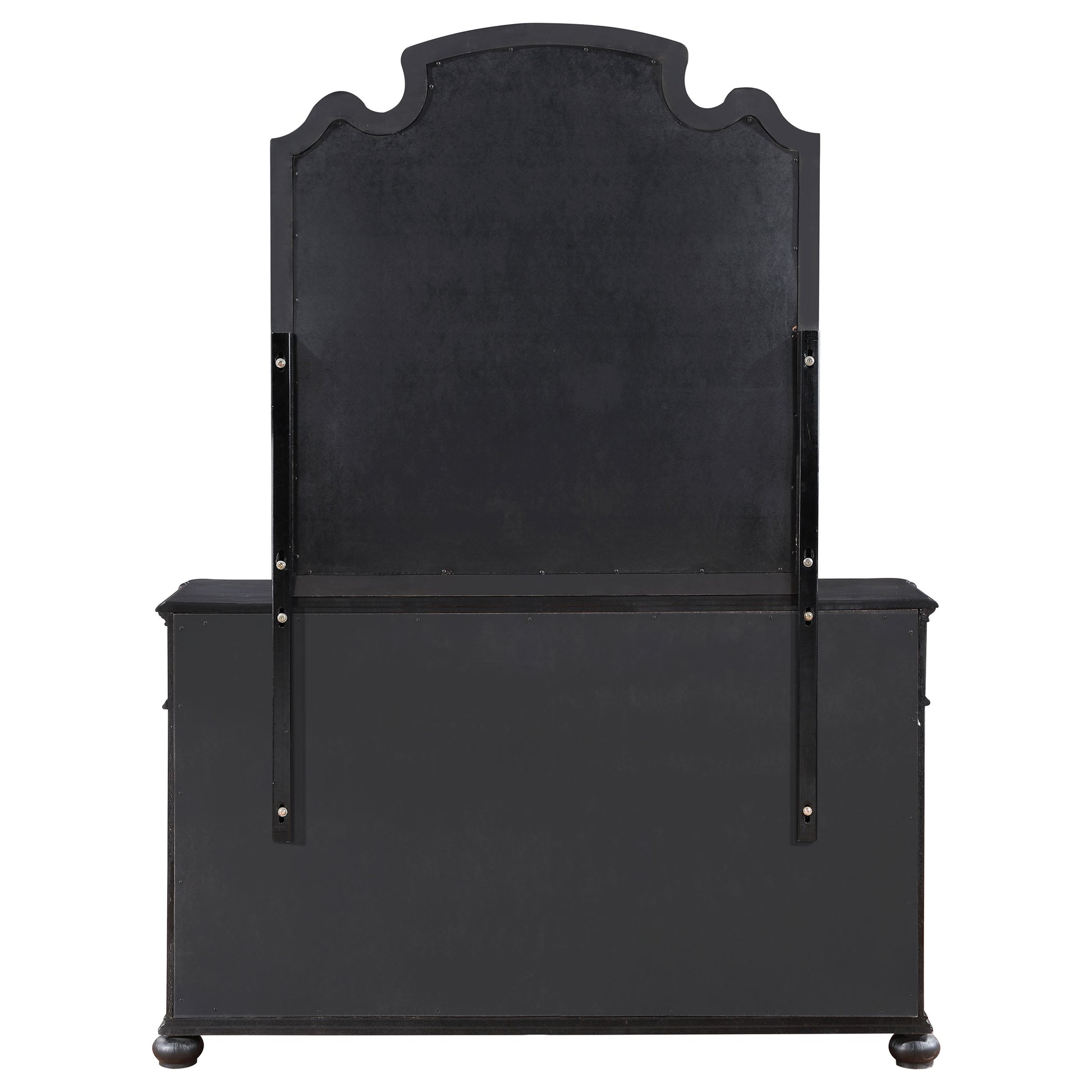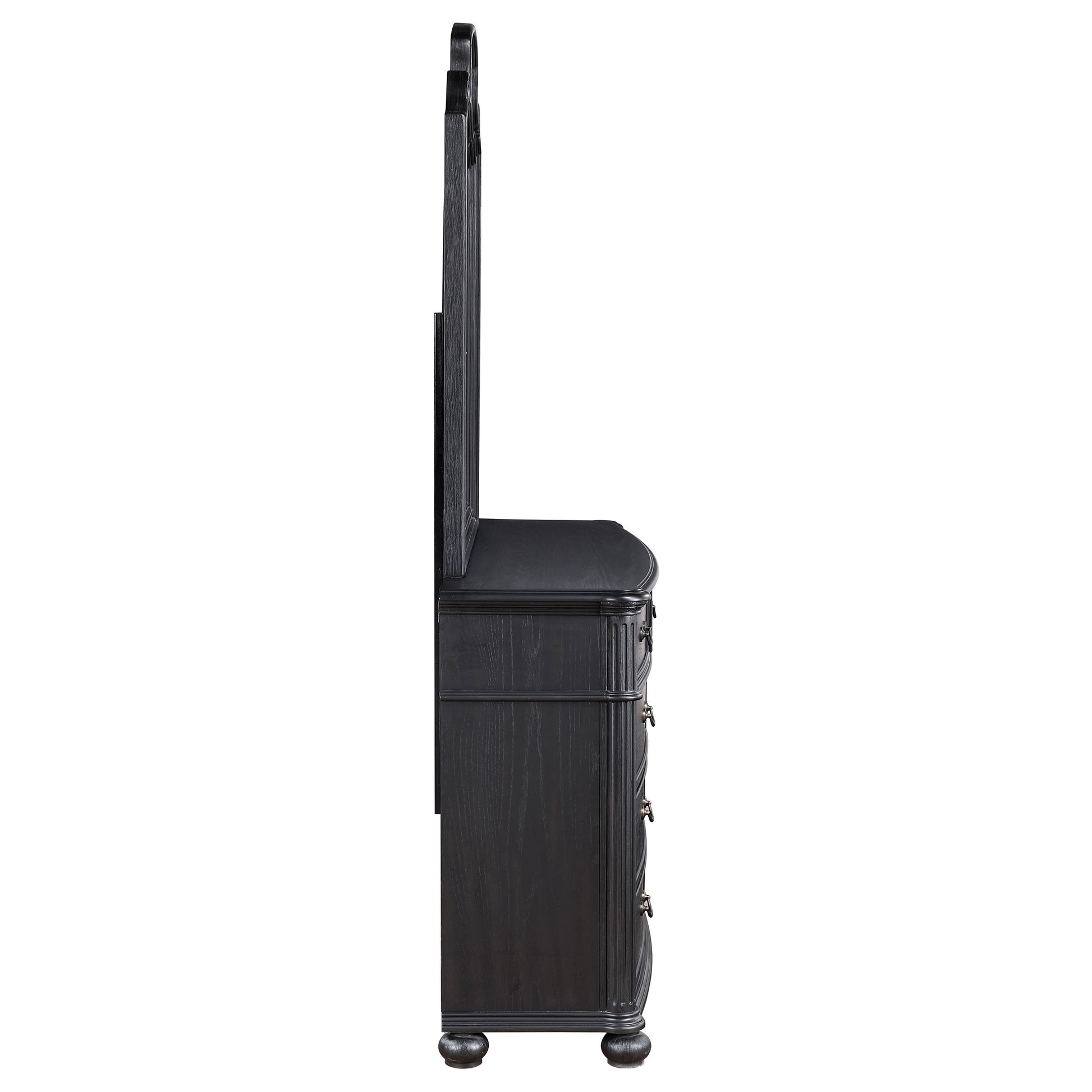 Transform your bedroom into an enclave of classic elegance with this nine-drawer dresser. The sophisticated design features felt-lined top drawers to protect your jewelry and cherished items, while the remaining drawers glide smoothly for effortless organization. With a substantial black finish and ornate hardware, this piece is both a statement of style and a haven of storage. Paired with it is the elegant dresser mirror, framed in matching dark tones, which amplifies beauty and light, enhancing your dressing experience in an atmosphere of refined luxury.