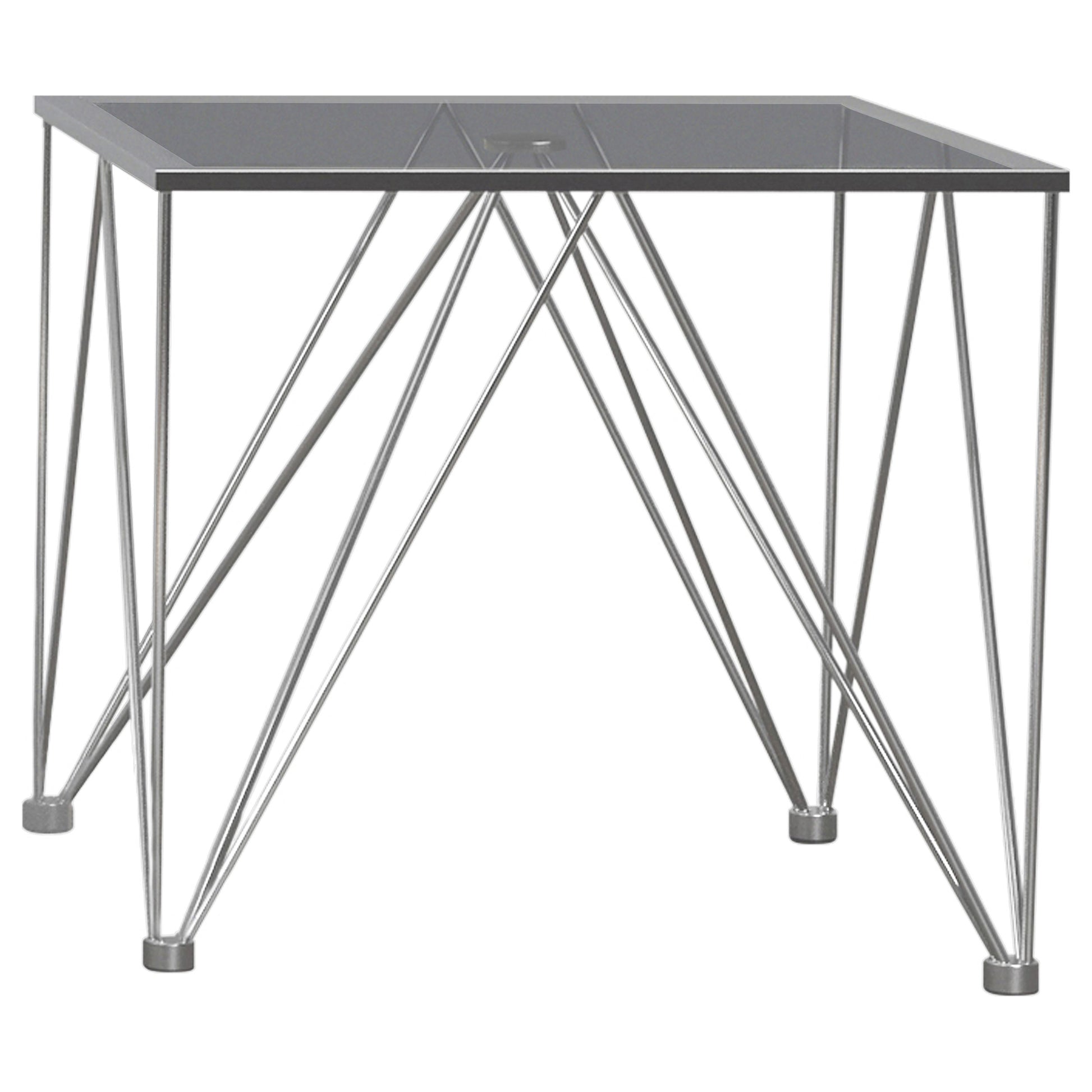 Add some pizzazz to your living room decor. This glass top end table has a unique, modern design that's sure to impress your guests. The sleek, metal base is electroplated in chrome for a pleasing pop of polish. A translucent, grey glass surface tops it off with strength, sturdiness, and elegant allure. Clean lines and sharp angles add a fresh, modern edge to this contemporary piece.