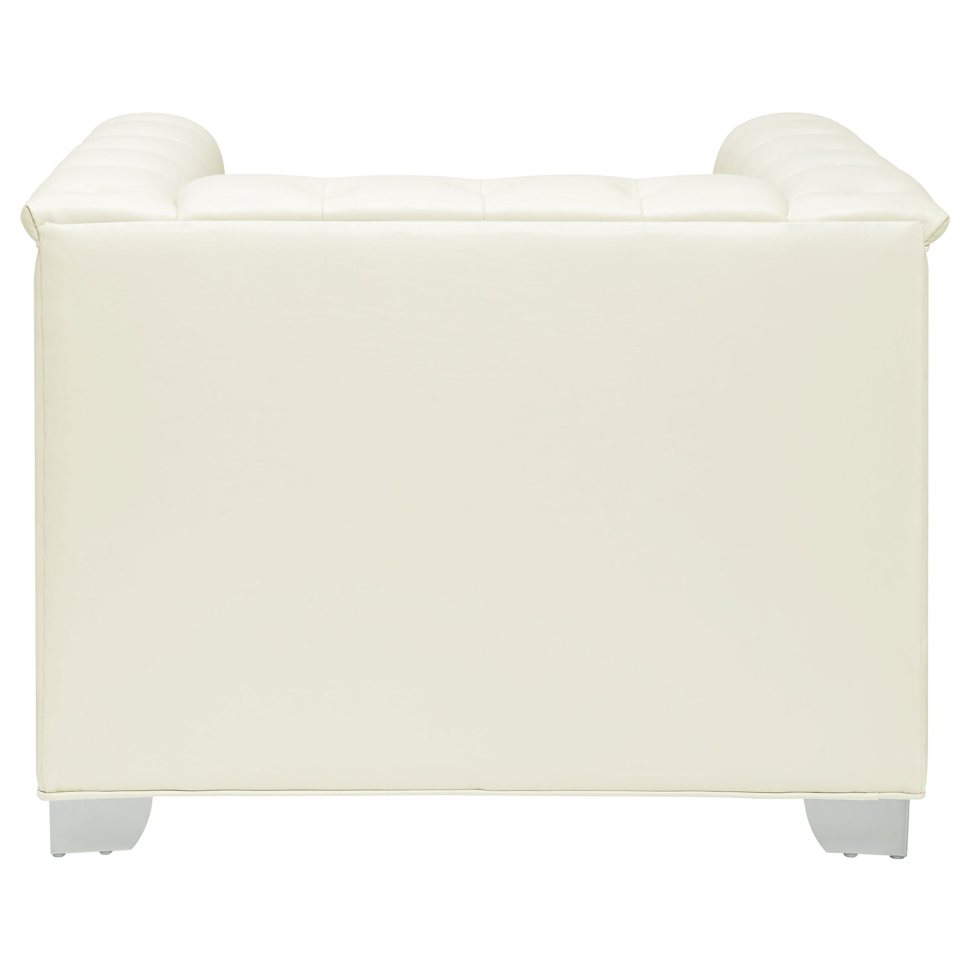 Make the most of a mixed motif. A casual space comes to life with the glamorous ambiance of this side chair. Enjoy a classic tuxedo silhouette with a low profile. Deep button tufting over quilted pearl white upholstery stylizes and refreshes any room aesthetic. Heavy duty chrome doorknocker handles and chrome legs add finishing touches that up the ante on charm.