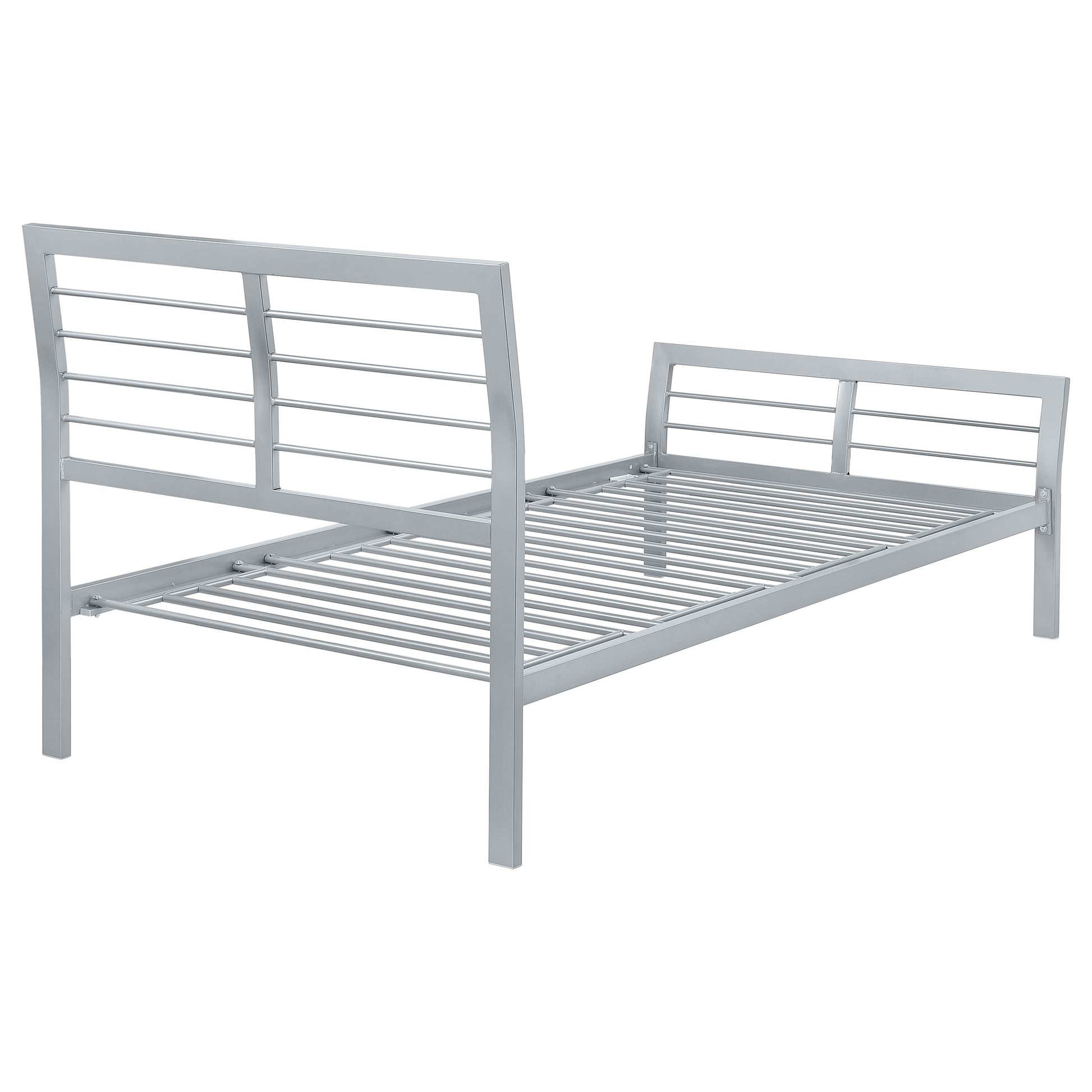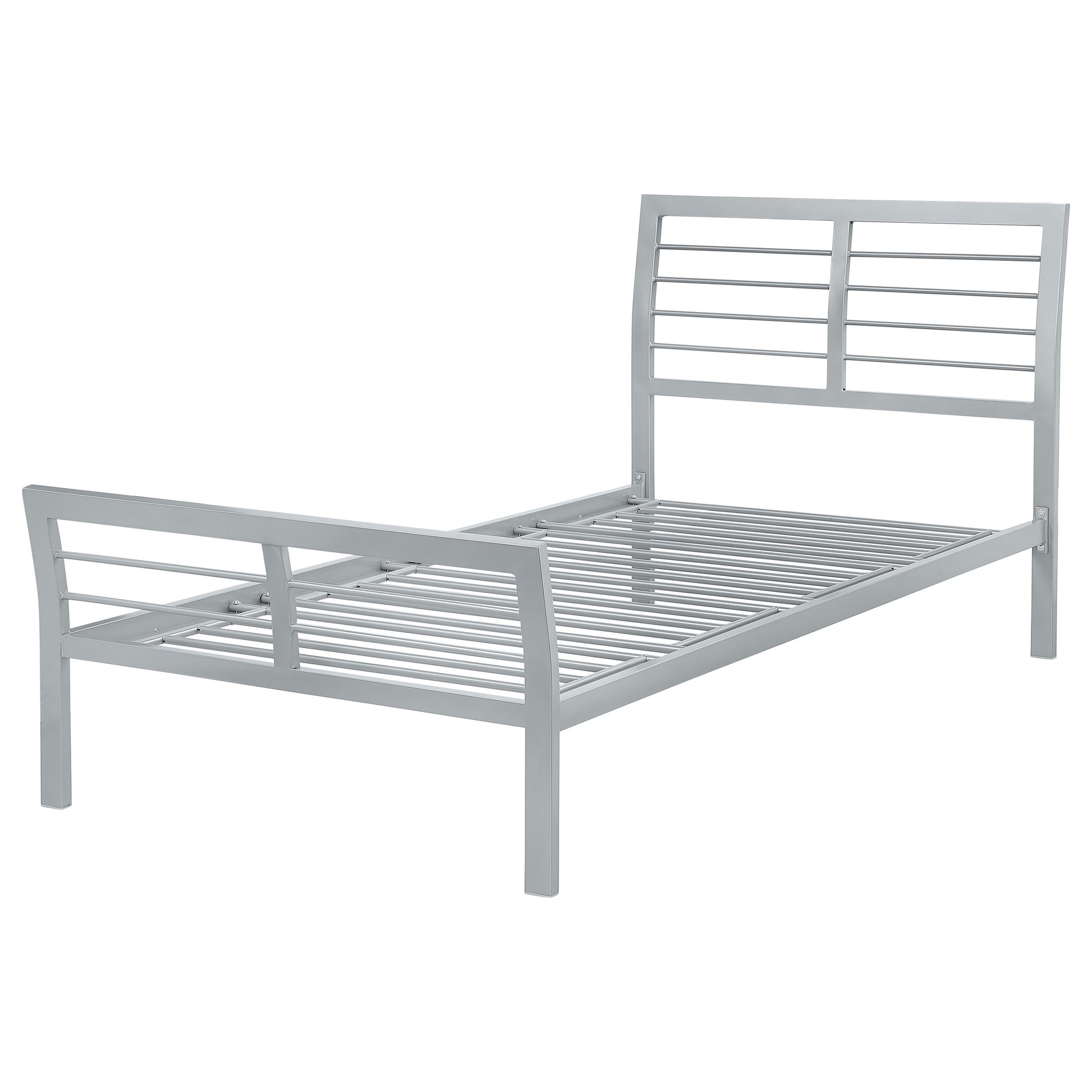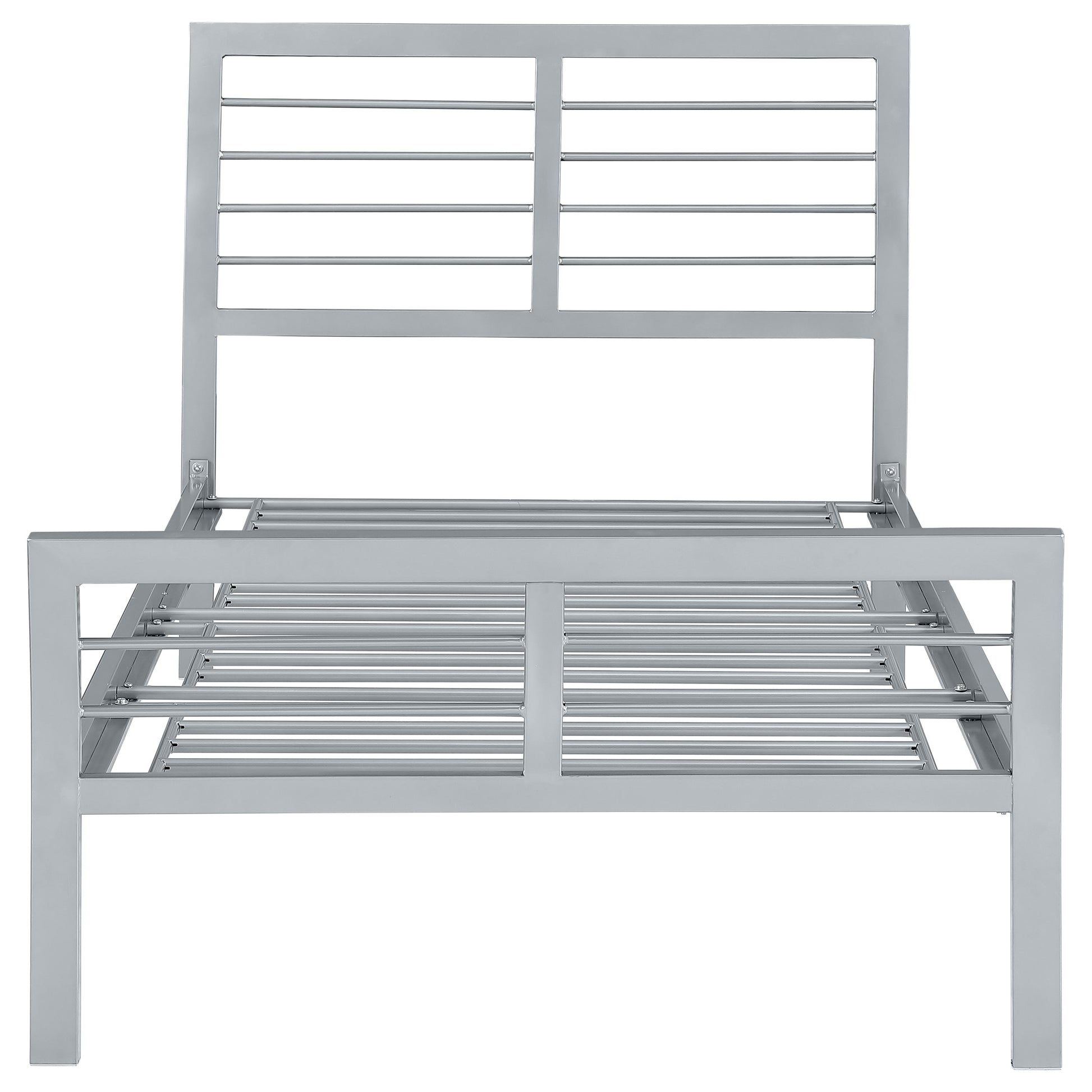 This metal bed has a modern allure that's sure to please. It features a high headboard and low footboard built with crisp horizontal bars. It has a simple yet sophisticated appeal in its relaxed, attractive styling. The metal is finished in a handsome silver that's both understated and chic. With its clean lines and casual design, this bed is easily suited to blend with any bedroom decor.