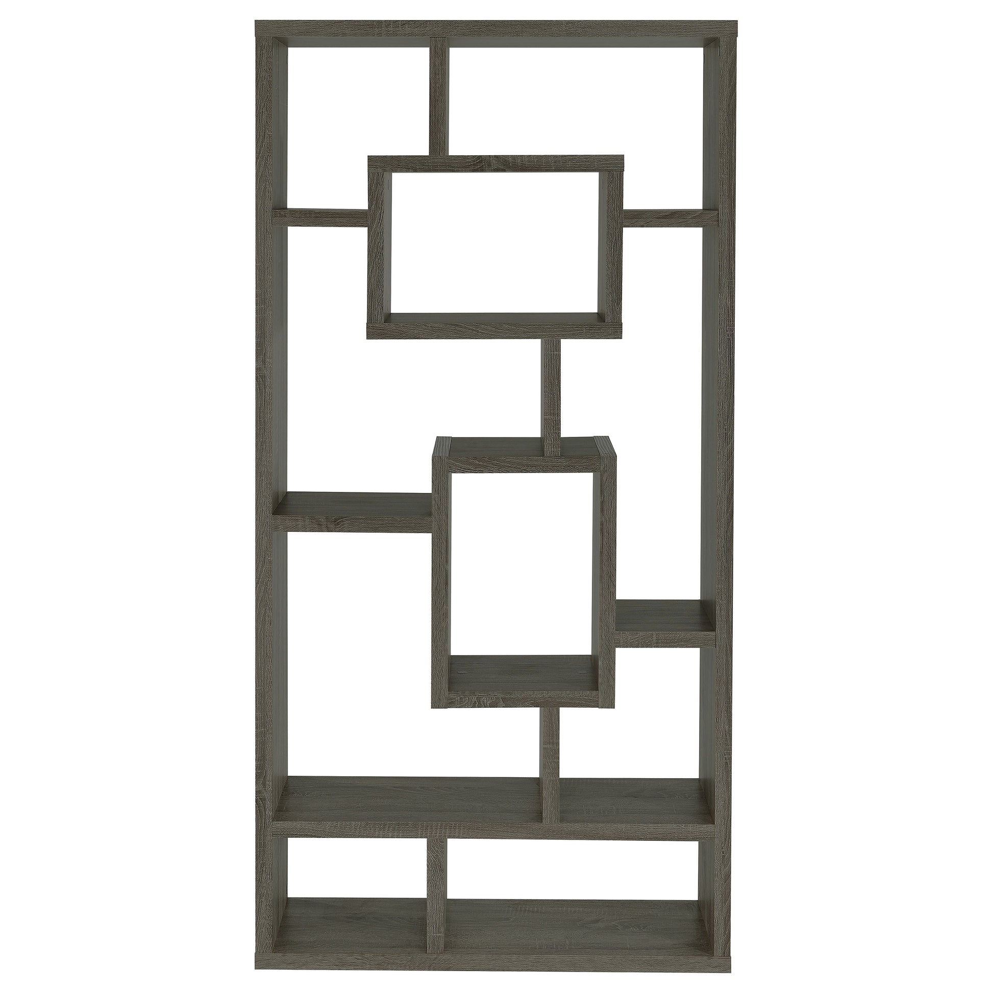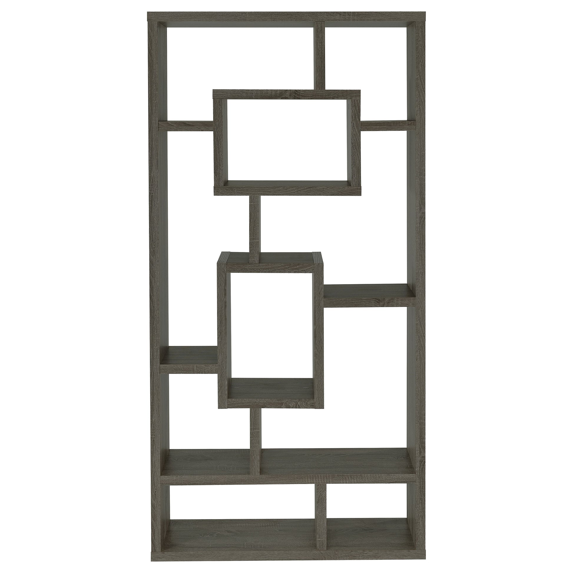 A whimsical silhouette captures attention as it offers essential space for display. This fun bookcase presents a puzzle-like profile with exceptional charm. Ten shelves in a variety of configurations provide plenty of room to show off decor and photographs, as well as books and planted greenery. Enjoy a sleek weathered grey finish that enhances its contemporary creds. This modern bookcase makes an excellent companion to home office decor.
