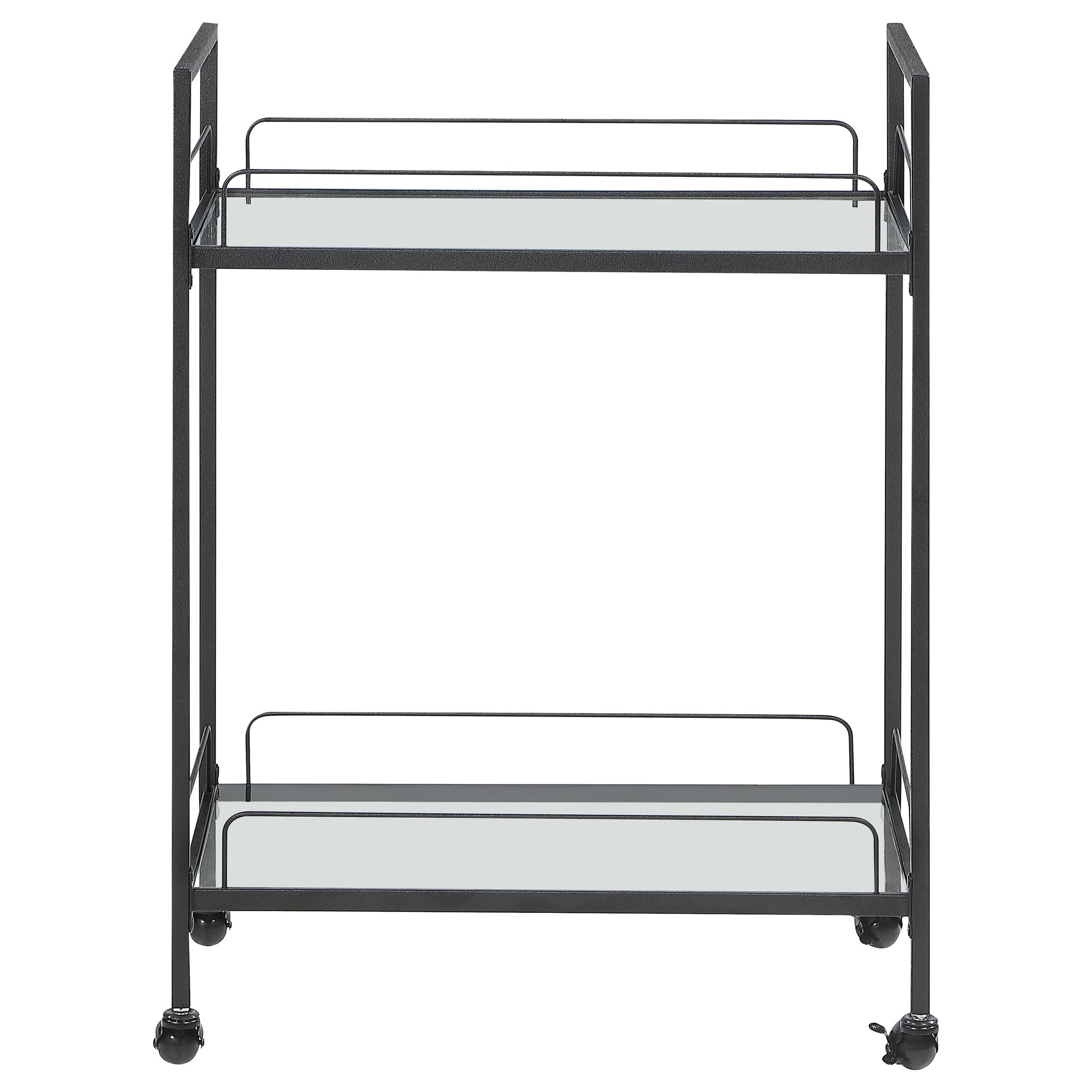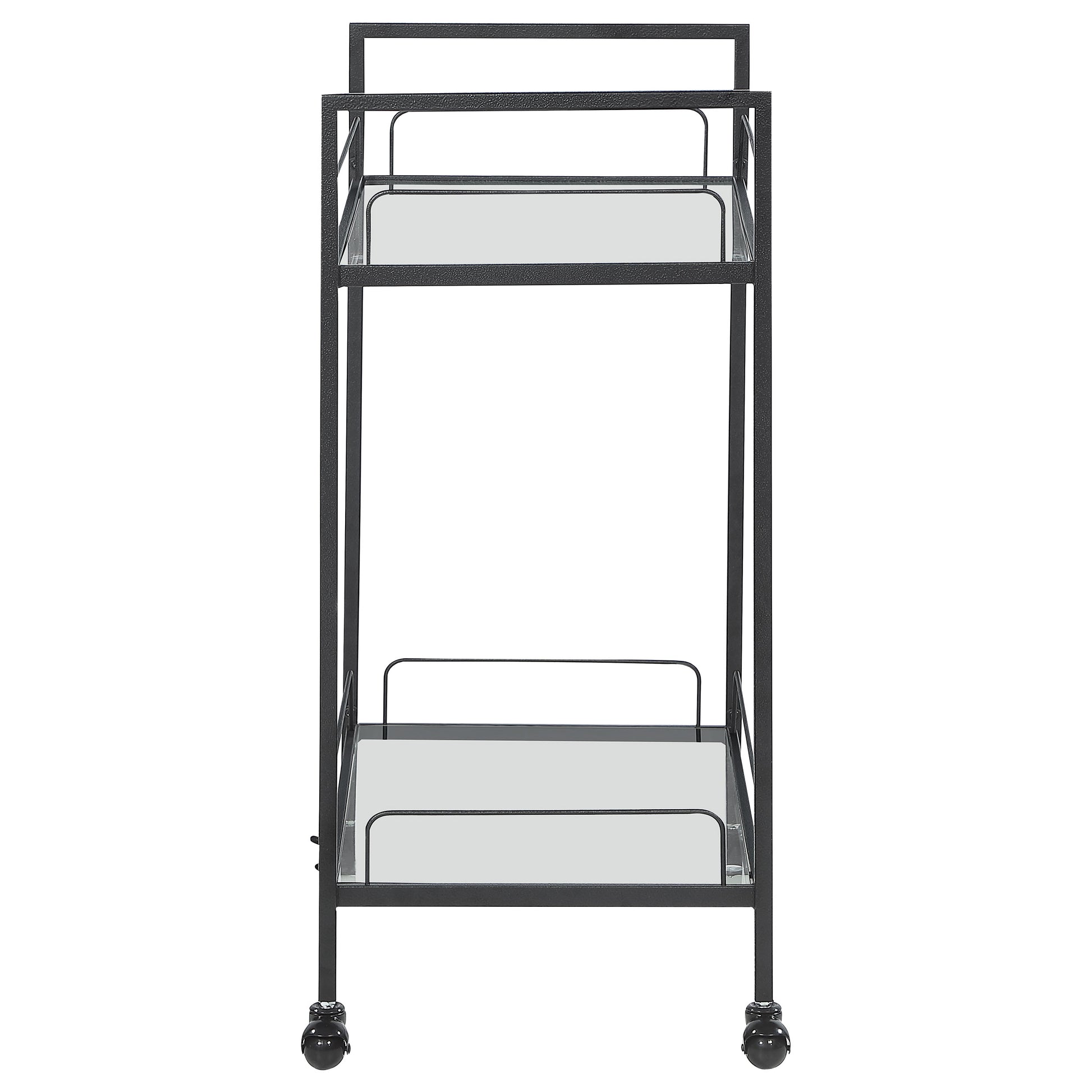 Minimal, clean lines create a versatile and sleek aesthetic to this contemporary serving cart. Built with a slim metal frame in a black hammer tone powder coated finish with caster wheels, this serving cart welcomes glassware, accessories and snacks to be smoothly transported to an entertaining area for guests and visitors. Stacked clear tempered glass shelves showcase stemware and favorite vintages to guests for their personal selection. With raised edges, you can rest easy knowing everything stays in place safely. Glide this serving cart into your living room for small get-togethers or keep it in a compact apartment as a multifunctional bar cart.