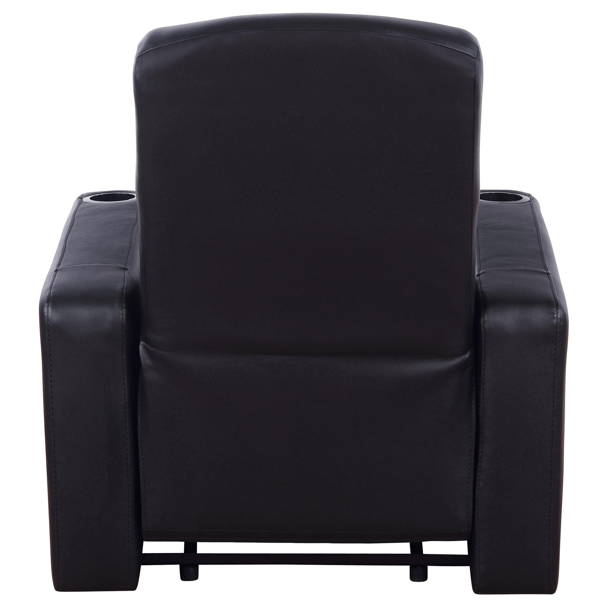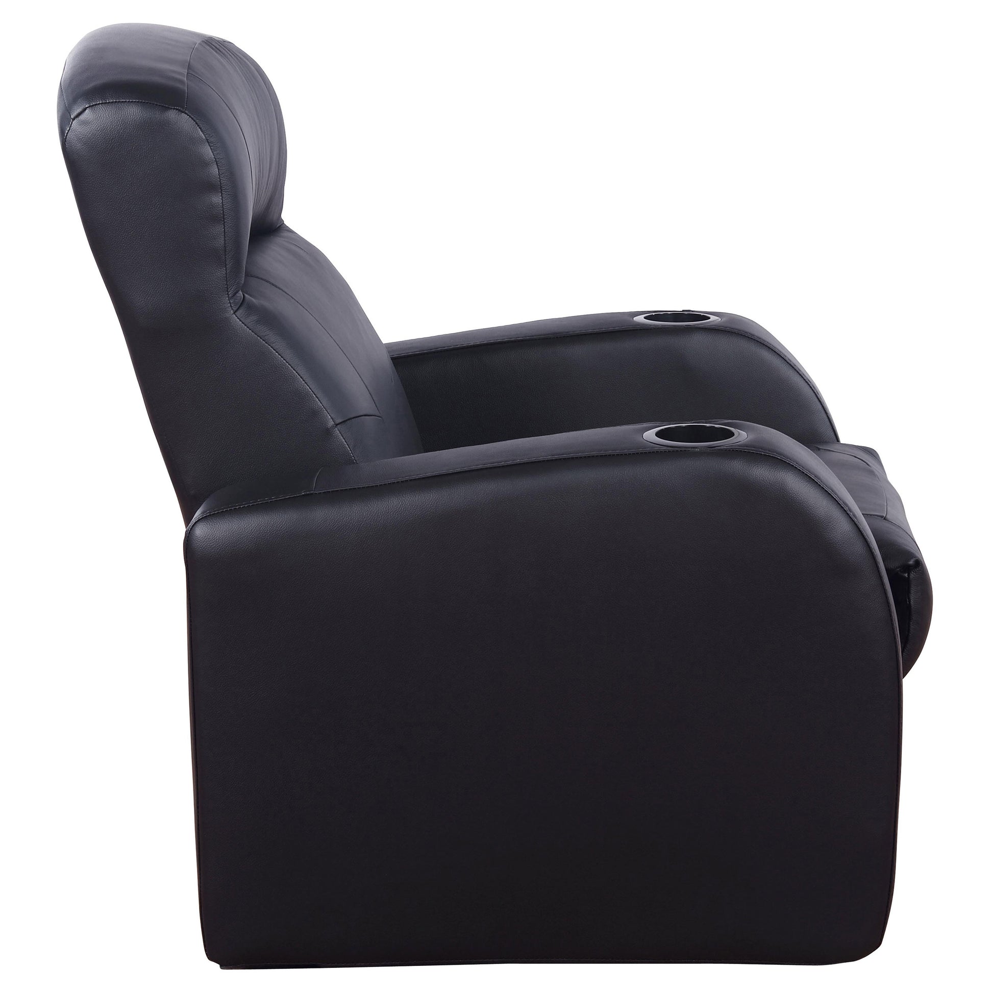 Sophisticated and modern, this sleek black recliner is perfect for a home theater. Designed with comfort in mind, the seat features a high back cushions and low arms. The rounded edges bring a soft feel to the sleek lines. Build a set of side by side recliners for family movie night or to fill any size theater room. Stitched details add an elegant touch.